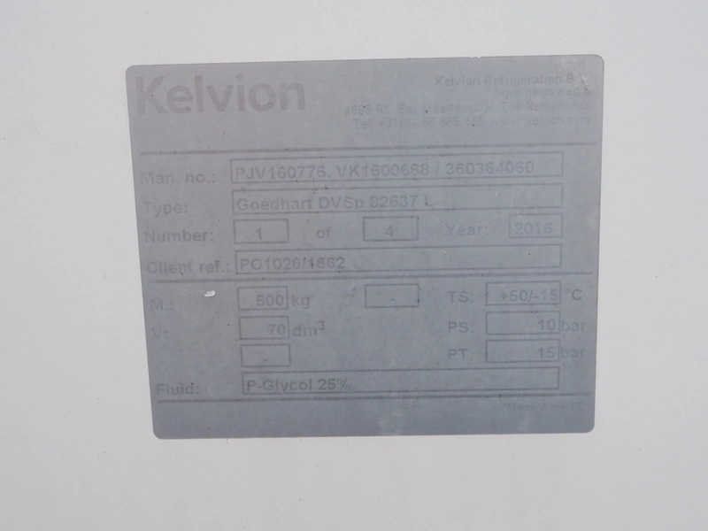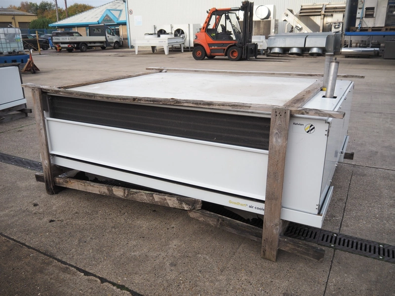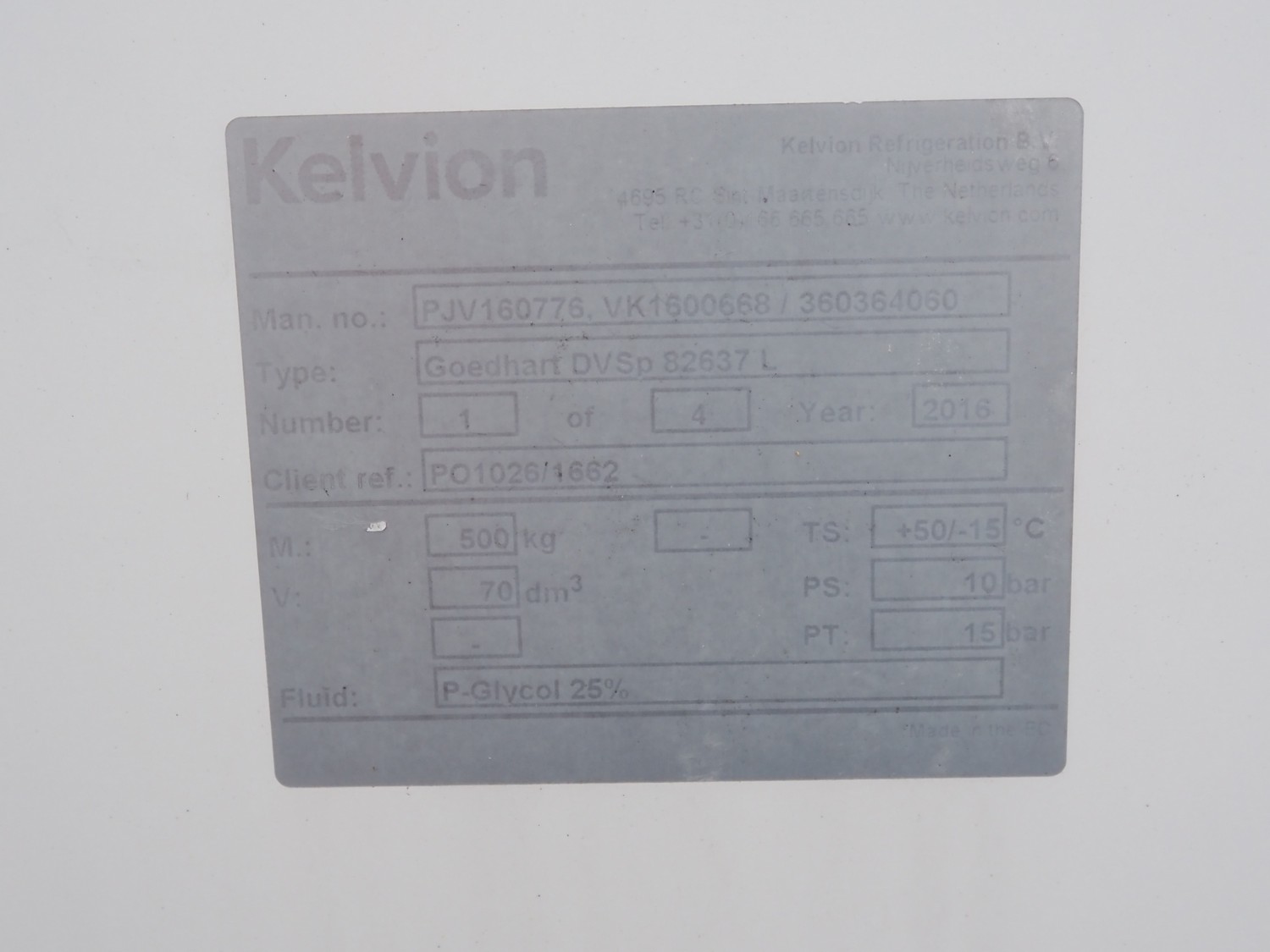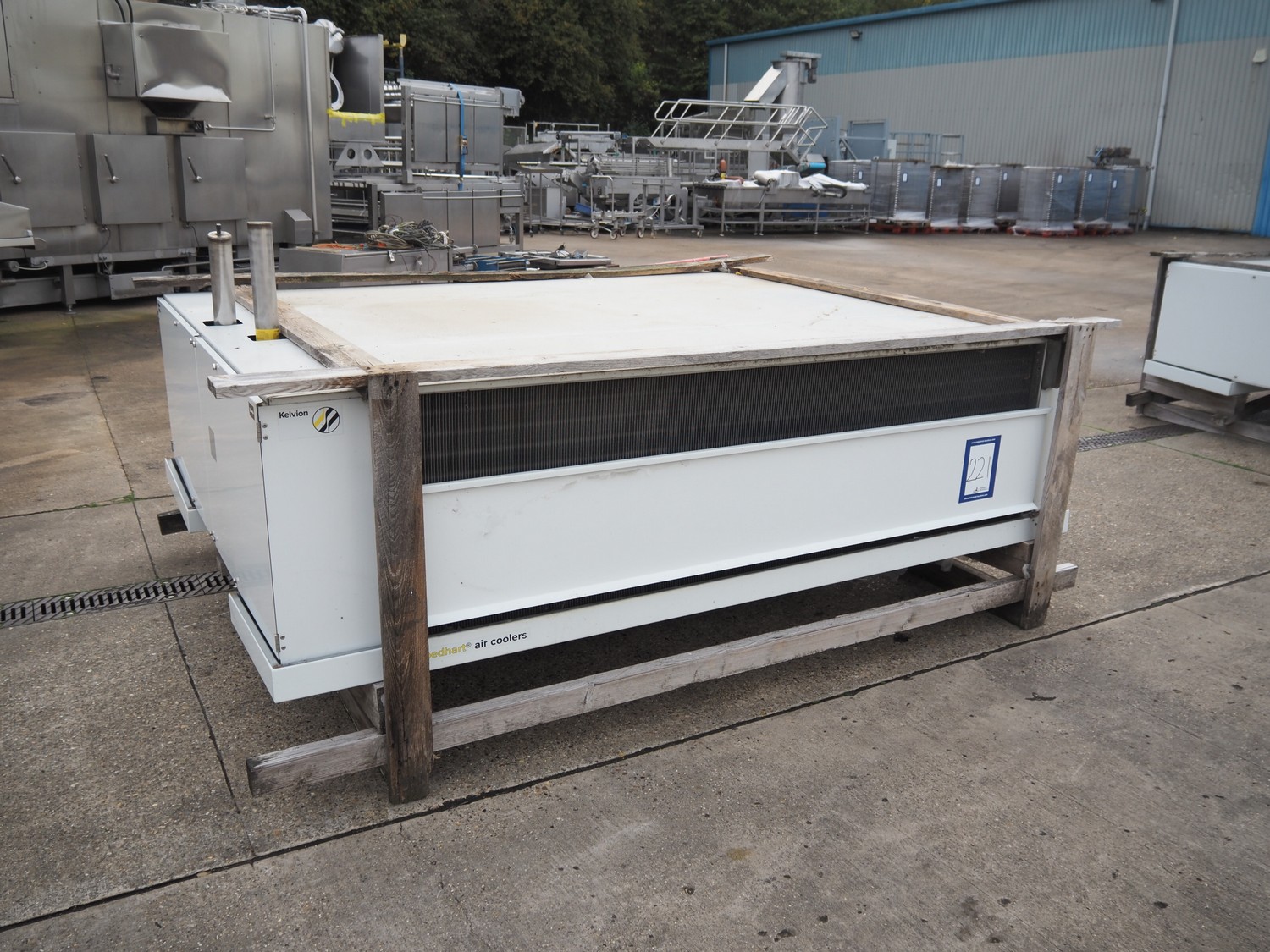 Kelvion Refrigeration B.V. evaporator, type: Goedhart DVSp 82637L, serial number: PJV160776. VK1600668/360364060, year of construction: 2016, TS: +50/-15 °C, PS: 10 bar, PT: 15 bar, volume: 70 dm³, weight: 500 kg, 2 fans, dimensions: 2500 mm x 1850 mm x 1250 mm.