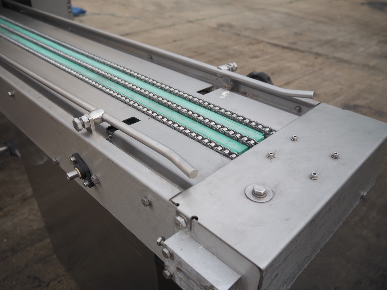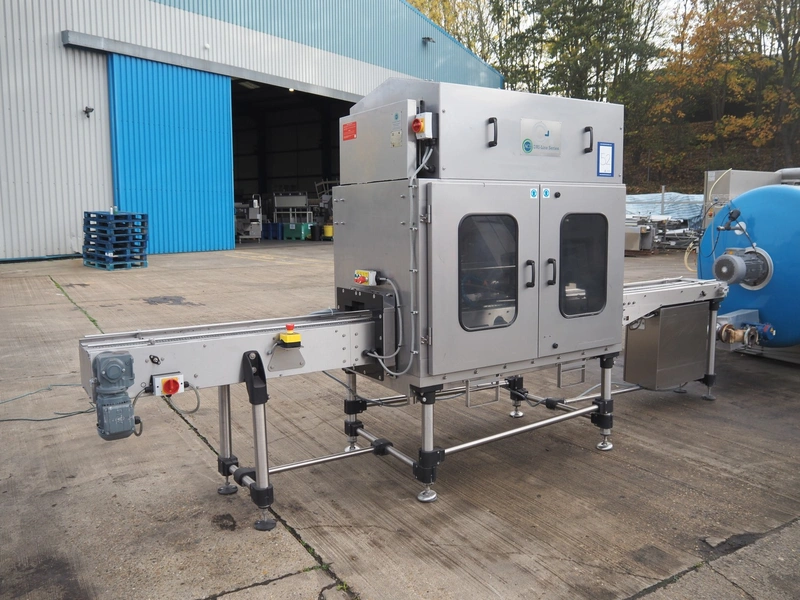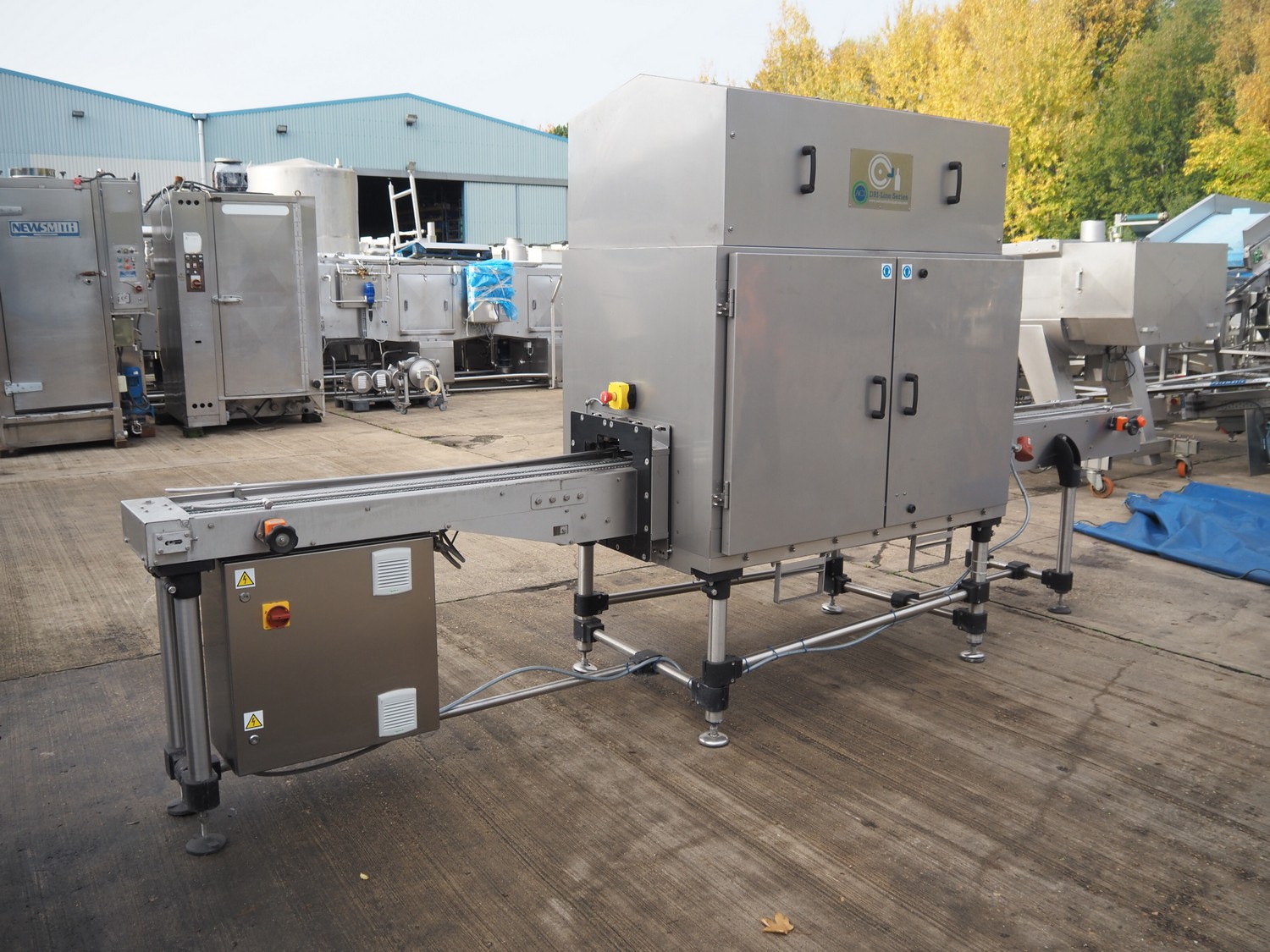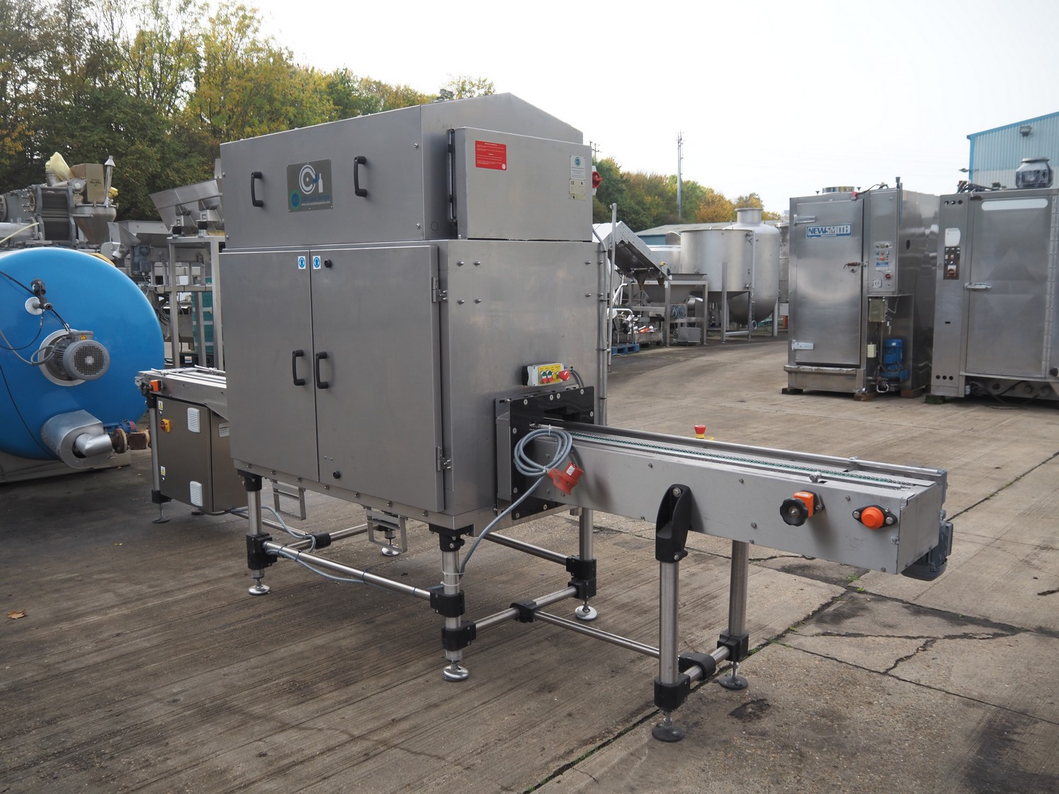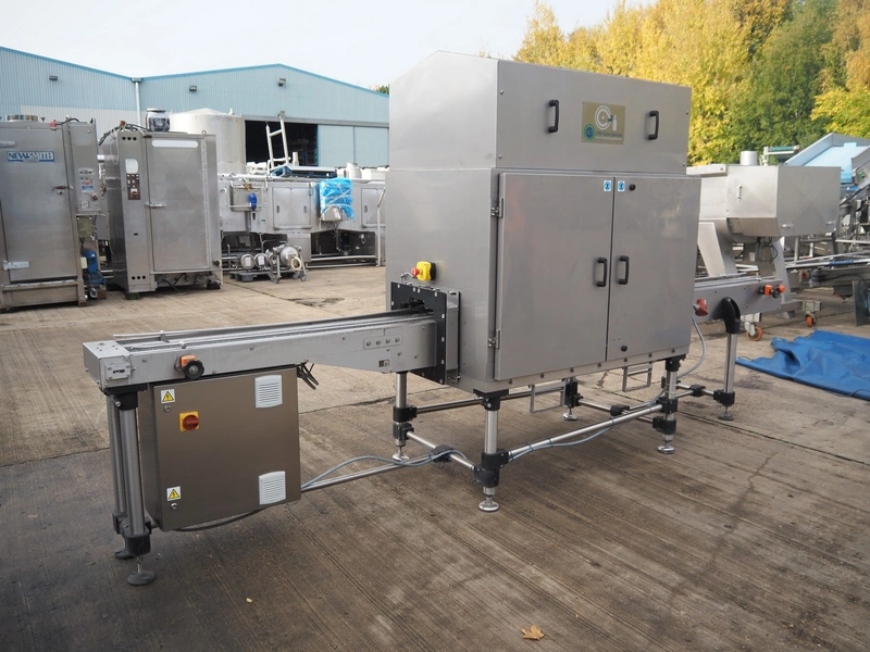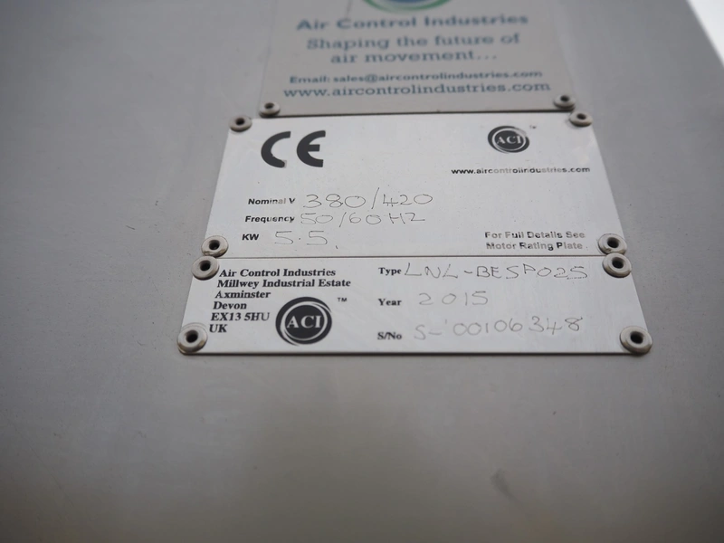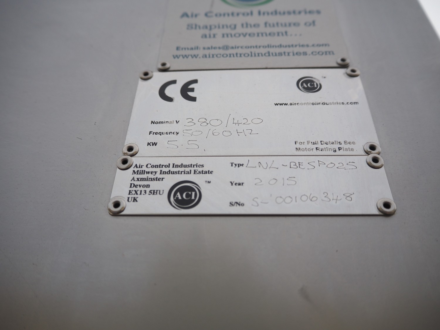 Air Control Industries drying tunnel, type: LNL-BESP025, serial number: S-00106348, year of construction: 2015, 380/420 V, 50/60 Hz, 5.5 kW, s/s chain belt, belt width: 160 mm, clearance: 300 mm x 100 mm, blower width: 250 mm, total dimensions: 4550 mm x 1050 mm x 2150 mm.