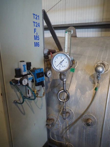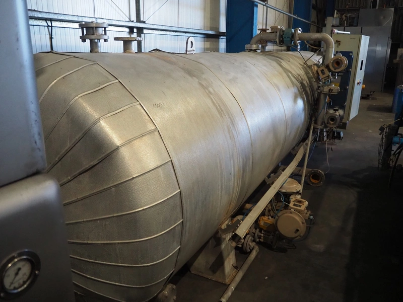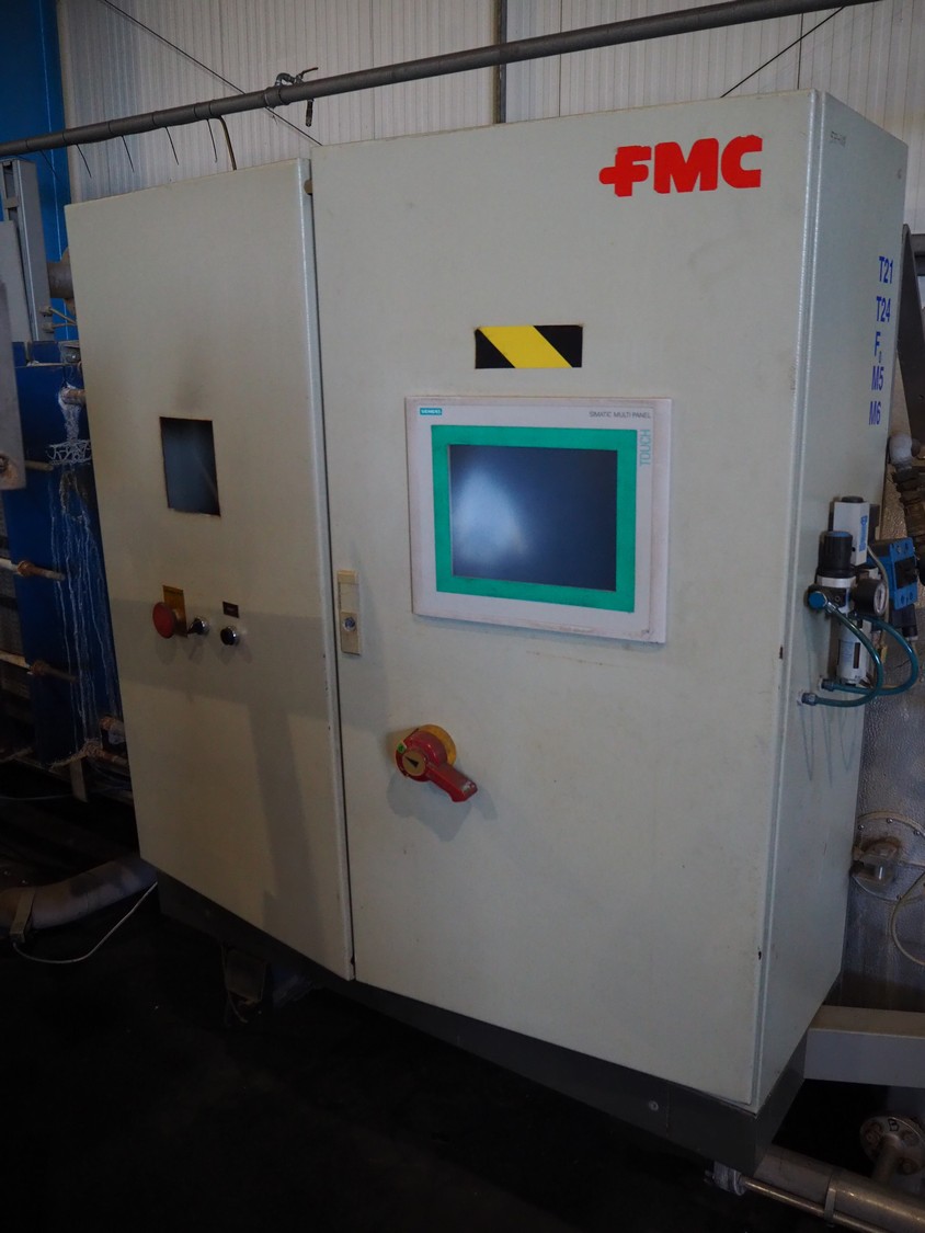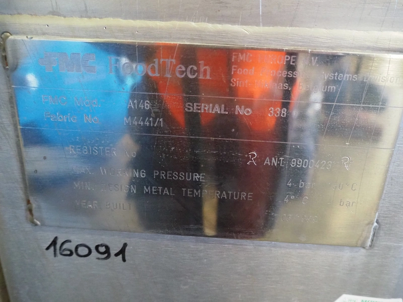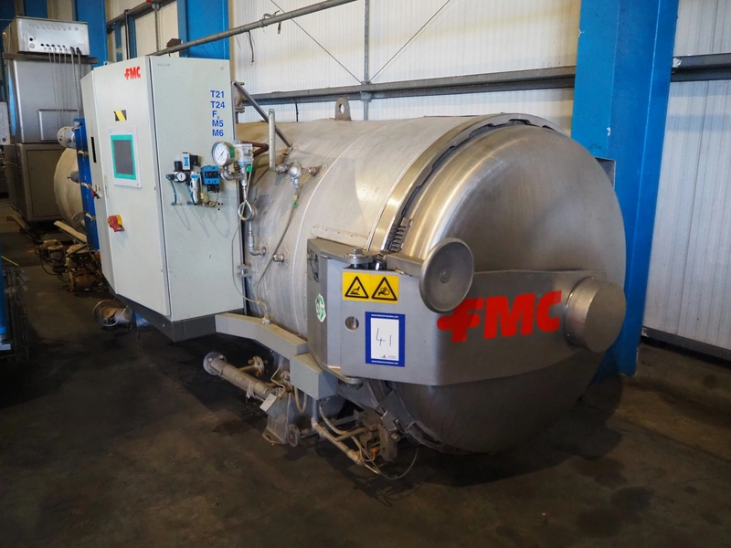FMC FoodTech autoclave fot 6 baskets, model: A146, serial number: 338, year of construction: 06/1999, maximum working pressure: 4 bar and 150°C, minimum design metal temperature: 4°C and 4 bar, dimensions baskets: (6x) 1000 mm x 1000 mm x 940 mm, total dimensions: 6900 mm x 2000 mm x 2000 mm.