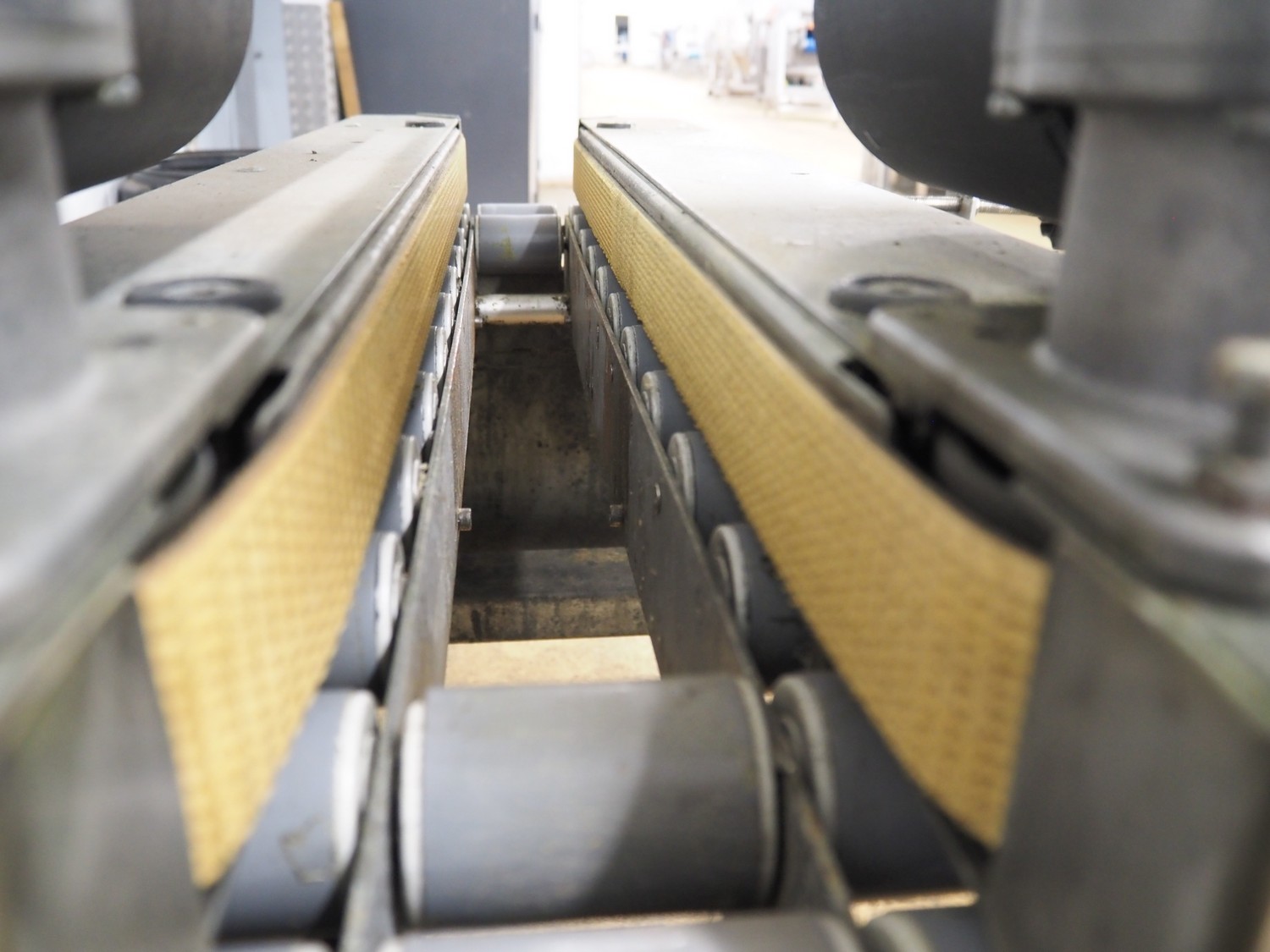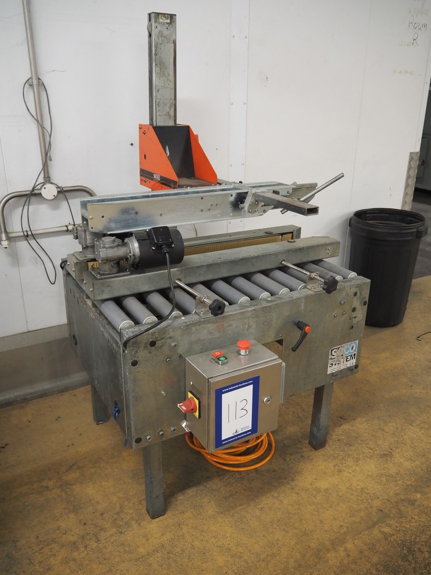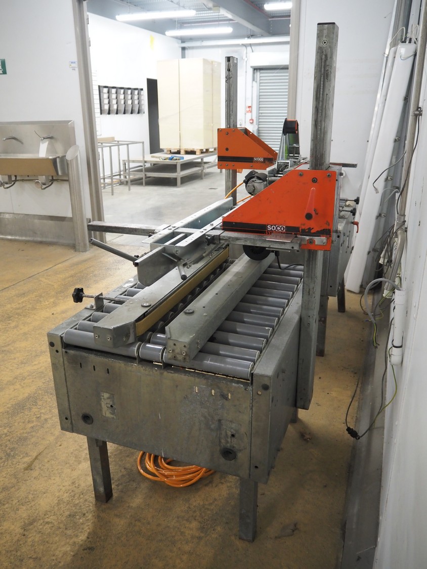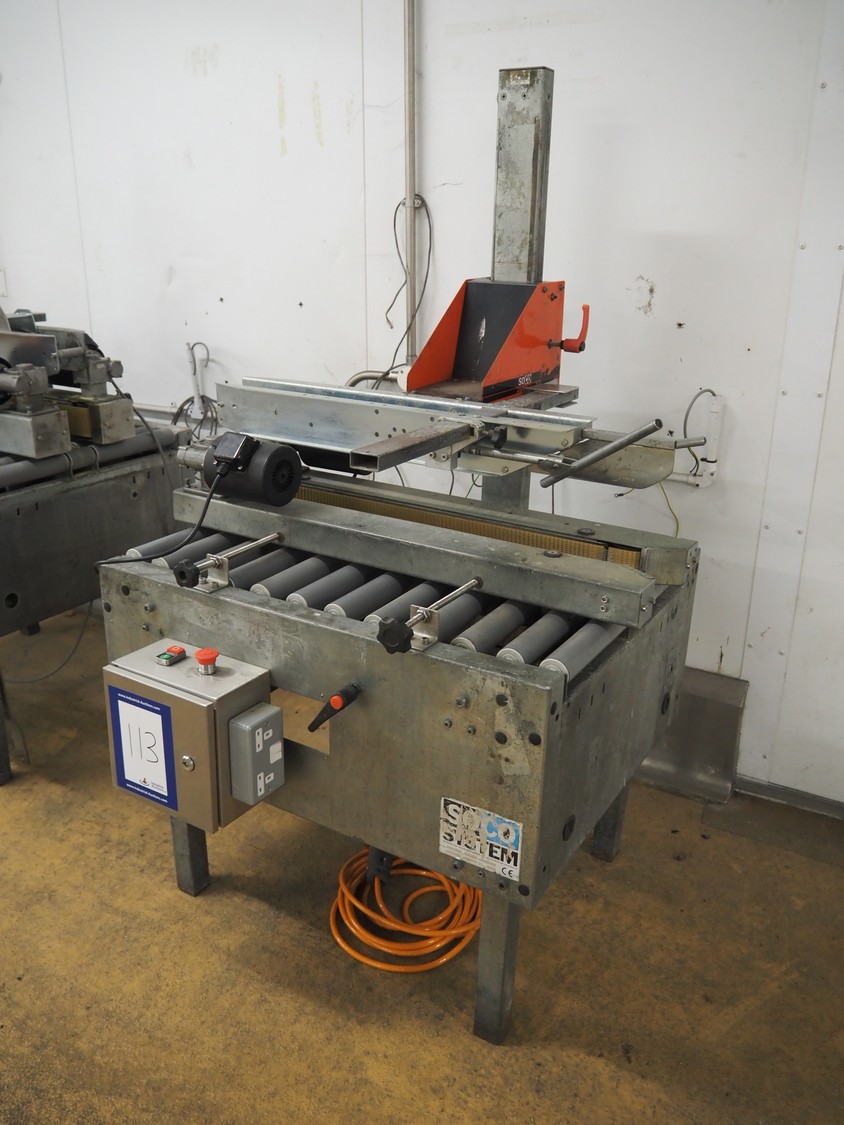 Soco System box closing machine, plastic rollers, roller width: 600 mm, 260 mm, 70 mm, total dimensions: 1000 mm x 960 mm x 1630 mm. Missing taper.