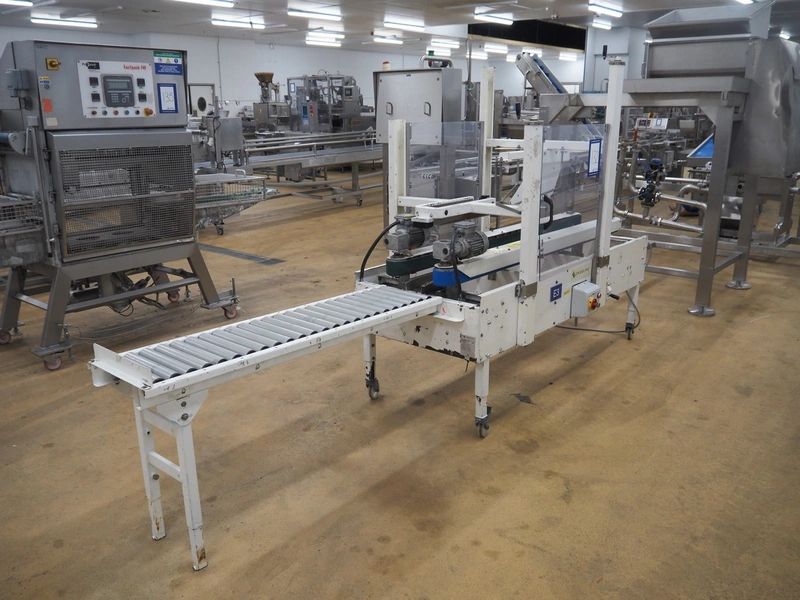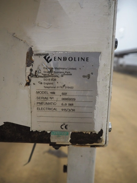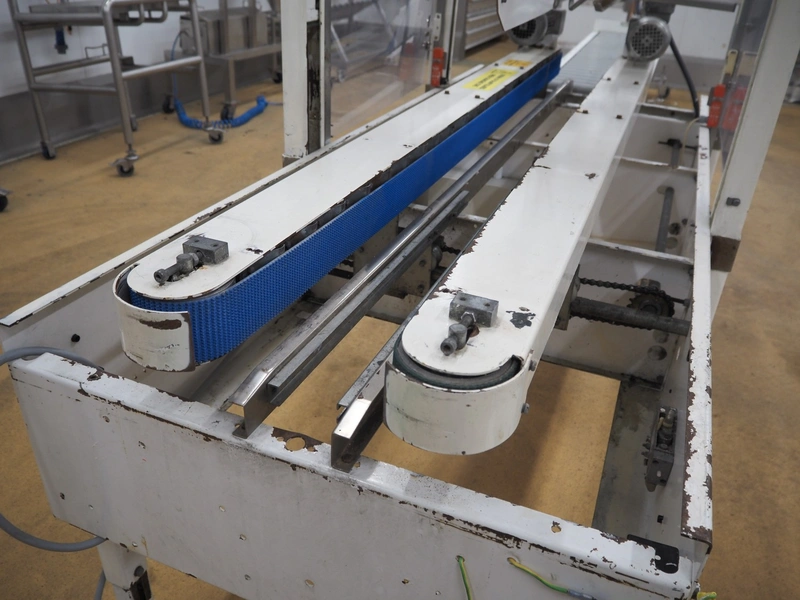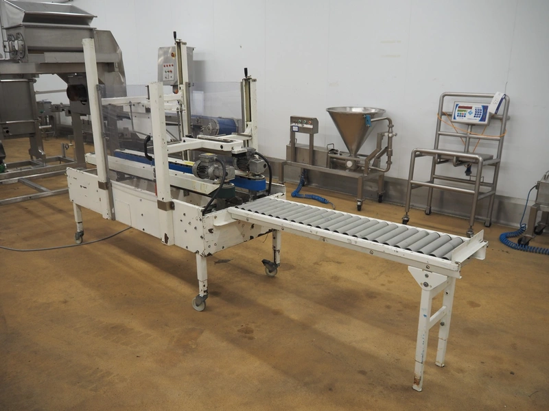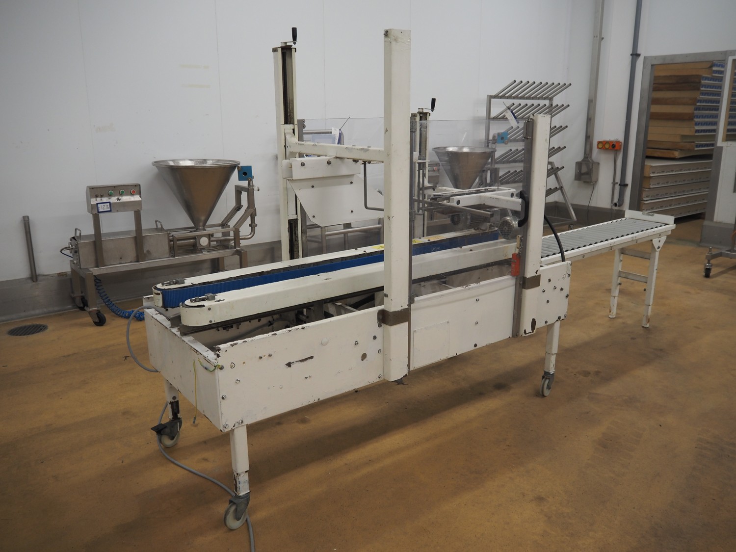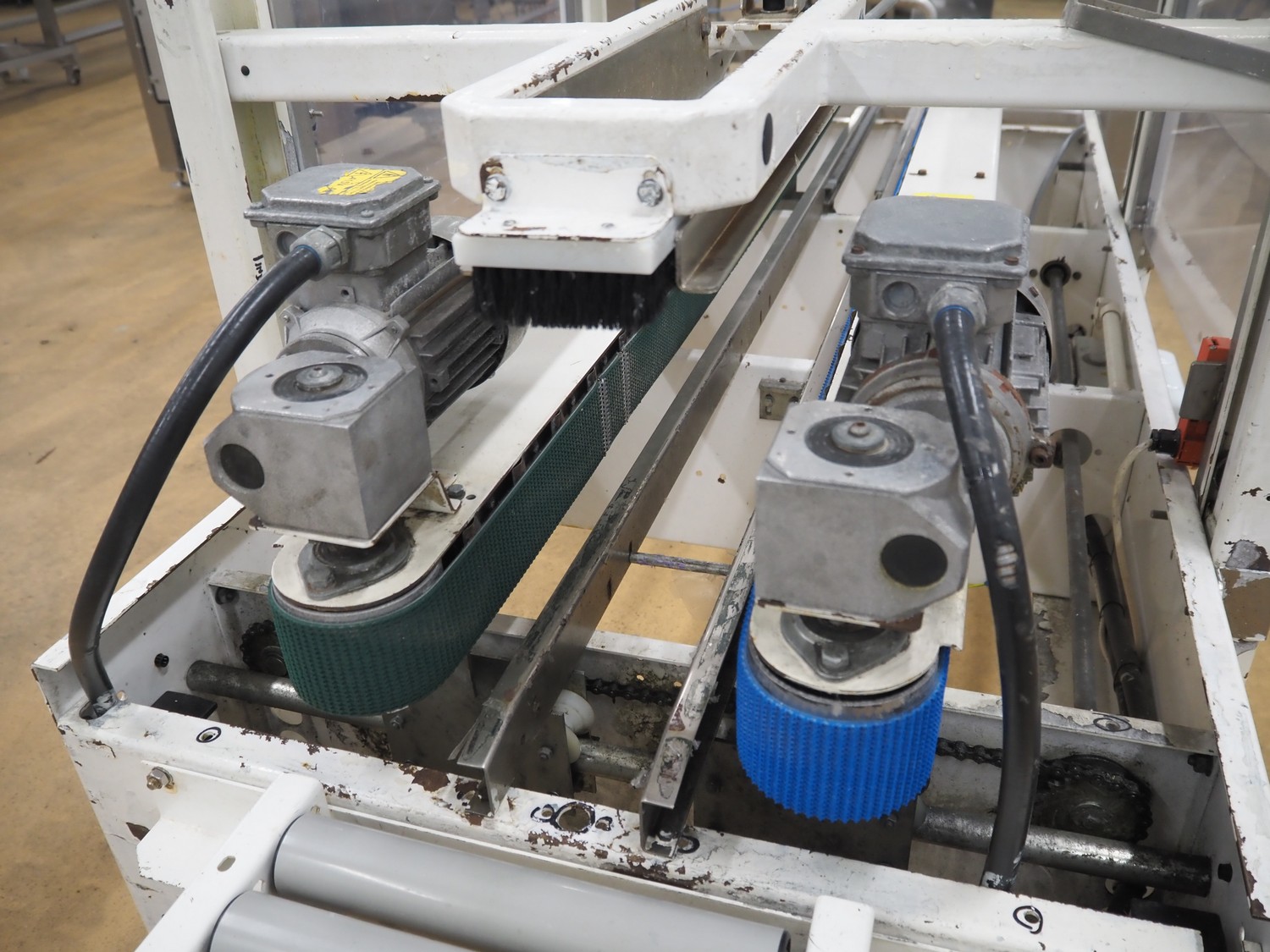 Endoline mobile box closing machine with outfeed conveyor, model: 607, serial number: 0069229, 415 V, 3 Ph, 50 Hz, 6.0 bar, plastic rollers, roller width: 300 mm, total dimensions: 3550 mm x 900 mm x 1900 mm. Missing taper.