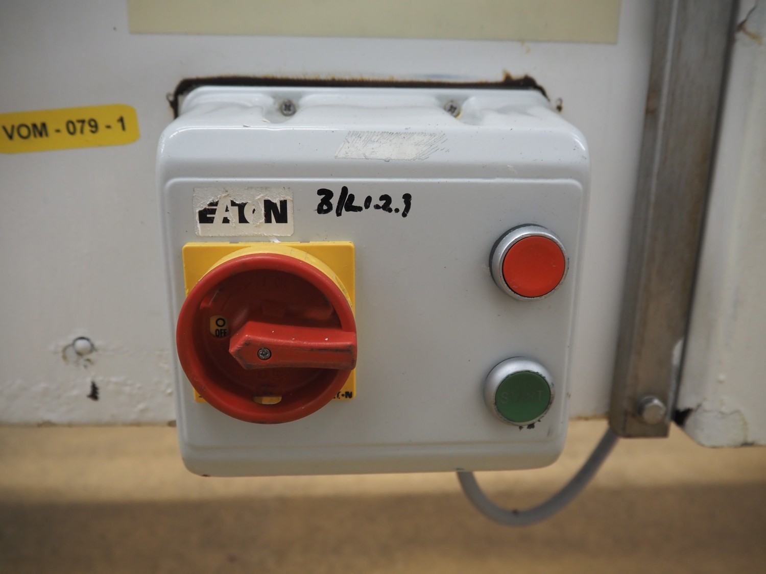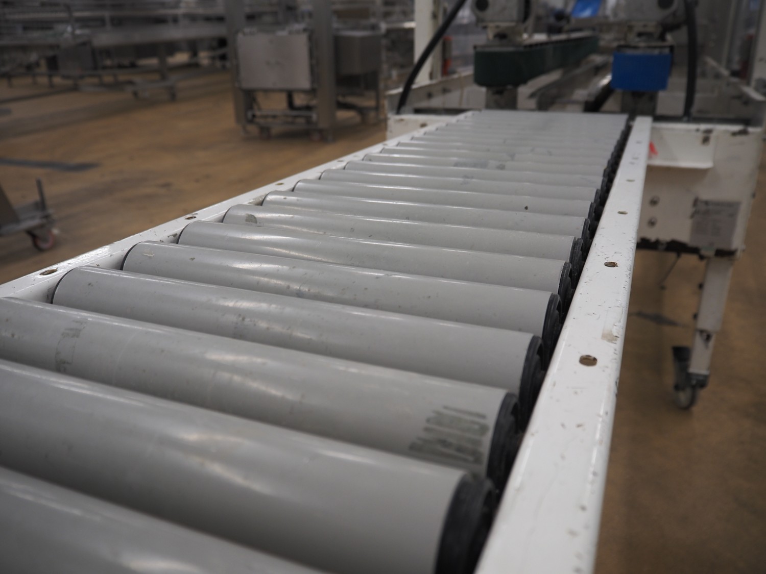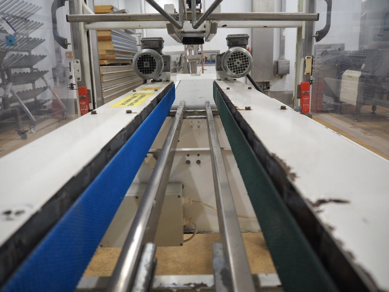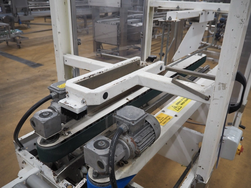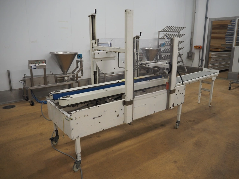 Endoline mobile box closing machine with outfeed conveyor, model: 607, serial number: 0069229, 415 V, 3 Ph, 50 Hz, 6.0 bar, plastic rollers, roller width: 300 mm, total dimensions: 3550 mm x 900 mm x 1900 mm. Missing taper.