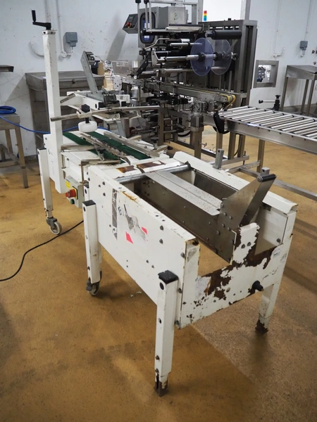 Endoline mobile box closing machine with infeed belt, model: 710, serial number: 080452569-1, 240 V, 1 Ph, 50 Hz, belt width: 135 mm, total dimensions: 1740 mm x 650 mm x 1480 mm.