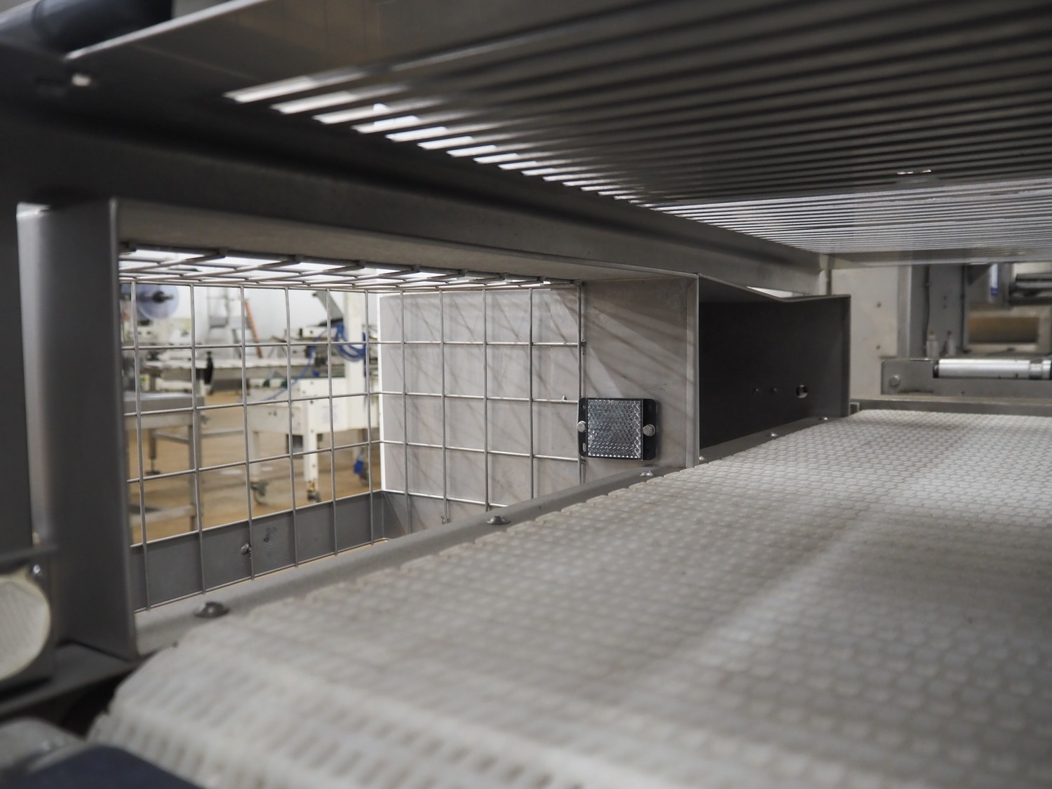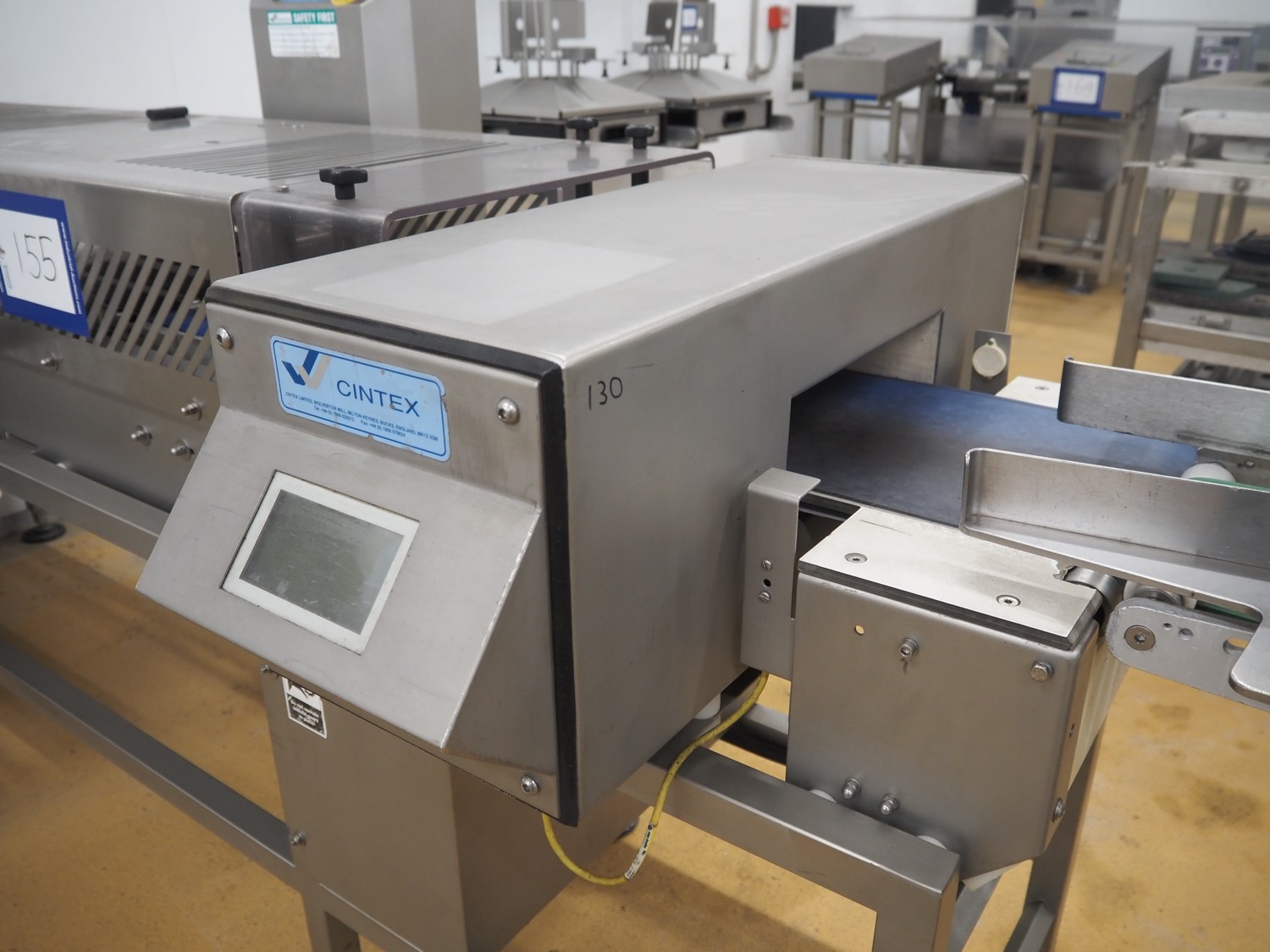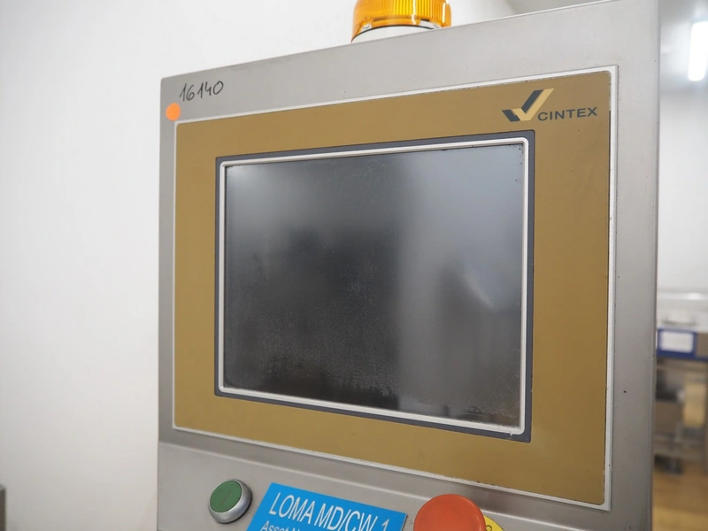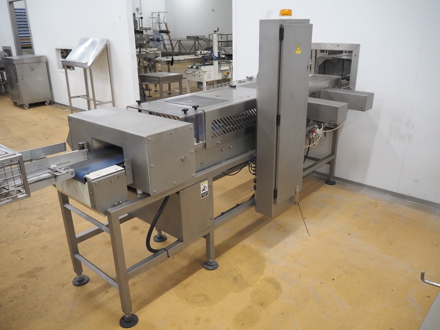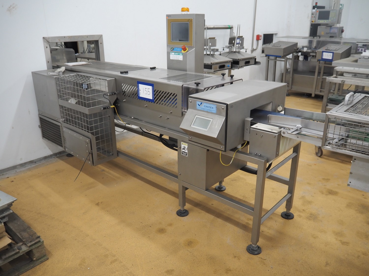 Cintex metal detector and checkweigher with rejector, clearance: 300 mm x 70 mm, plastic belt, belt width: 280 mm, 200 mm, 340 mm, total dimensions: 2550 mm x 1200 mm x 1550 mm.