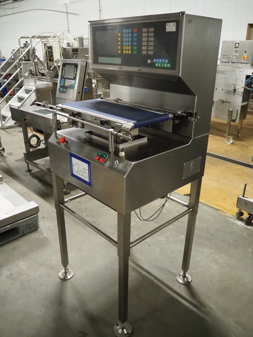 Sorta Weigh checkweigher, type: 450-08, serial number: 42271, year of construction: 1998, 415 V, 3 Ph, 50 Hz, 6 A, weighing range: 10 g- 990 g, plastic belt, belt width: 265 mm, total dimensions: 750 mm x 700 mm x 1750 mm.