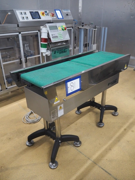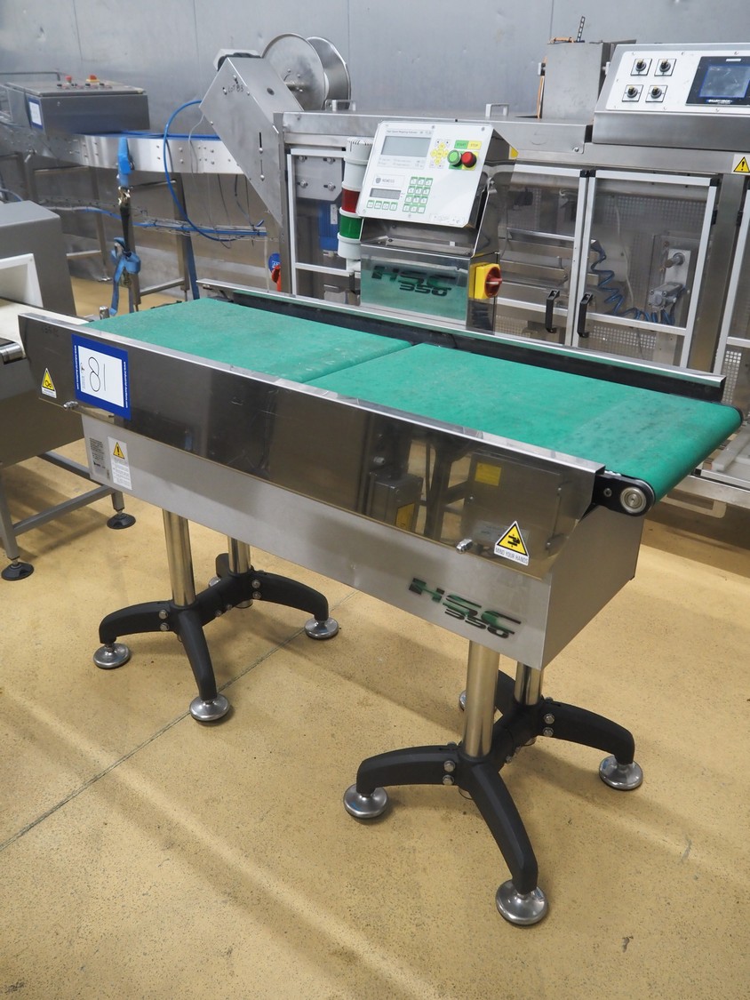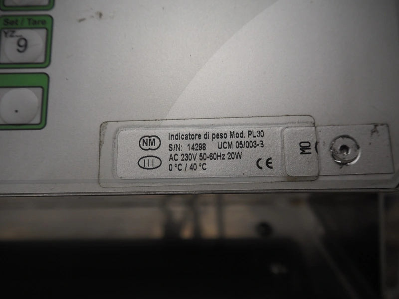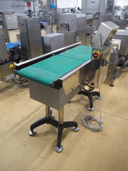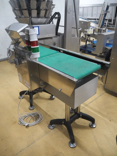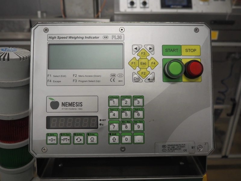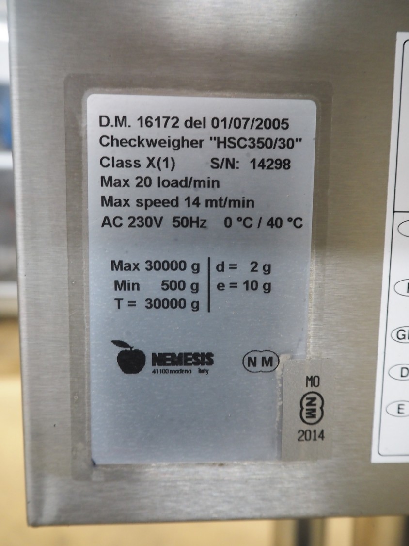 Nemesis checkweigher, type: PL30, serial number: 14298, year of construction: 2014, 230 V, 50-60 Hz, 20 W, temperature range: 0°C-40°C, plastic belt, belt width: 405 mm, total dimensions: 1500 mm x 750 mm x 1350 mm.