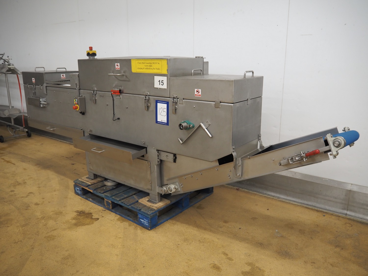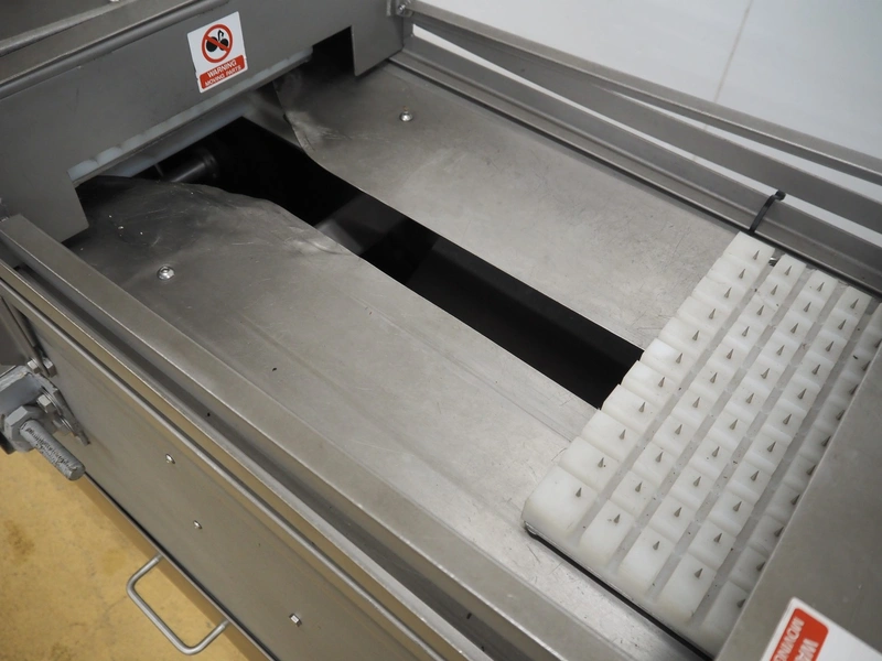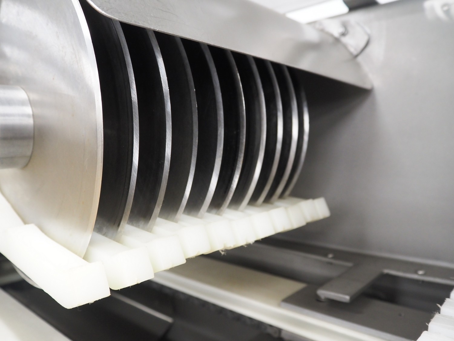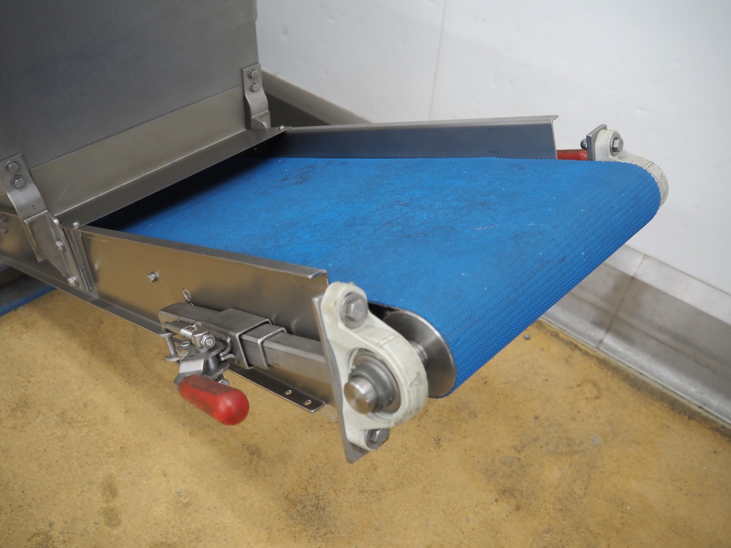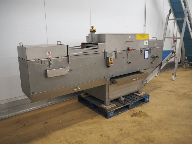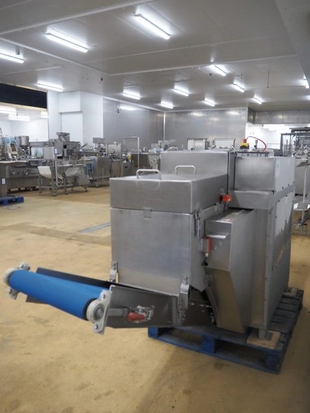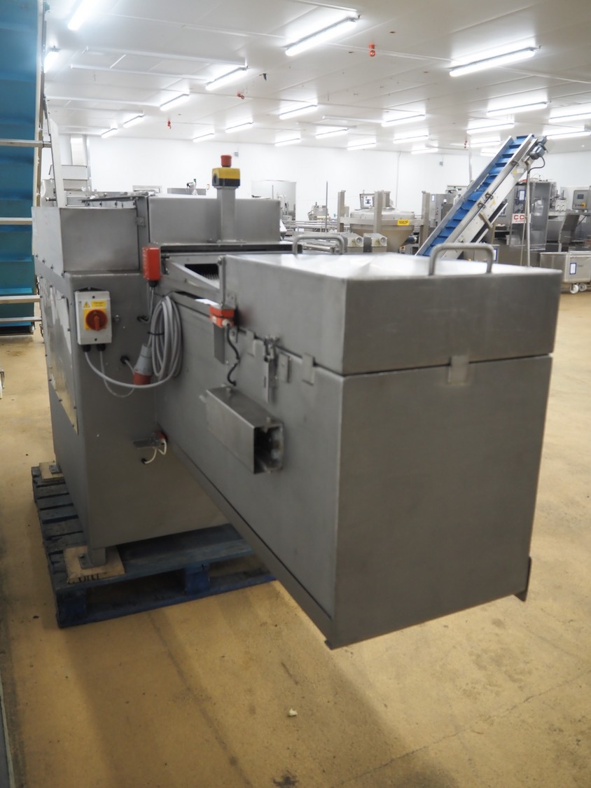 Genmac dicer, model: Cubeking 2700, dicing set: 20 mm x 20 mm or 25 mm x 25 mm, loading station width: 500 mm, plastic belt, belt width: 350 mm, capacity: approximately 500 kg/h, total dimensions: 3100 mm x 800 mm x 1450 mm.