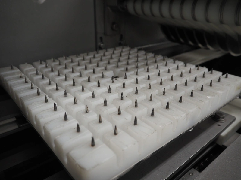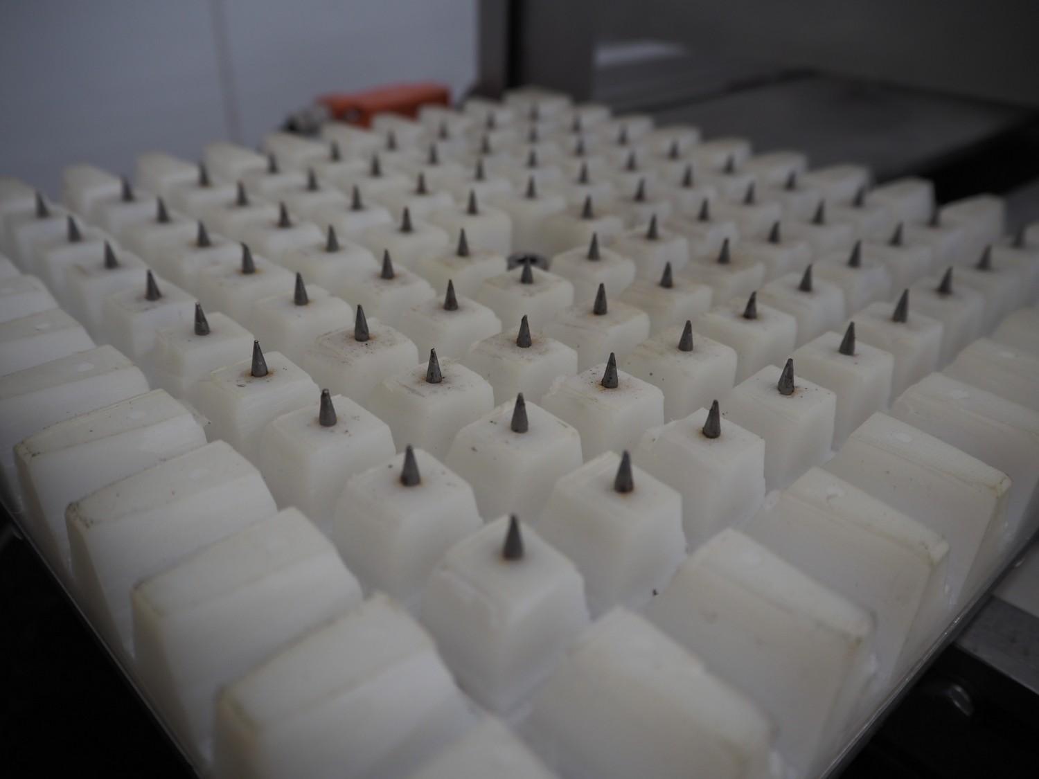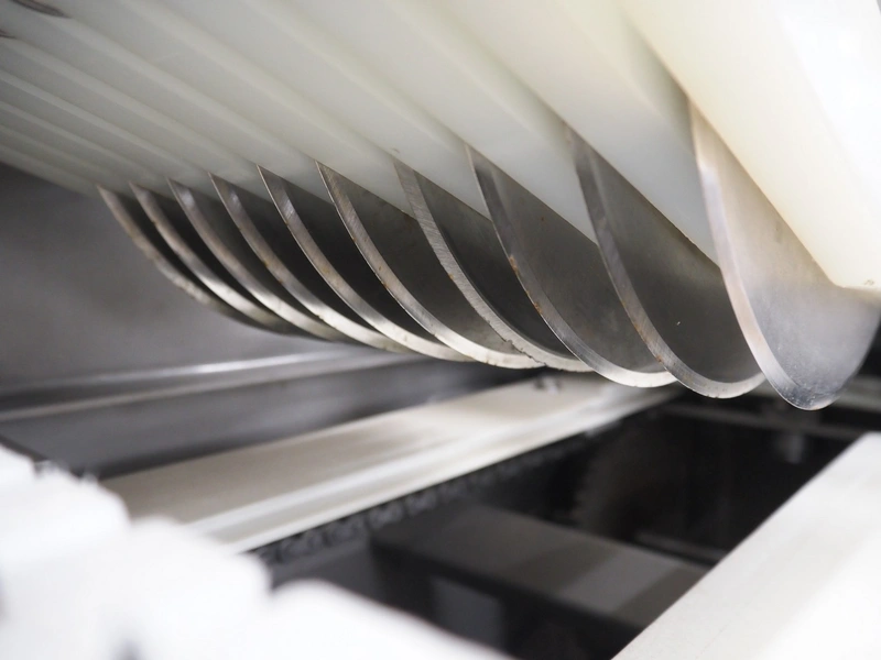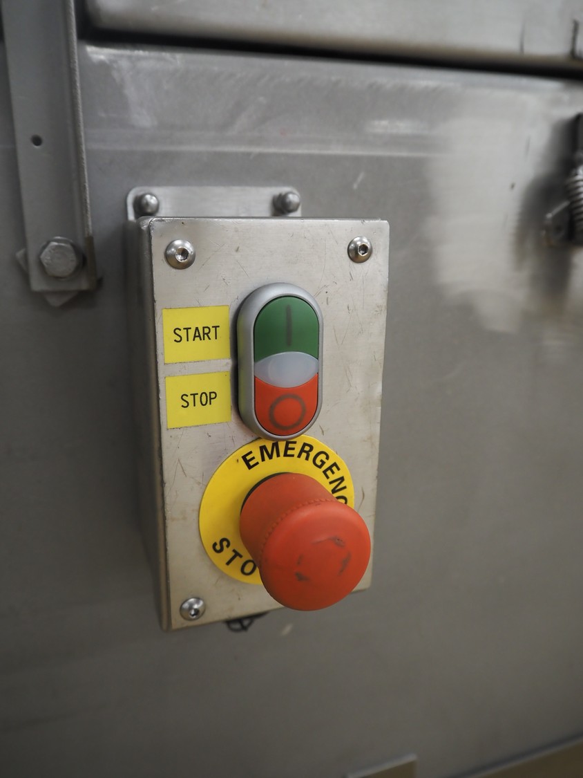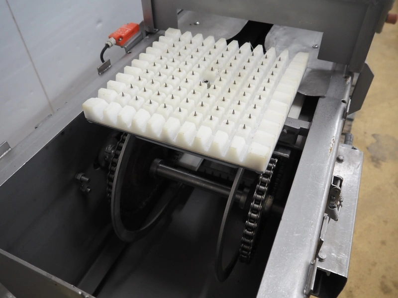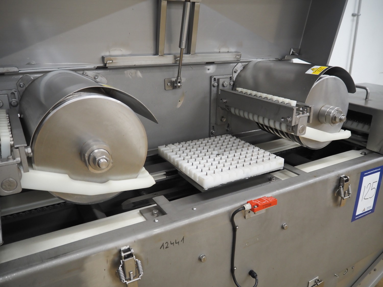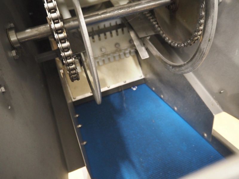 Genmac dicer, model: Cubeking 2700, dicing set: 20 mm x 20 mm or 25 mm x 25 mm, loading station width: 500 mm, plastic belt, belt width: 350 mm, capacity: approximately 500 kg/h, total dimensions: 3100 mm x 800 mm x 1450 mm.