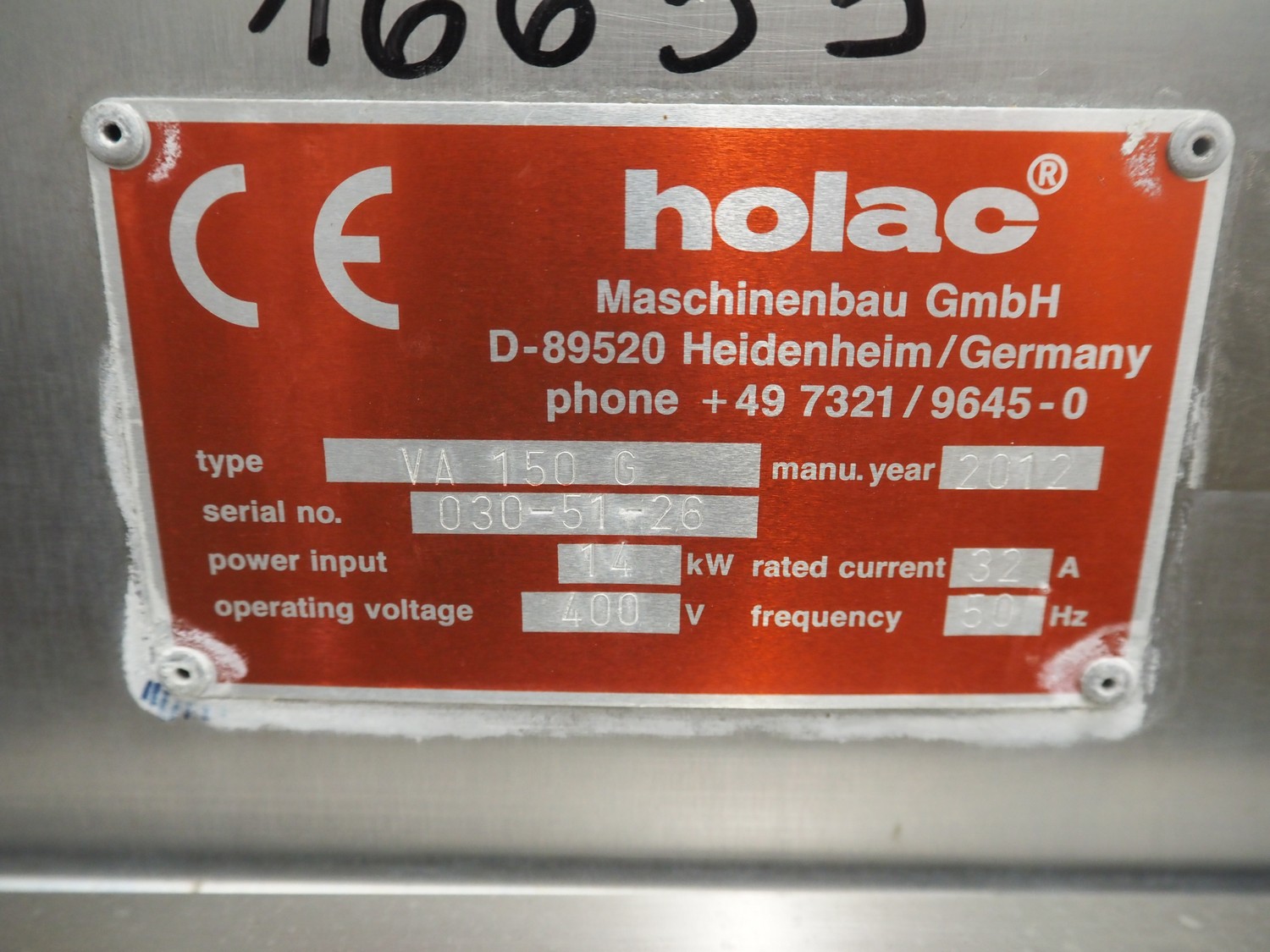Holac Maschinenbau GmbH dicer, type: VA 150 G, serial number: 030-01-28, year of construction: 2012, 400 V, 50 Hz, 32 A, 14 kW, dimensions chamber: 150 mm x 150 mm, total dimensions: 2460 mm x 1400 mm x 1670 mm. Missing grid.