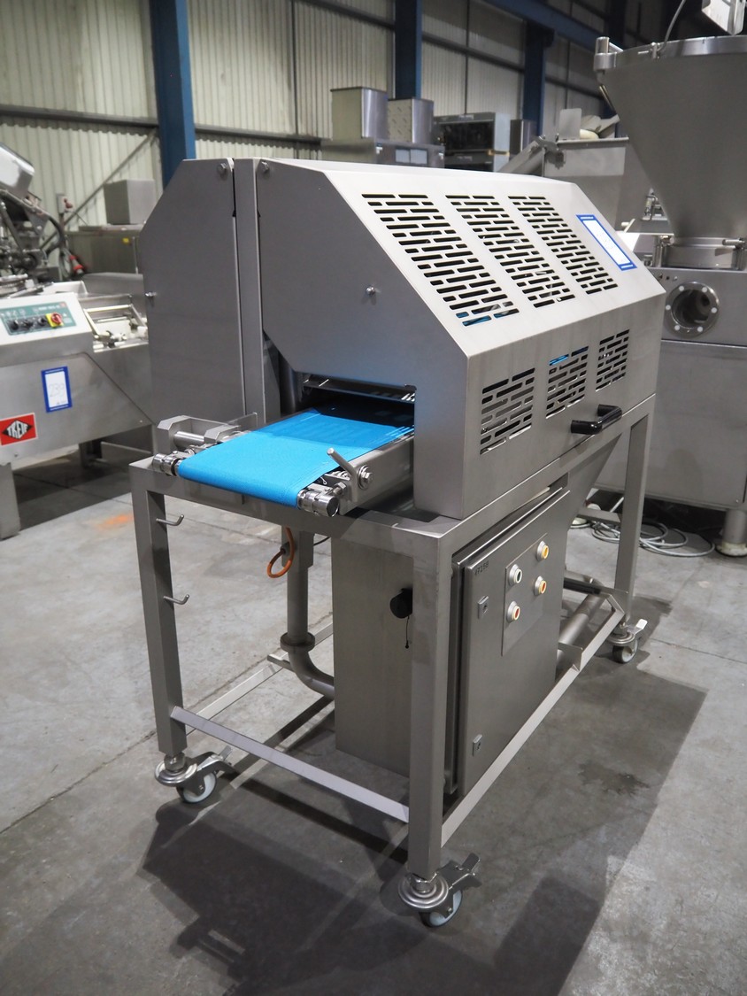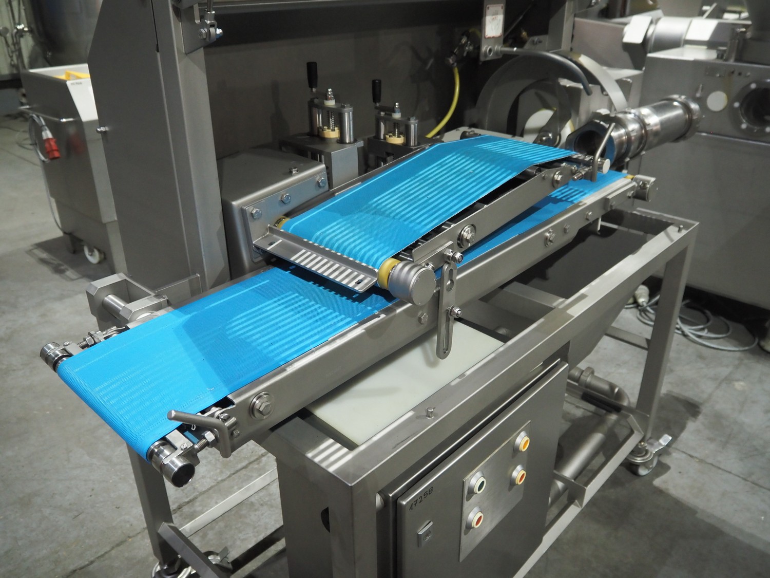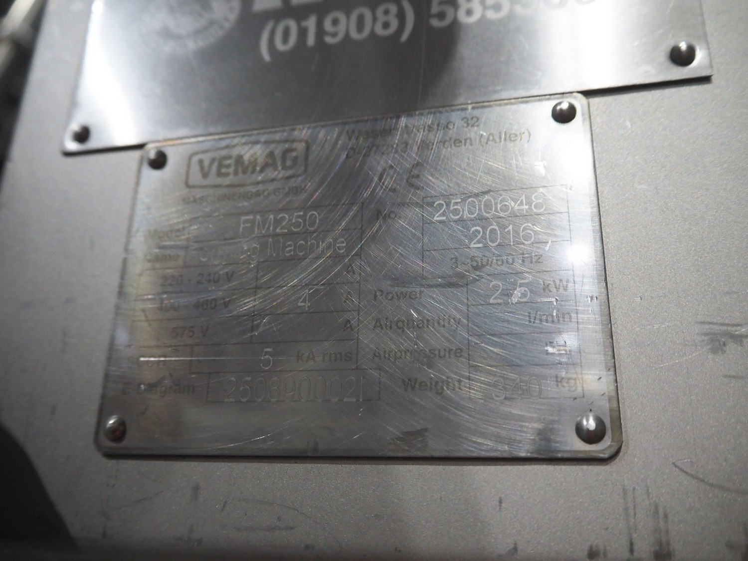 Vemag mobile hamburger forming machine, model: FM250, number: 2500648, year of construction: 2016, 400-460 V, 3 Ph, 50/60 Hz, 4 A, 2.5 kW, weight: 340 kg, diameter clearance: 90 mm, plastic belt, belt width: 245 mm, total dimensions: 2000 mm x 850 mm x 1500 mm