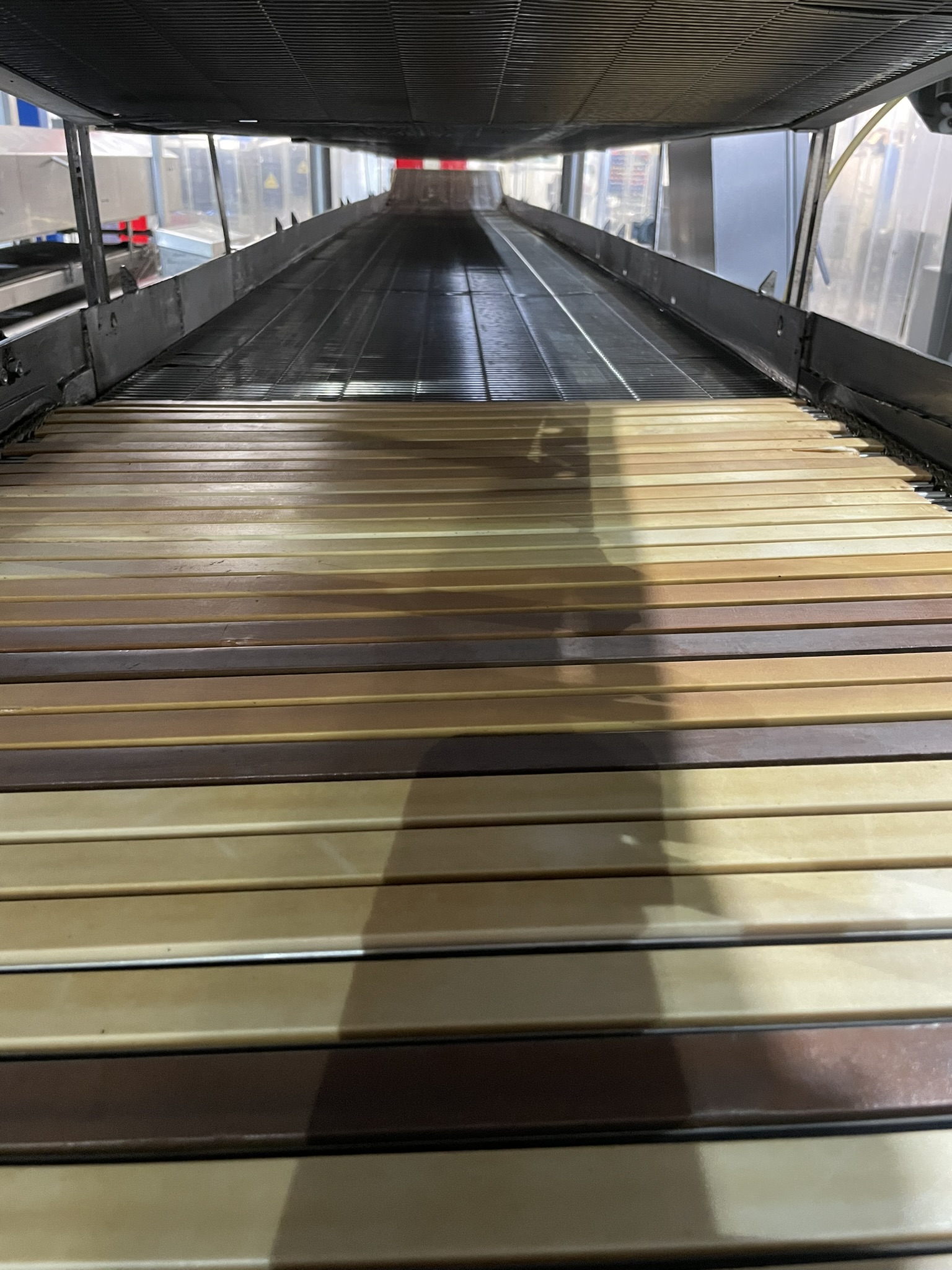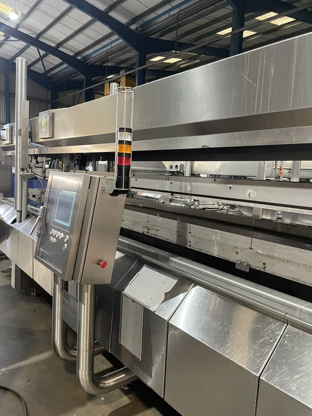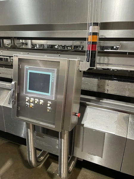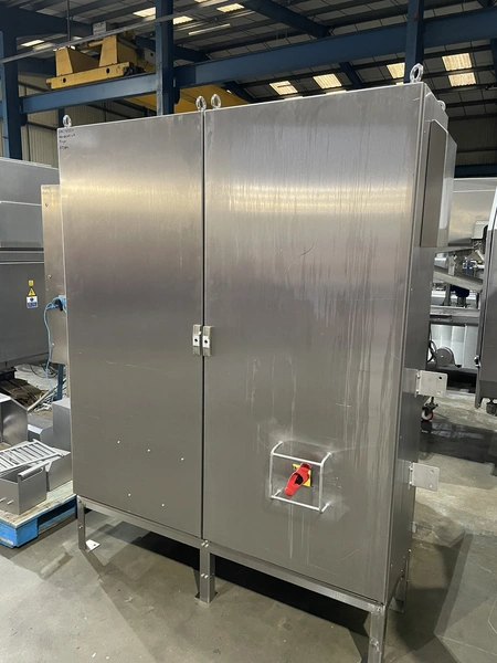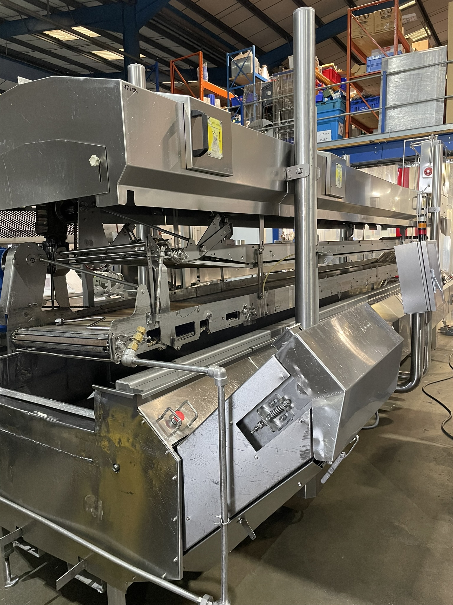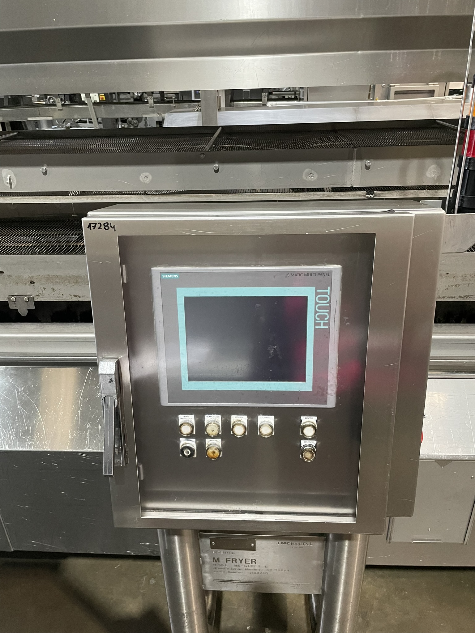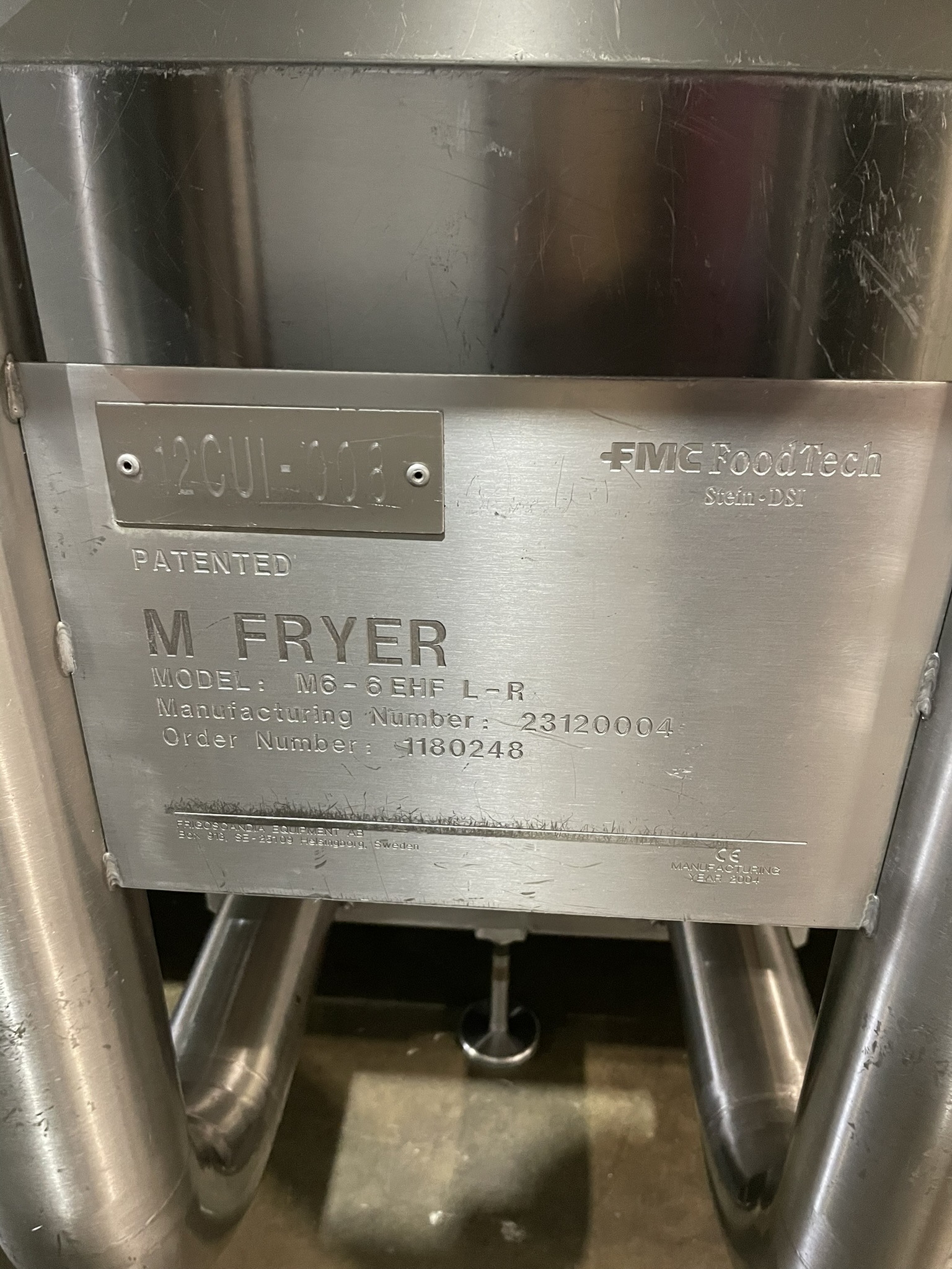 FMC FoodTech electric fryer, model: M6-6EHF L-R, number: 1180248, manufacturing number: 23120004, s/s mesh belt, belt width: 620 mm and 640 mm, total dimensions: 7000 mm x 1800 mm x 2900 mm.