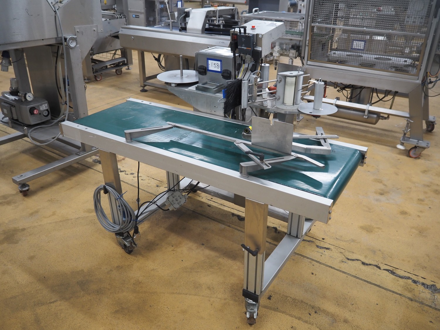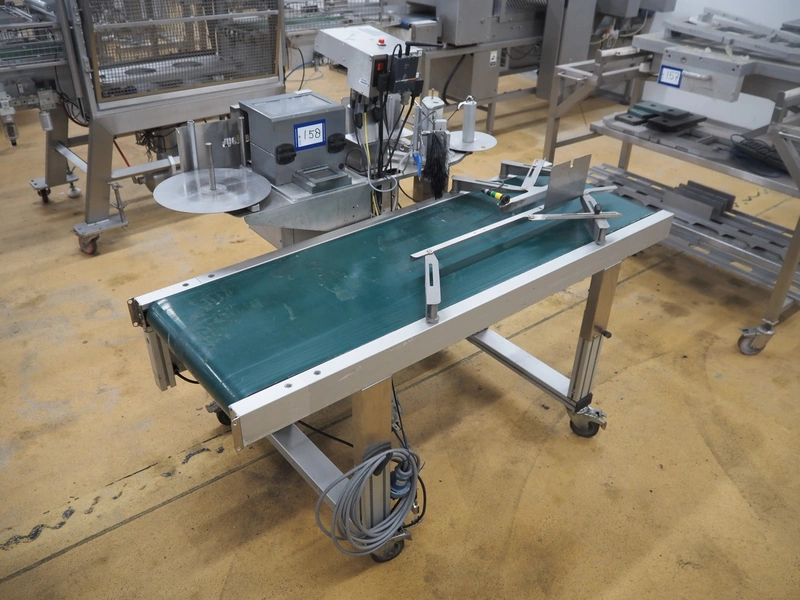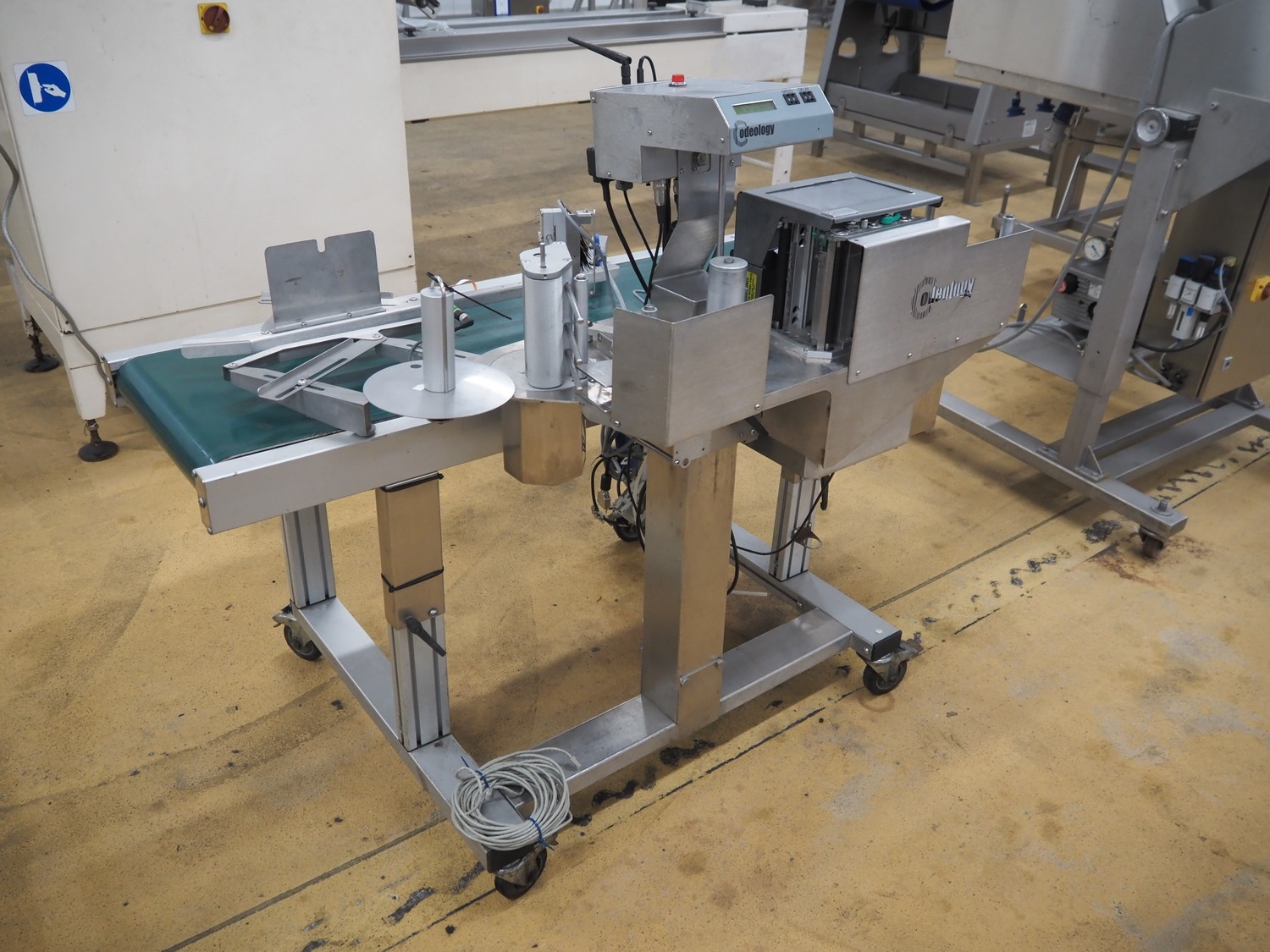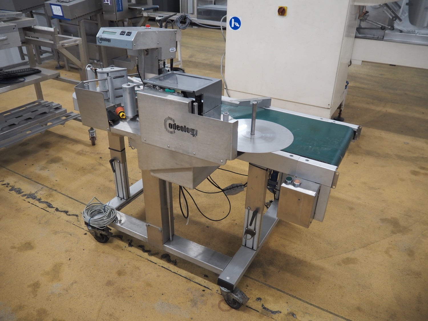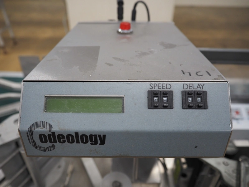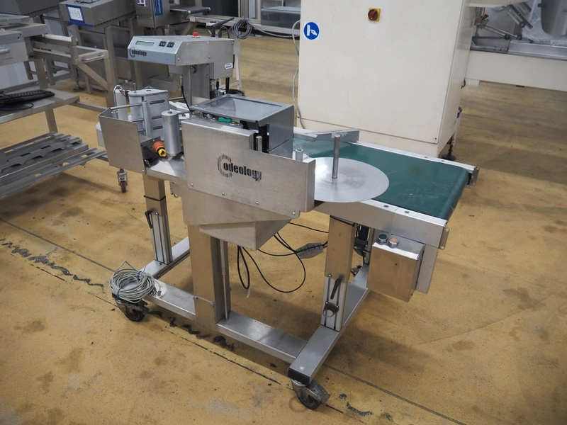 Odeology mobile labelling machine, plastic belt, belt width: 430 mm, total dimensions: 1500 mm x 900 mm x 1200 mm.