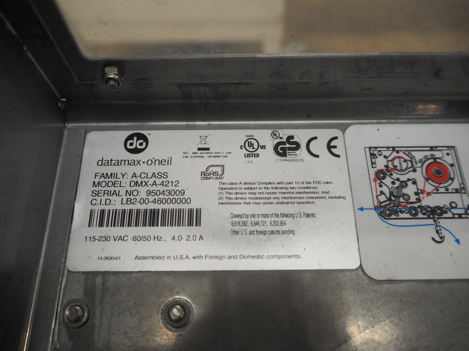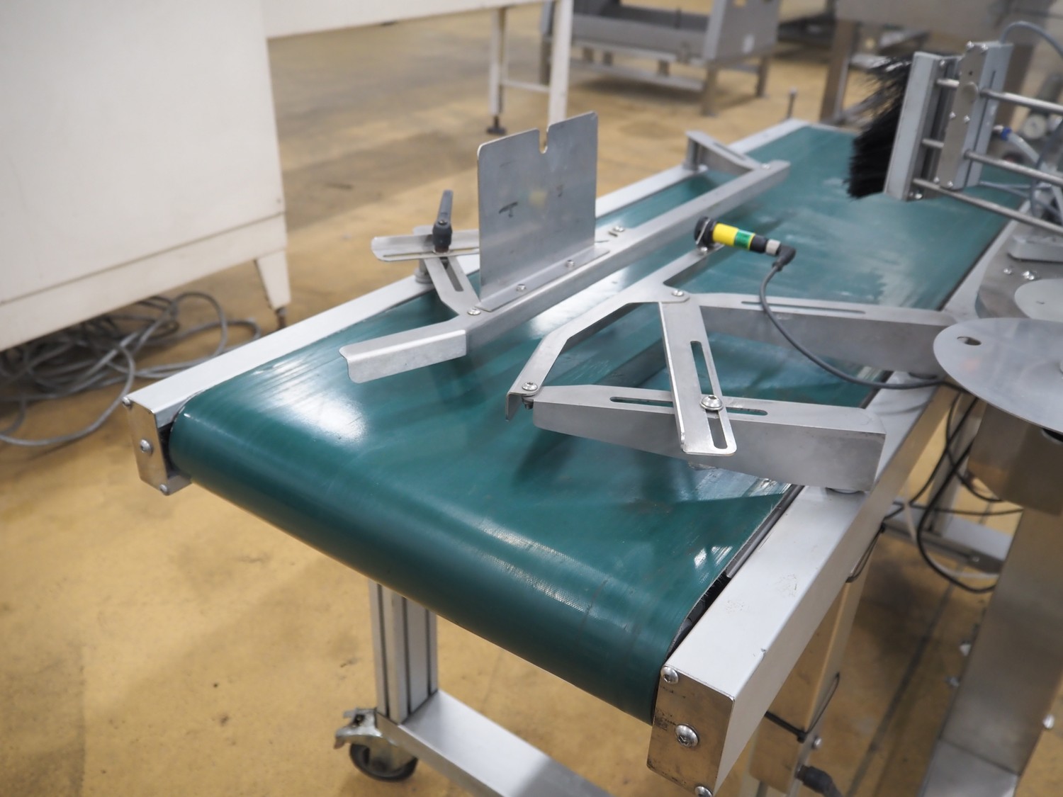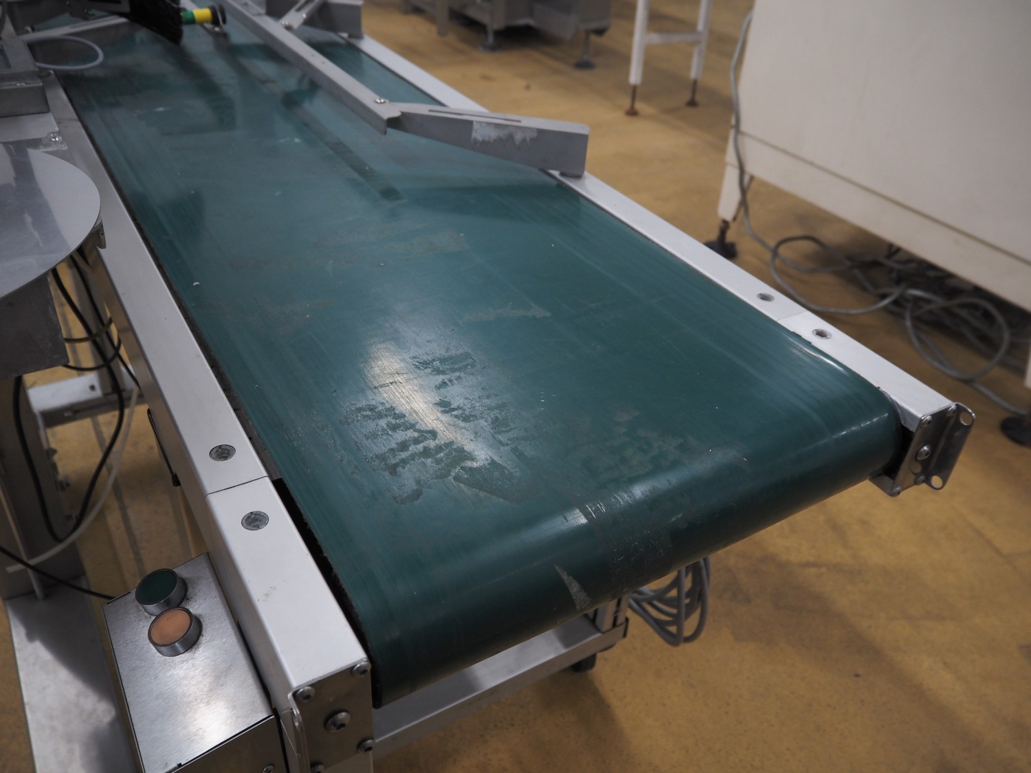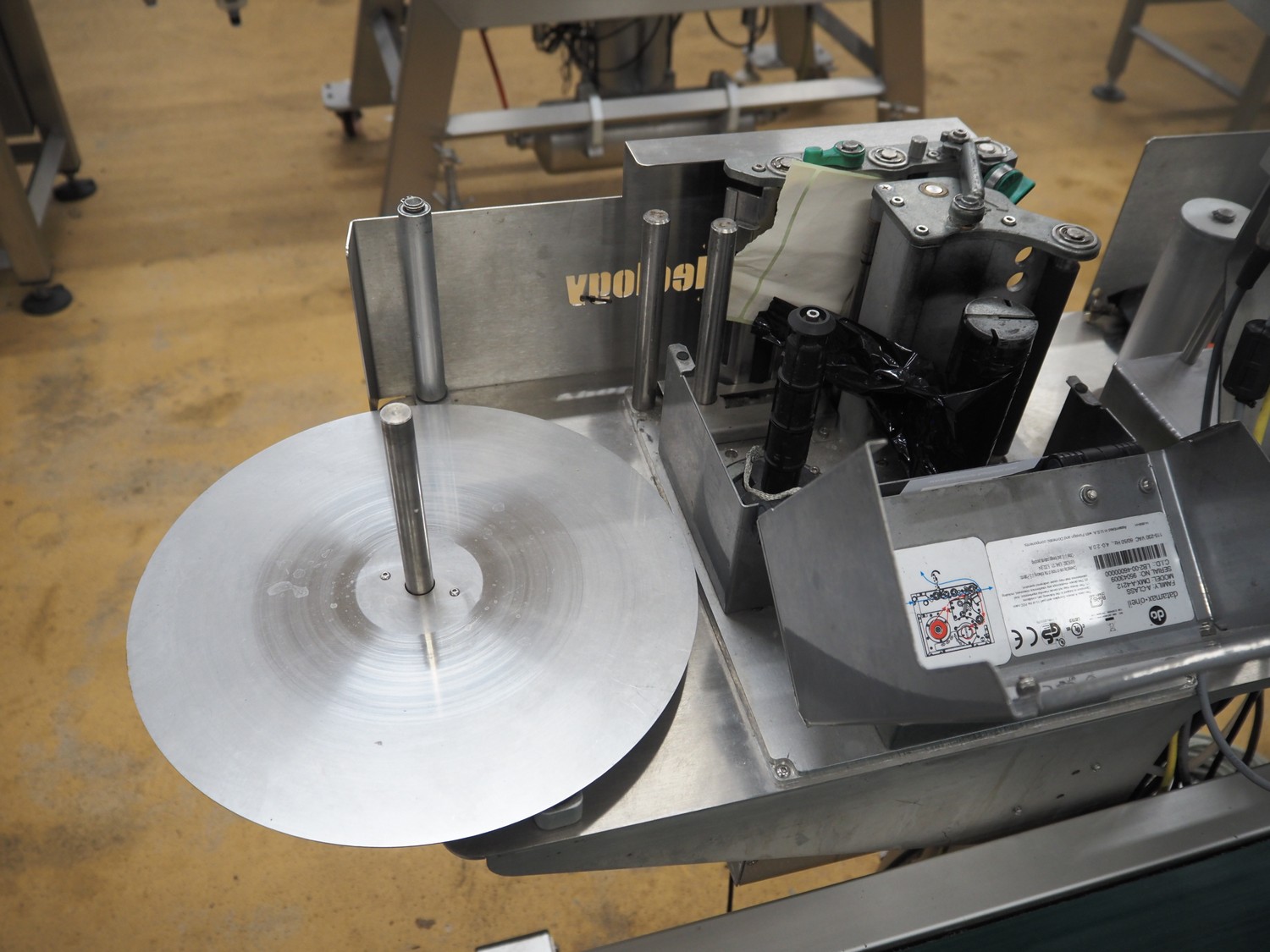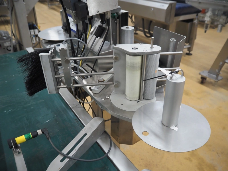 Odeology mobile labelling machine, plastic belt, belt width: 430 mm, total dimensions: 1500 mm x 900 mm x 1200 mm.
