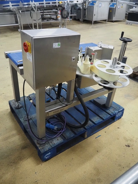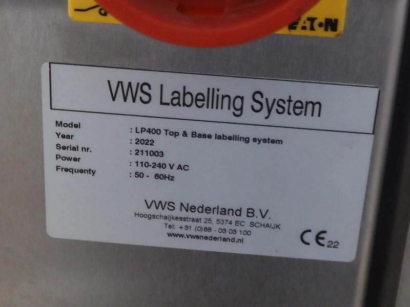 VWS Nederland B.V. belt labeler, model: LP400 Top & Base labelling system, serial number: 211003, year of construction: 2022, 110-240 V AC, 50-60 Hz, plastic belt, belt width: 295 mm, total dimensions: 1200 mm x 1050 mm x 1050 mm.