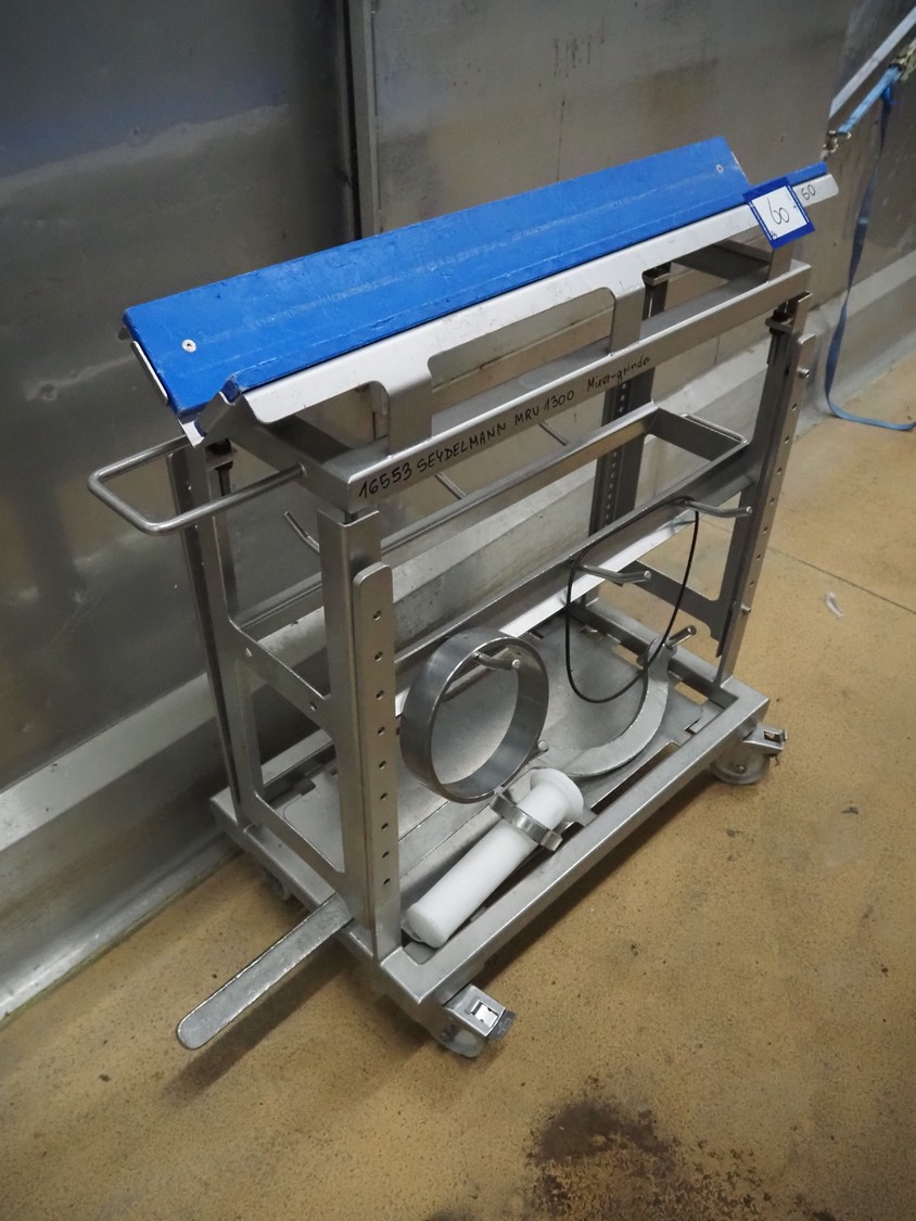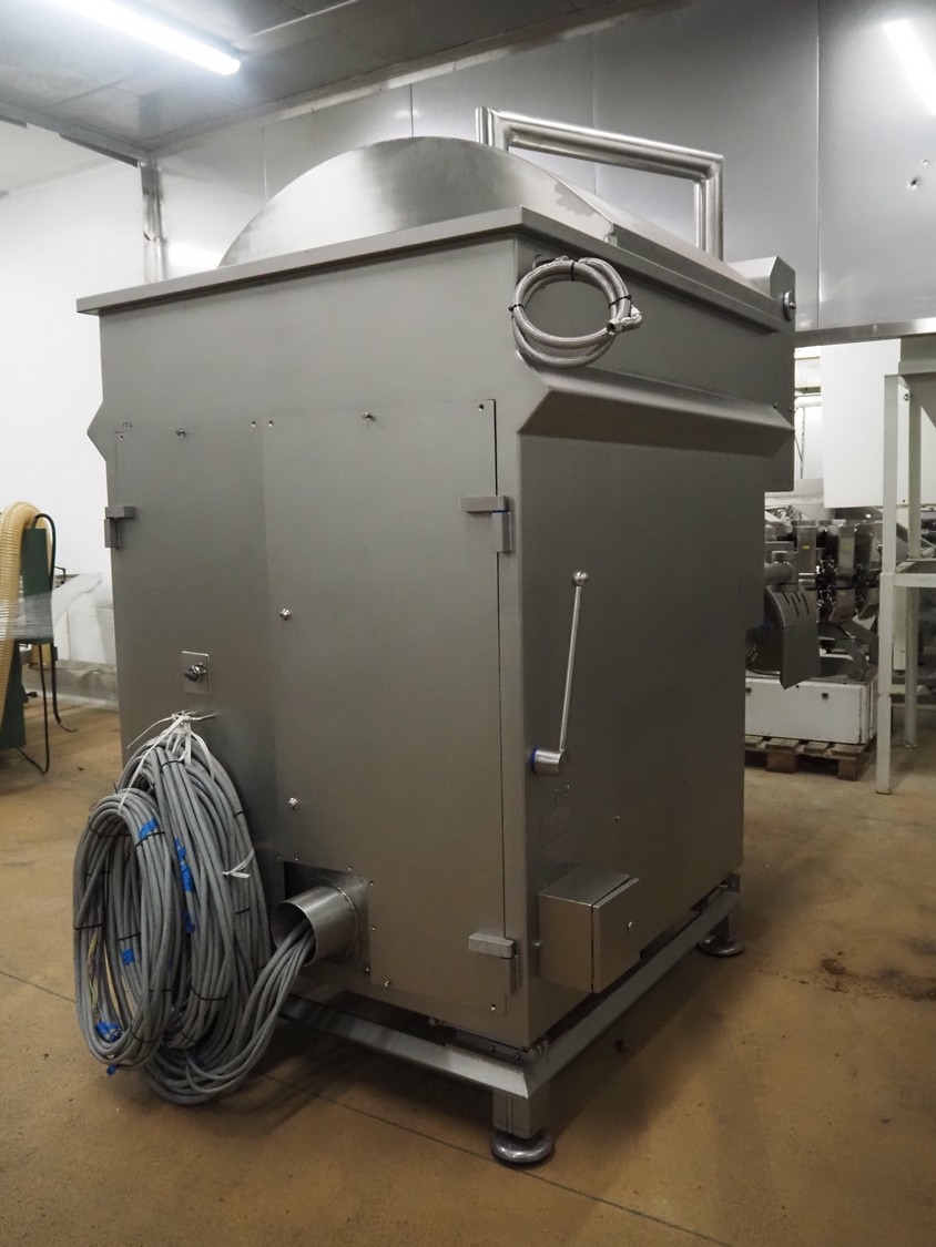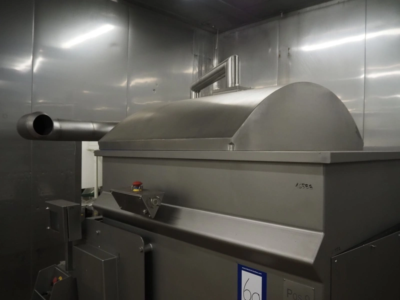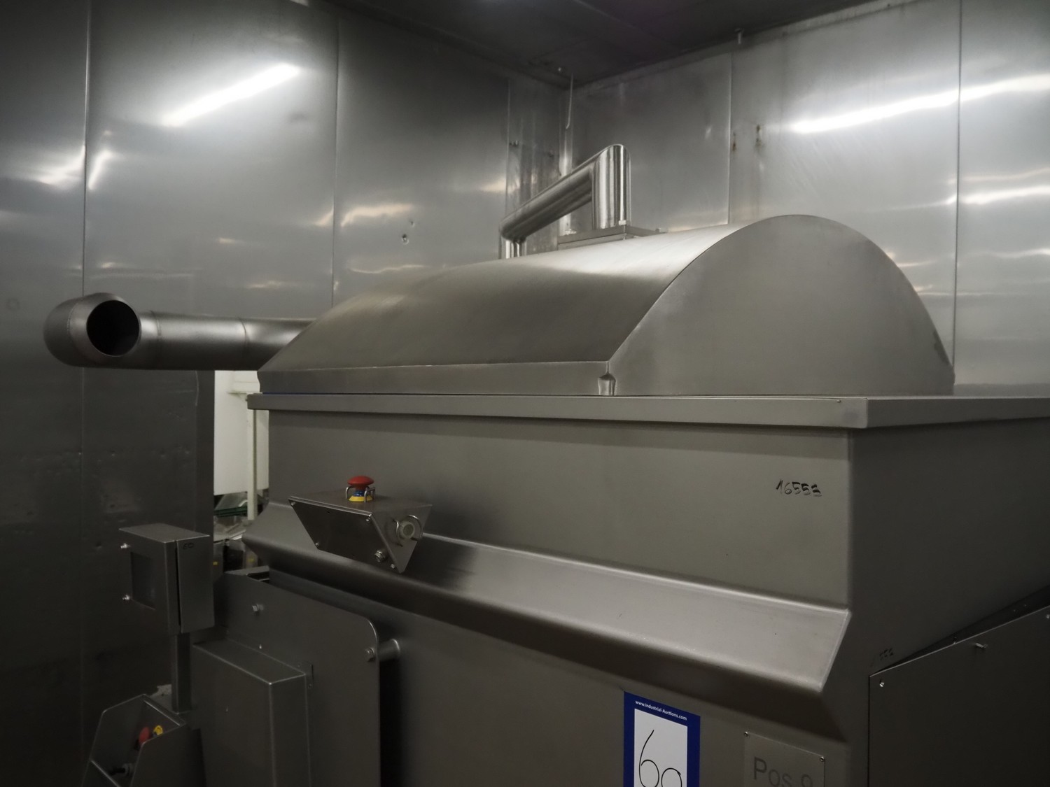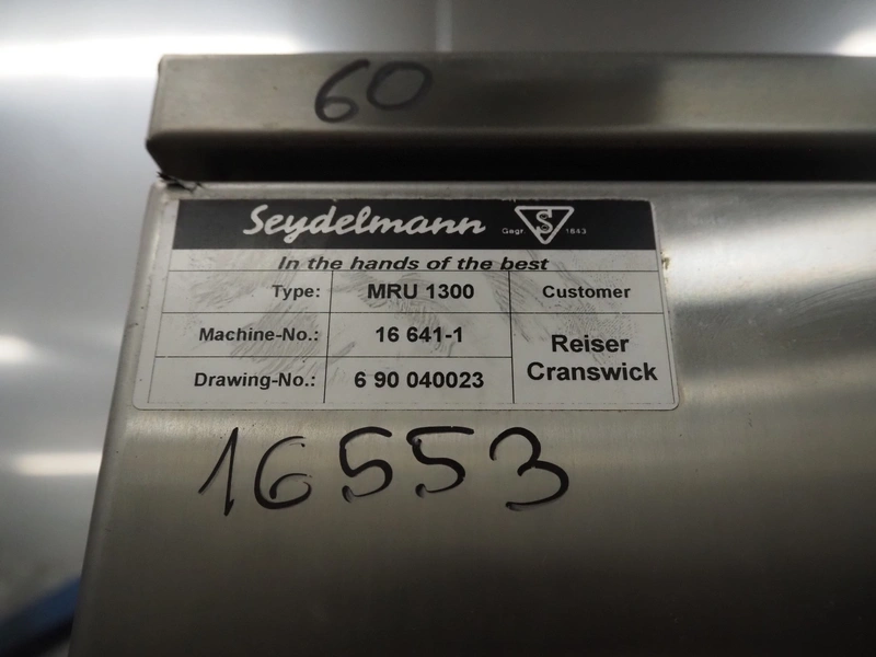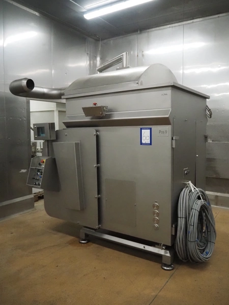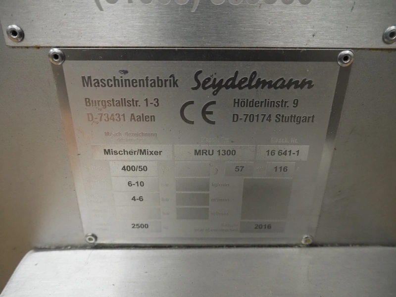 Seydelmann paddle mixer / grinder with CO2 cooling function, type: MRU 1300, machine number: 16 641-1, year of construction: 2016, 400 V, 50 Hz, 116 A, 57 kW, weight: 2500 kg, volume: 1300 liter, plate diameter: 200 mm, dimensions: 2700 mm x 1700 mm x 2750 mm. Including s/s switch cabinet, dimensions: 1820 mm x 500 mm x 1900 mm, s/s tool trolley, dimensions: 1200 mm x 450 mm x 970 mm.