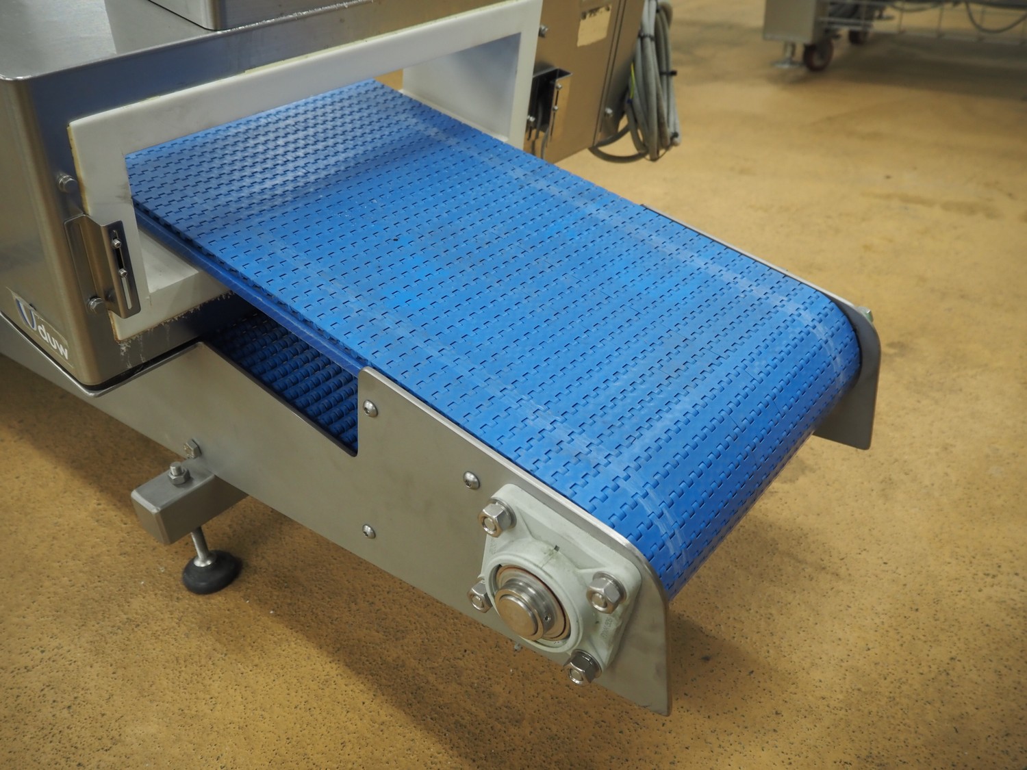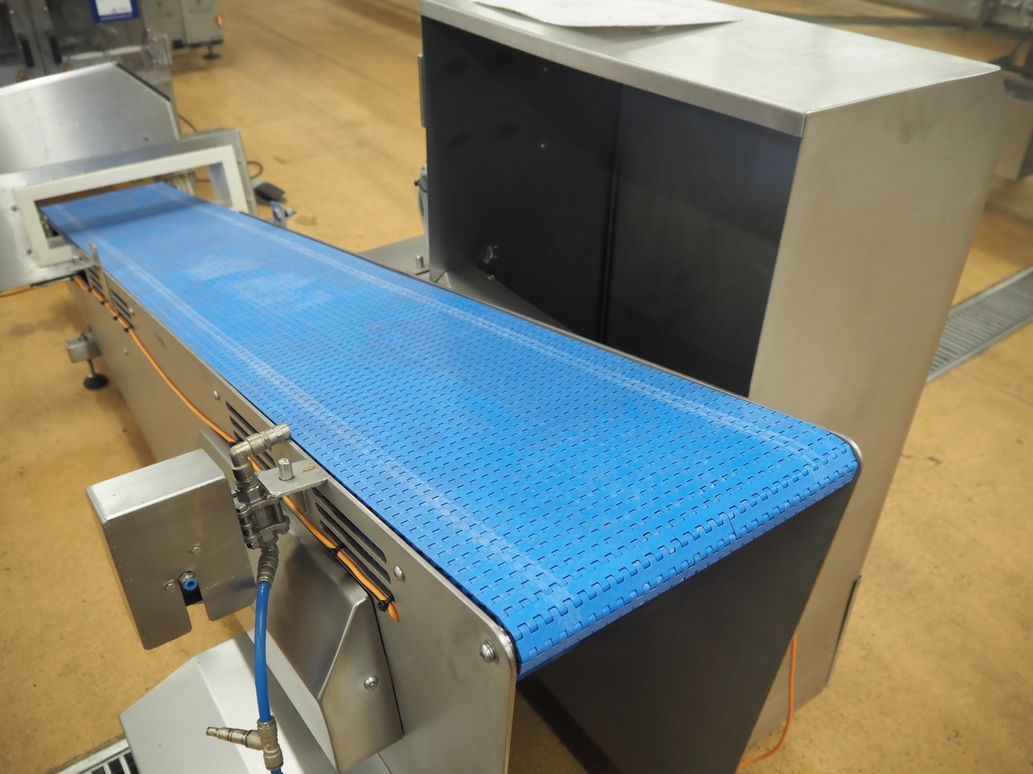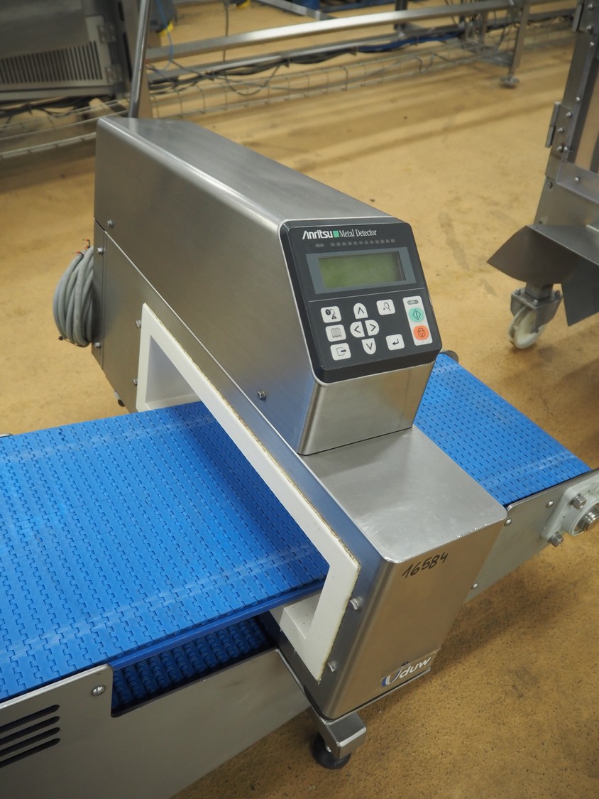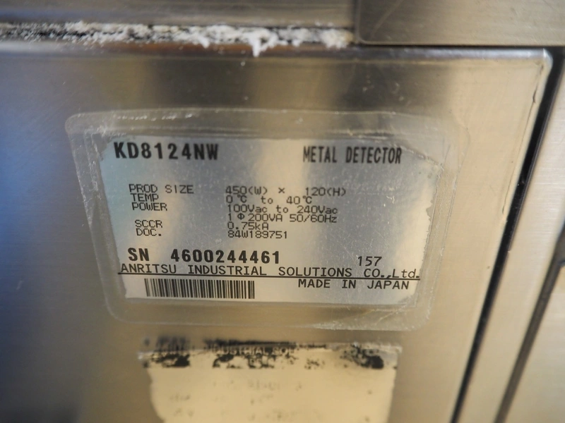 Anritsu elevating metal detector with rejector, type: KD8124NW, serial number: 4600244461, 100-240 Vac, 1 Ph, 50/60 Hz, clearance: 450 mm x 100 mm, plastic belt, belt width: 350 mm, elevating height: 880 mm, total dimensions: 2500 mm x 1100 mm x 1120 mm.