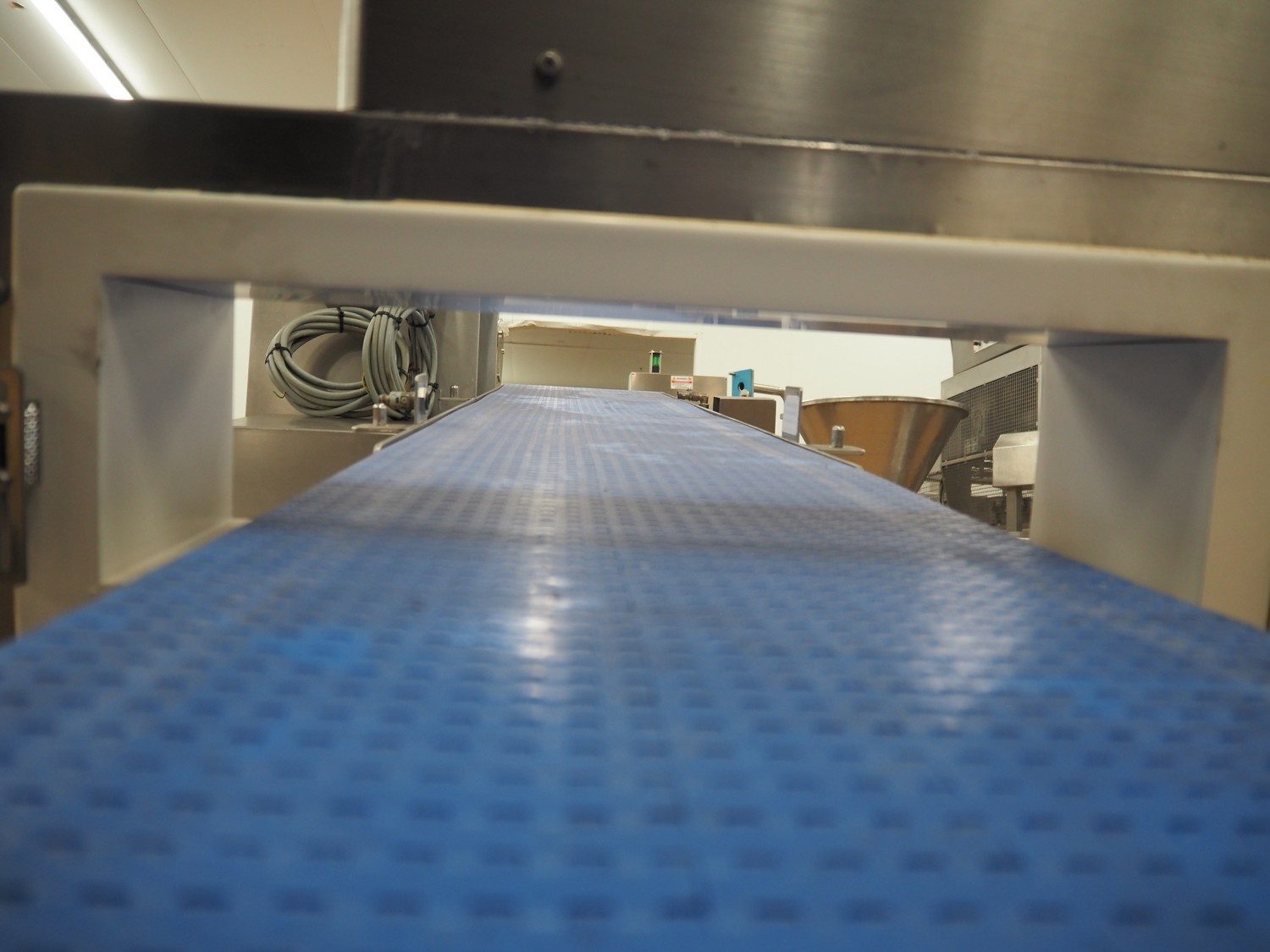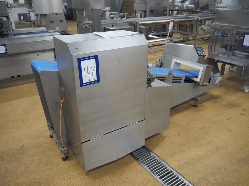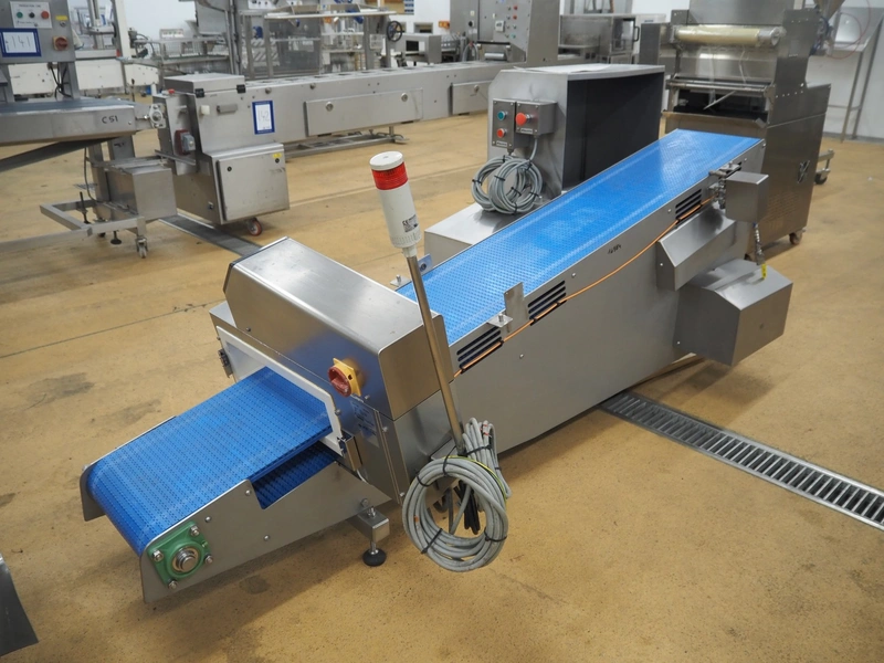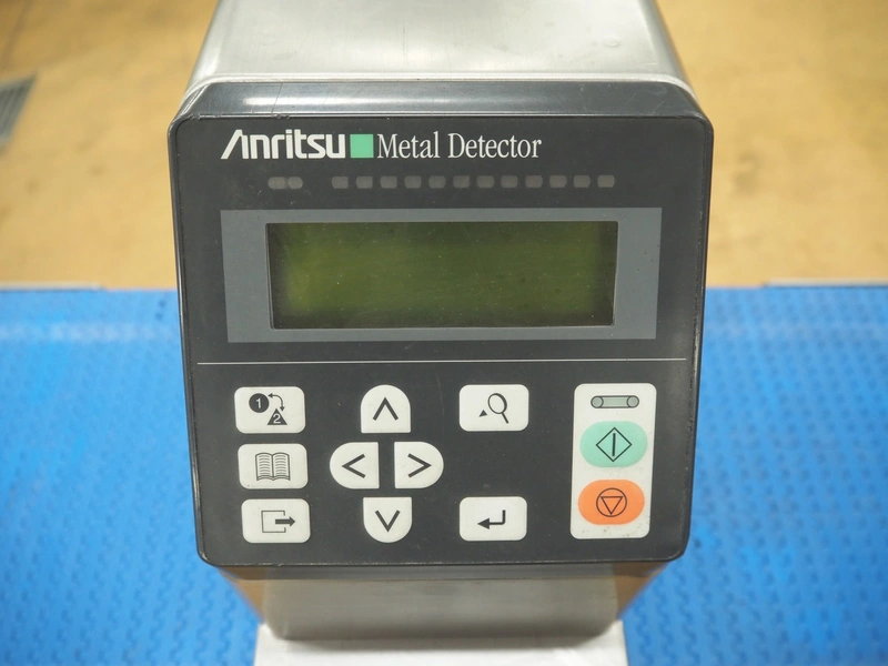 Anritsu elevating metal detector with rejector, type: KD8124NW, serial number: 4600244461, 100-240 Vac, 1 Ph, 50/60 Hz, clearance: 450 mm x 100 mm, plastic belt, belt width: 350 mm, elevating height: 880 mm, total dimensions: 2500 mm x 1100 mm x 1120 mm.