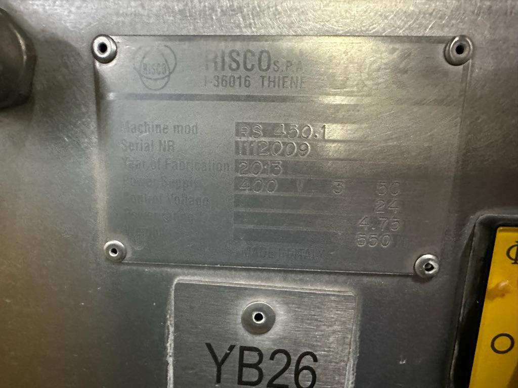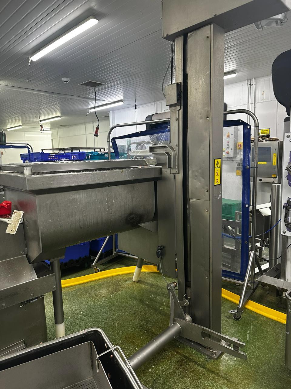 Risco S.P.A double shaft paddle mixer with lifter for 200 liter meat bins, model: RS 450.1, serial number: I112009, year of construction: 2013, 400 V, 3 Ph, 50 Hz, 4.75 kW, machine weight: 550 kg, dimensions mixer: 1850 mm x 1100 mm x 1580 mm.