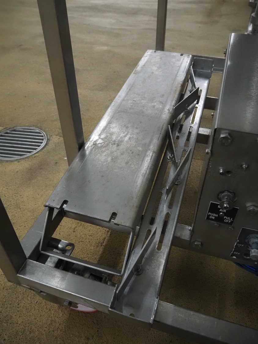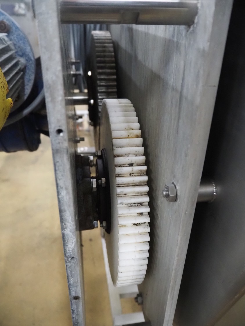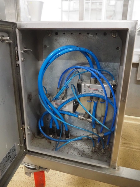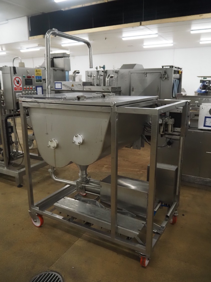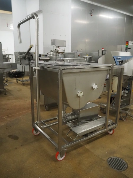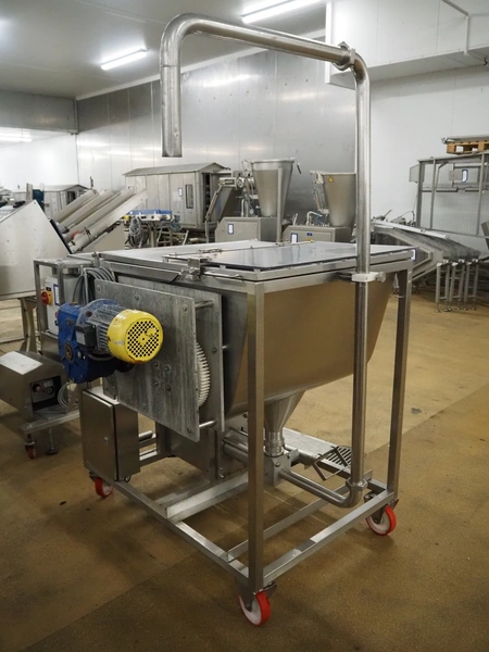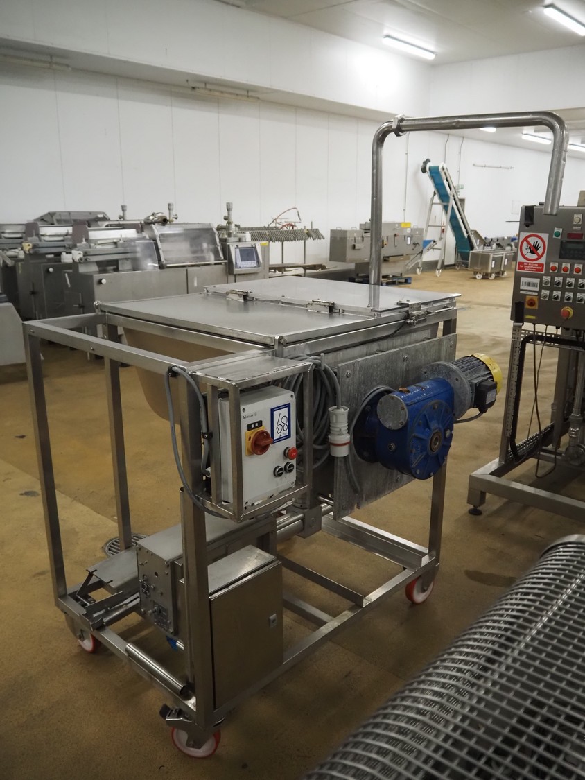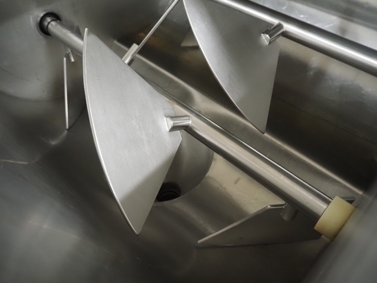 S/s mobile double shaft paddle mixer, inside dimensions: 930 mm x 850 mm x 600 mm, total dimensions: 1480 mm x 1400 mm x 2050 mm.