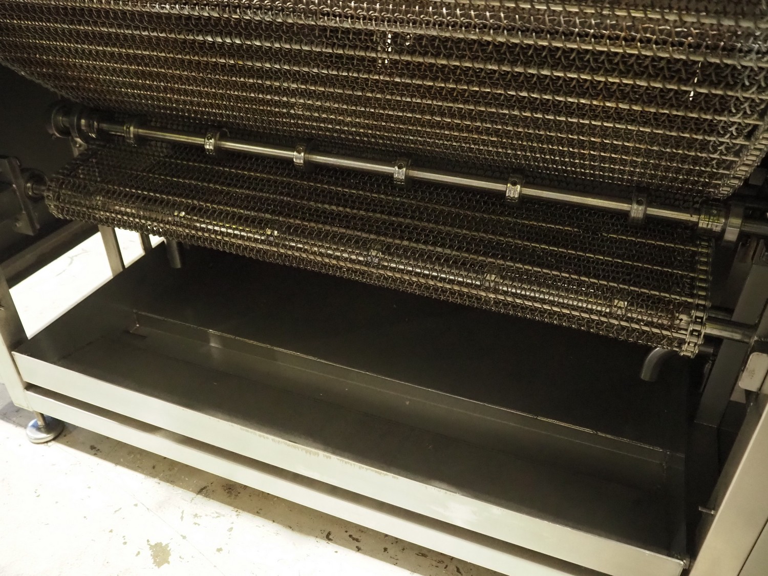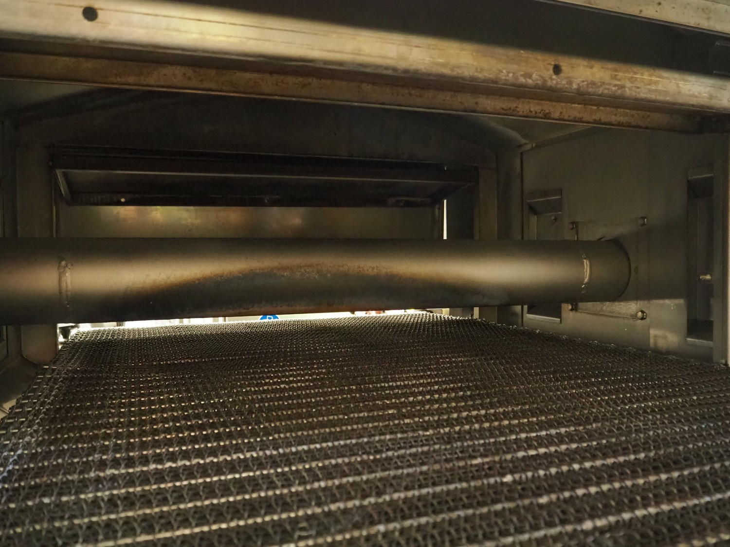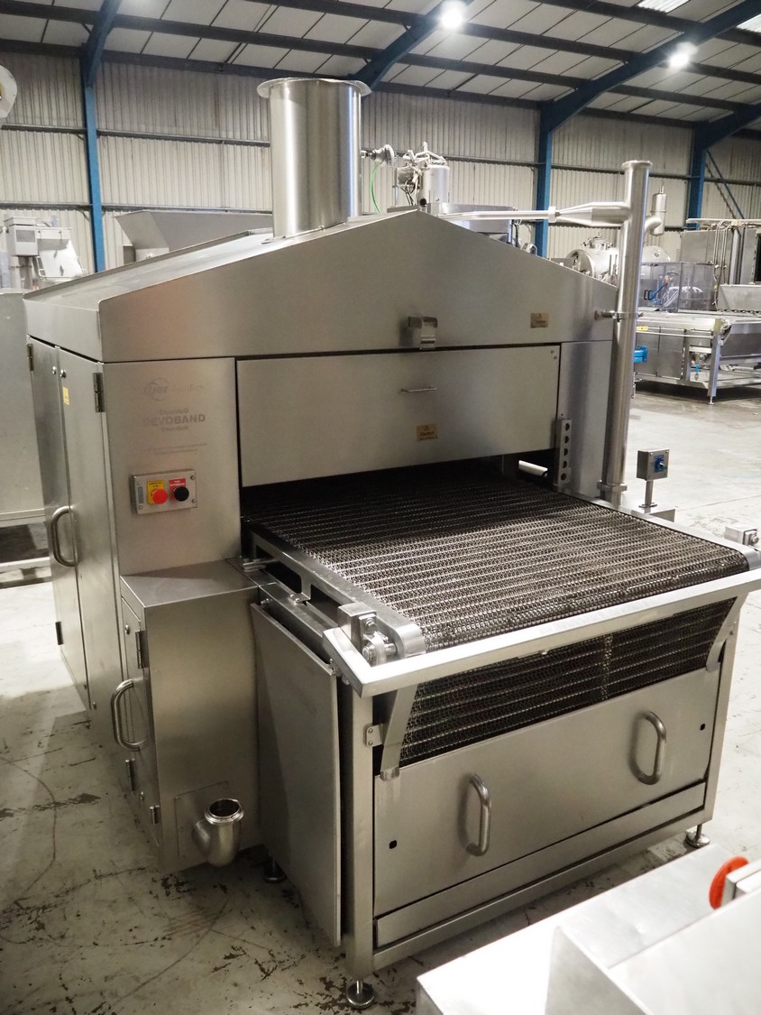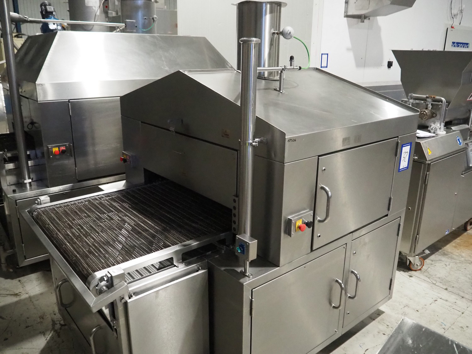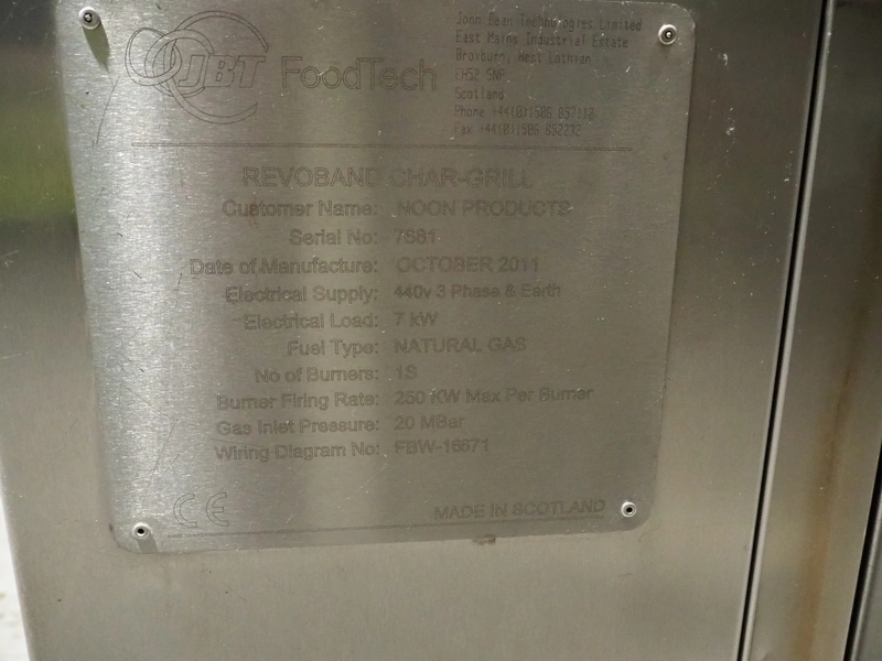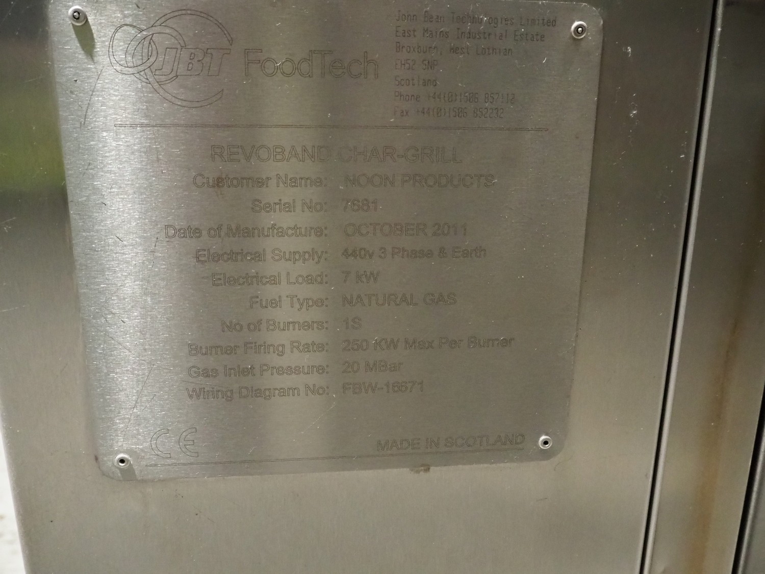 JBT FoodTech gas heated tunnel oven, model: Revoband char-grill, serial number: 7681, year of construction: October 2011, 440 V, 3 Ph, 7 kW, steel mesh belt, belt width: 1000 mm, total dimensions: 2350 mm x 2000 mm x 2400 mm.