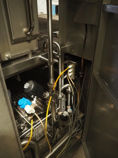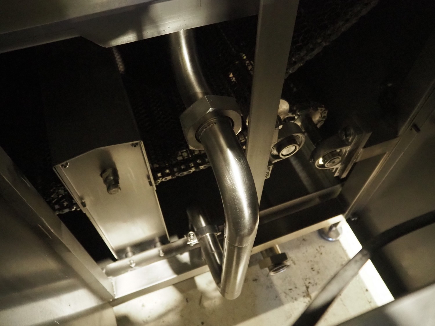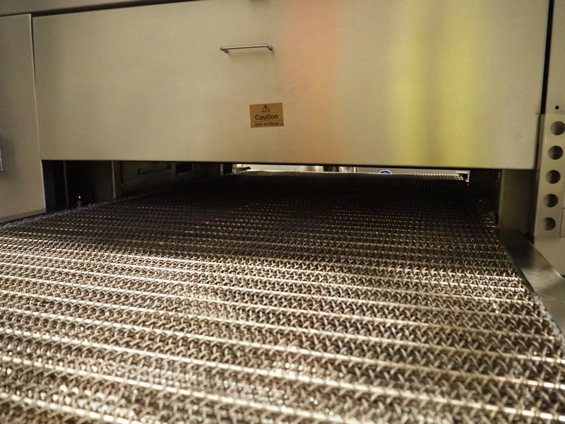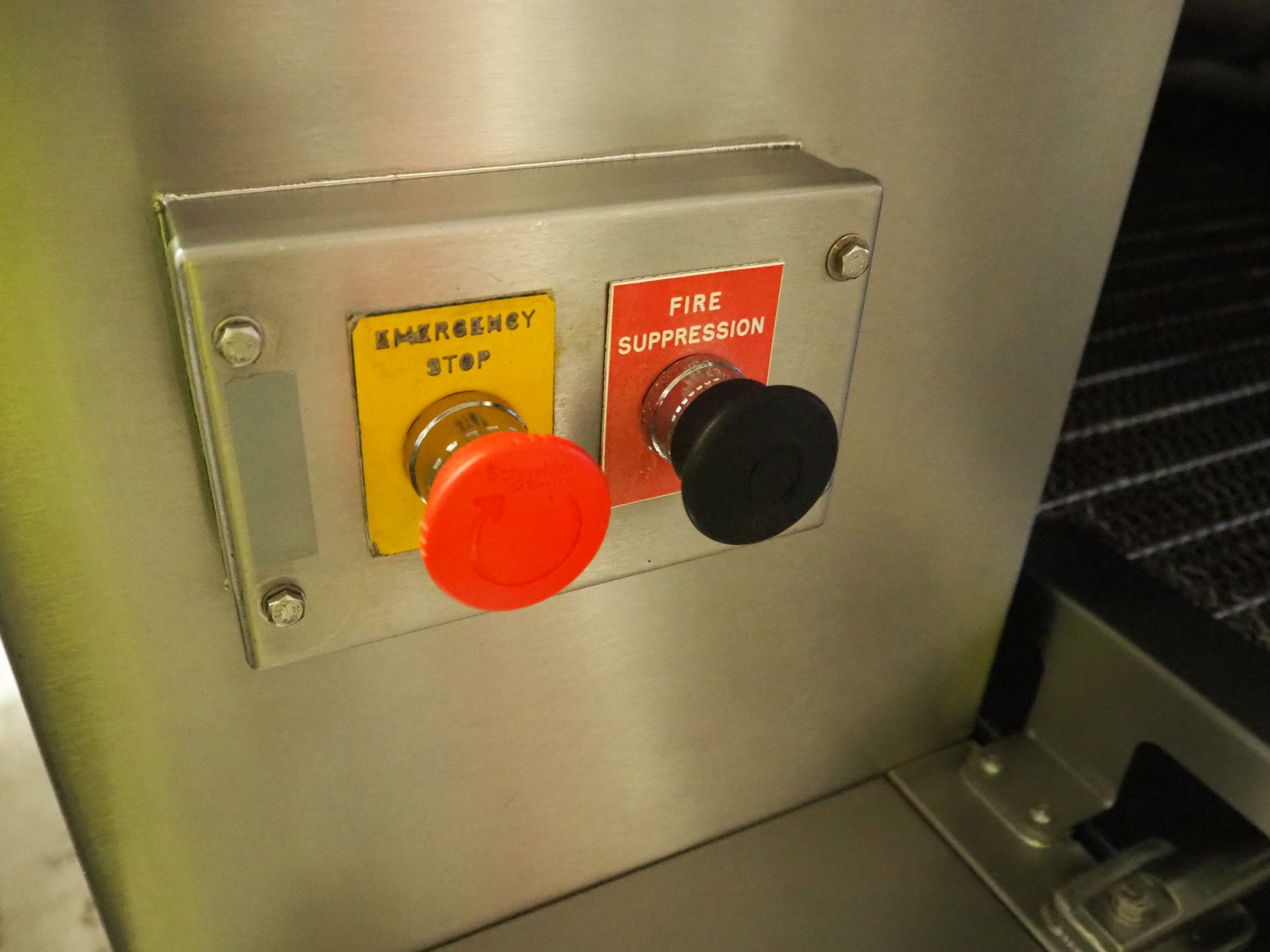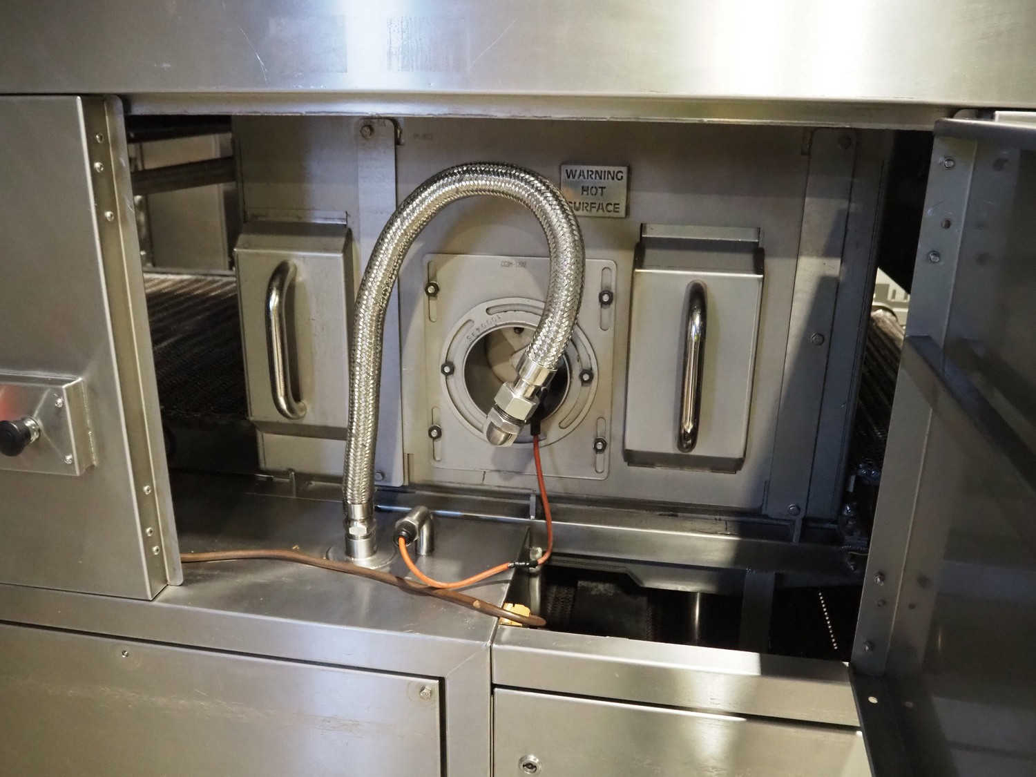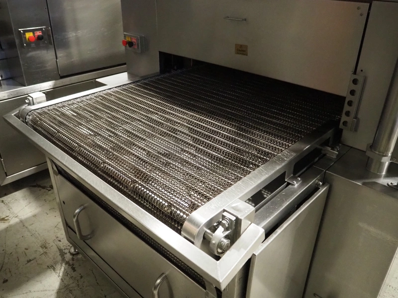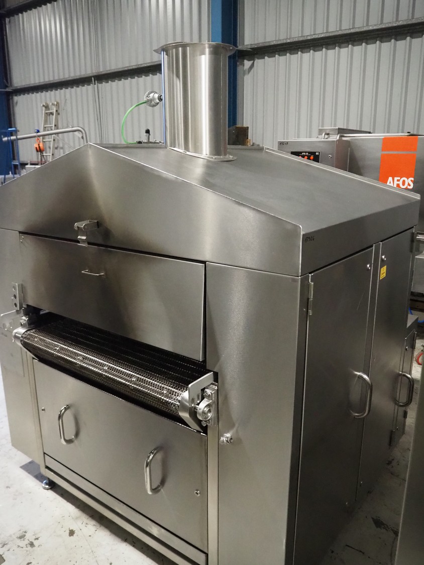 JBT FoodTech gas heated tunnel oven, model: Revoband char-grill, serial number: 7681, year of construction: October 2011, 440 V, 3 Ph, 7 kW, steel mesh belt, belt width: 1000 mm, total dimensions: 2350 mm x 2000 mm x 2400 mm.