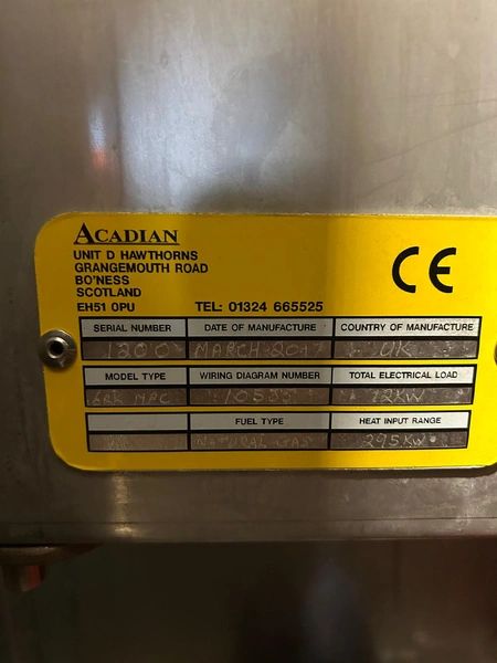 Acadian 6 rack cooker, model: 6RK MPC, serial number: 1200, year of construction: MARCH 2017, 12/295 kW, fuel type: Natural Gas, dimensions: 4700 mm x 4400 mm.