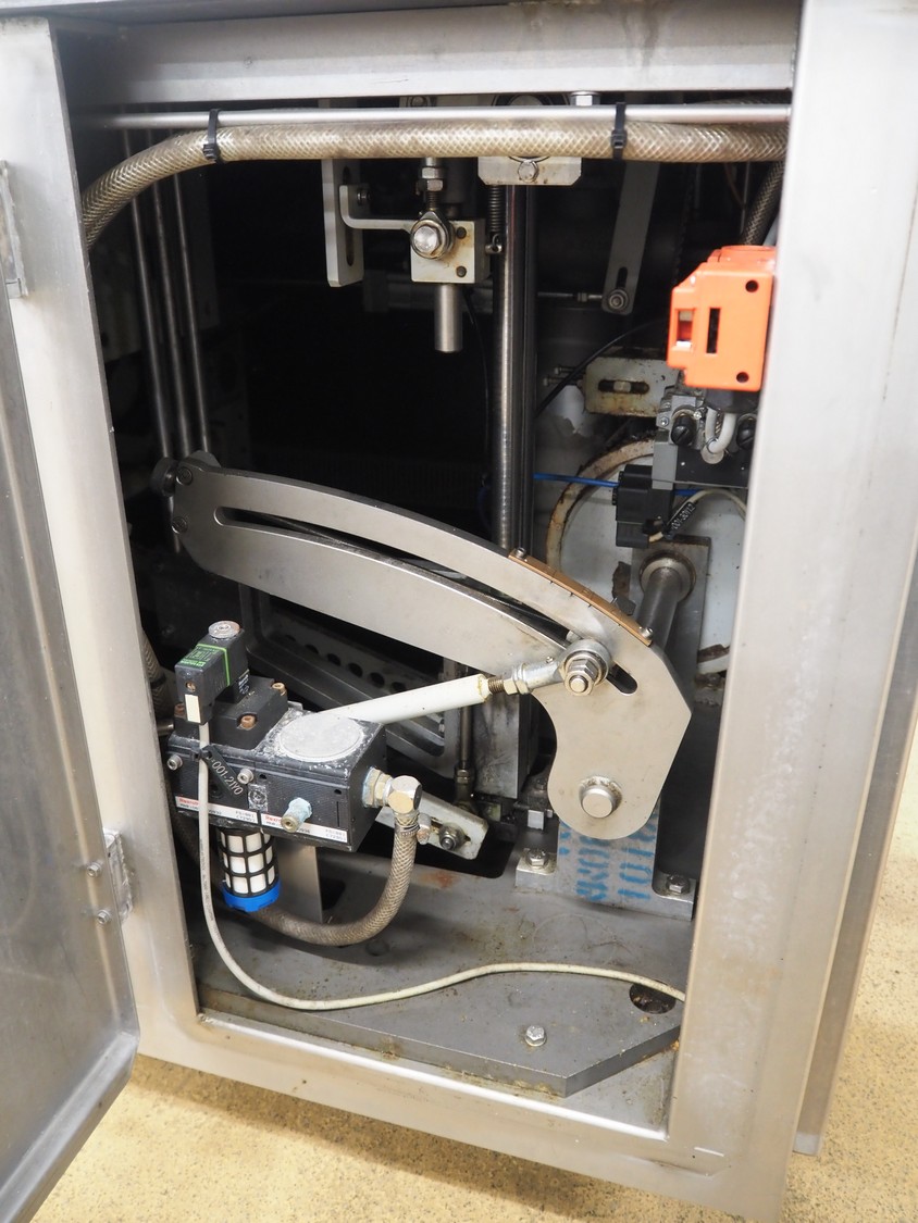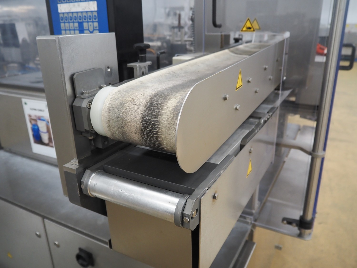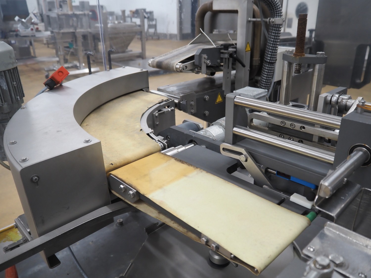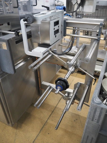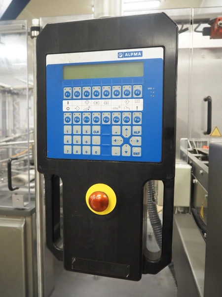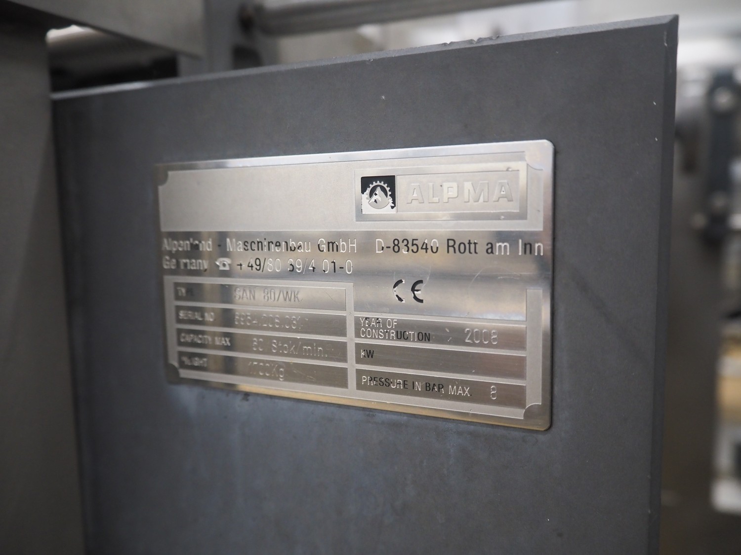 Alpma wrapping machine for individual products such as sausage, type: SAN 80/WK, serial number: 6954.208.031, year of construction: 2008, maximum capacity: 60 pieces/min, pressure in bar maximum: 8, machine weight: 1700 kg, plastic belt, belt width: 150 mm, film width: 280 mm, total dimensions: 2650 mm x 1900 mm x 2160 mm. Including pallet box and pallet with parts.