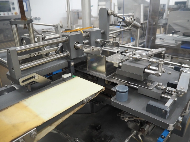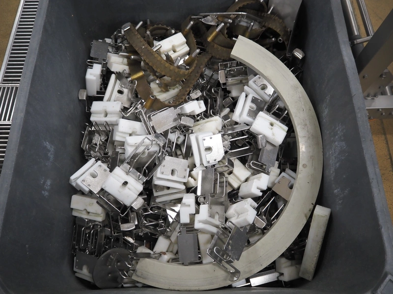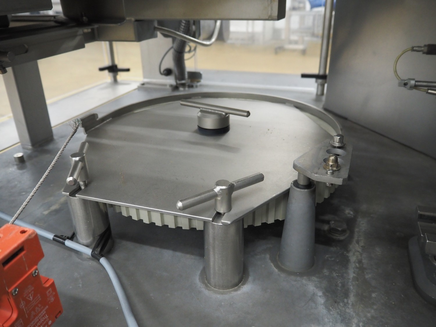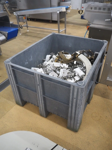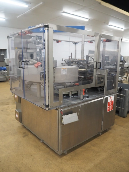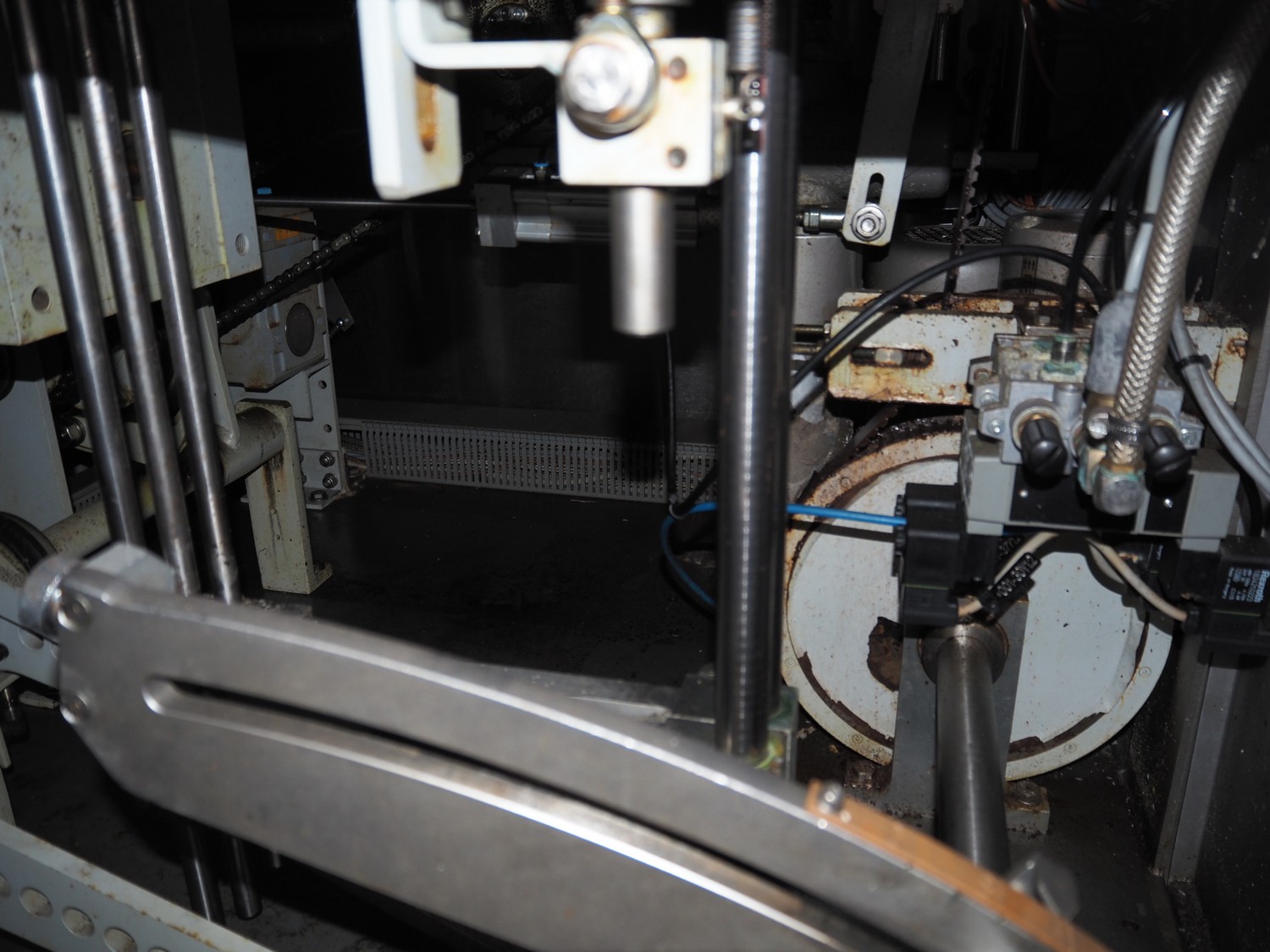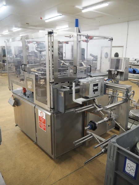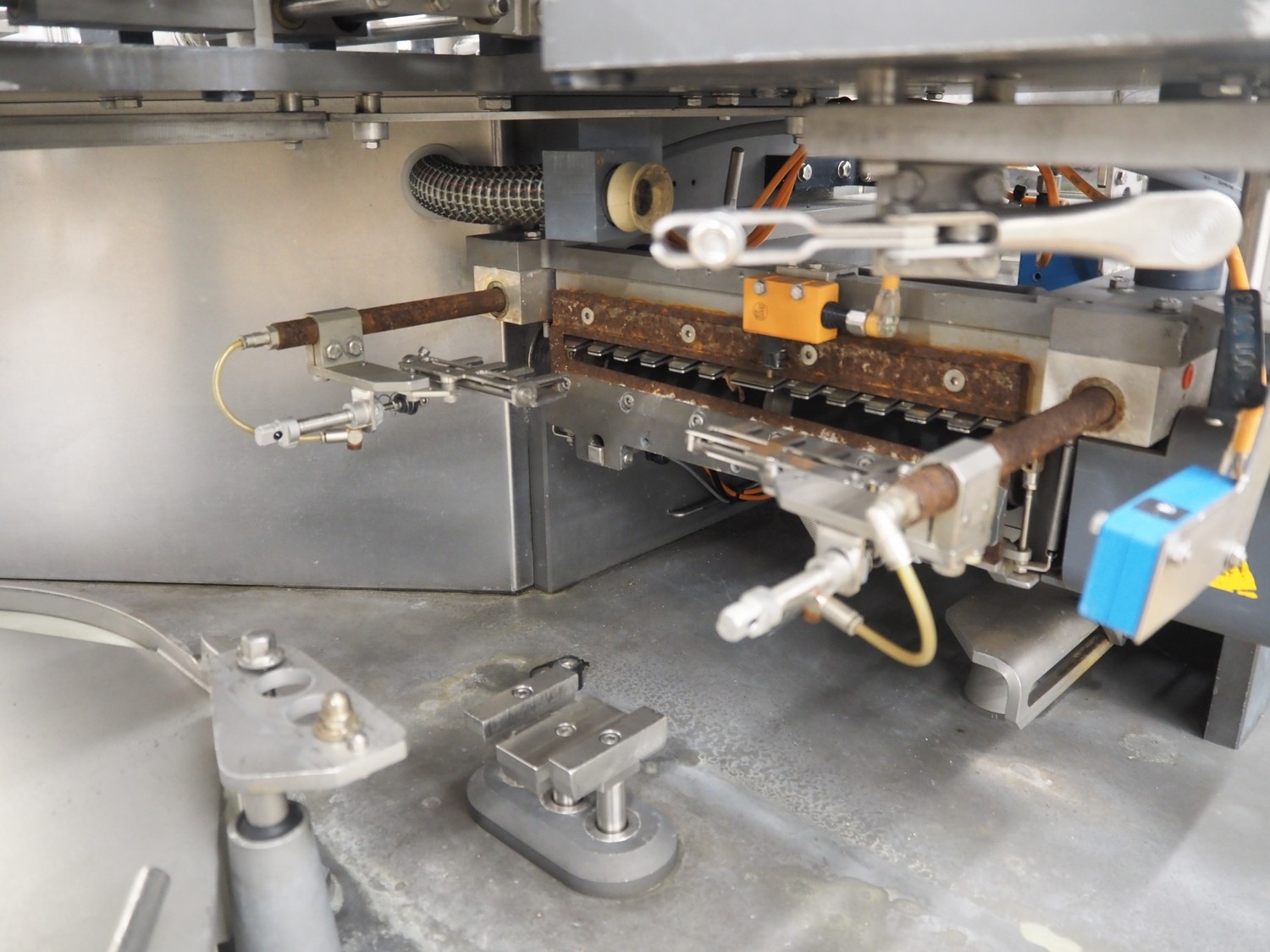 Alpma wrapping machine for individual products such as sausage, type: SAN 80/WK, serial number: 6954.208.031, year of construction: 2008, maximum capacity: 60 pieces/min, pressure in bar maximum: 8, machine weight: 1700 kg, plastic belt, belt width: 150 mm, film width: 280 mm, total dimensions: 2650 mm x 1900 mm x 2160 mm. Including pallet box and pallet with parts.