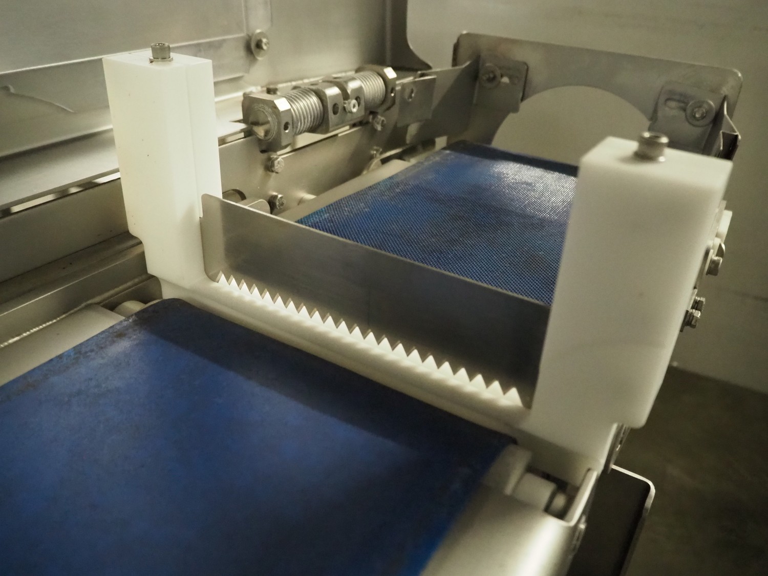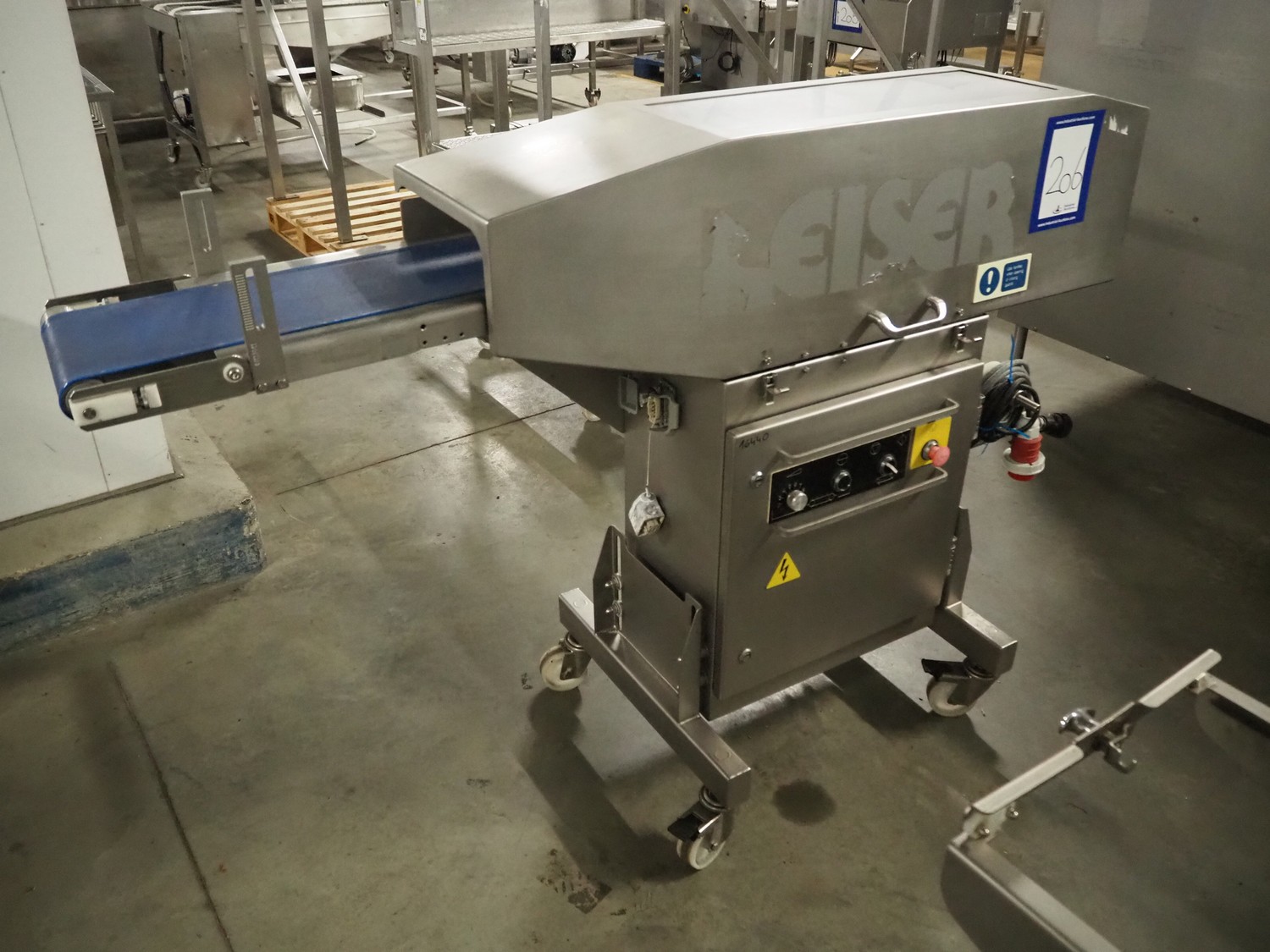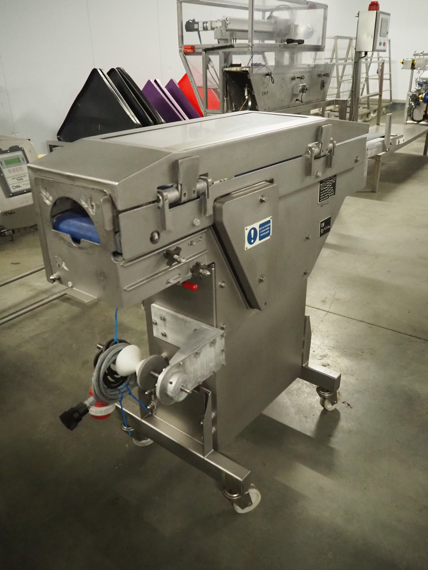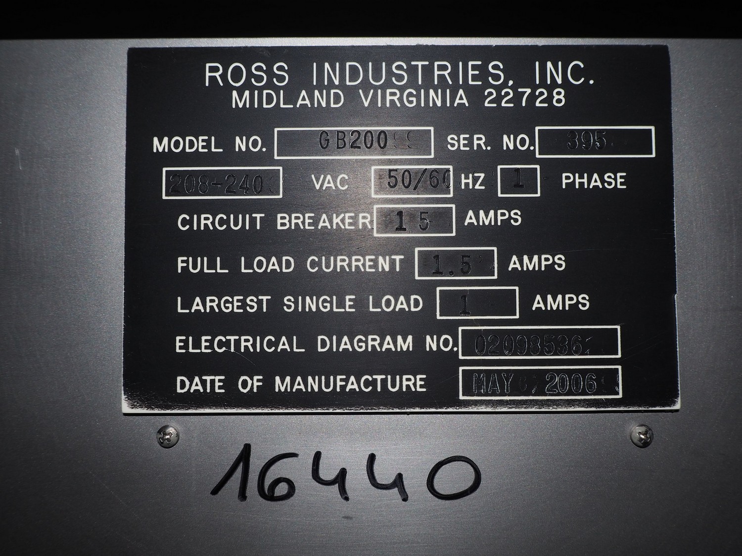 Ross Industries Inc. mobile portioning machine, model: GB200, serial number: 395, year of construction: 2006, 208-240 V, 1 Ph, 50/60 Hz, working width: 205 mm, plastic belt, belt width: 205 mm, total dimensions: 1800 mm x 650 mm x 1250 mm.