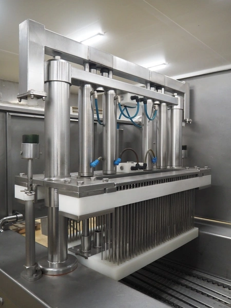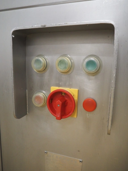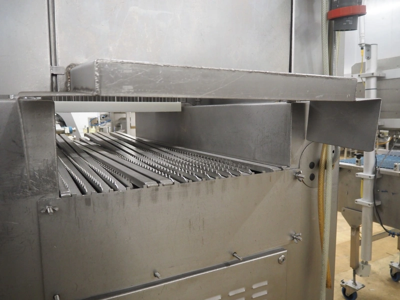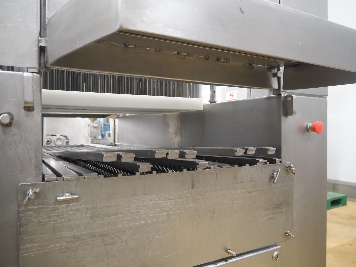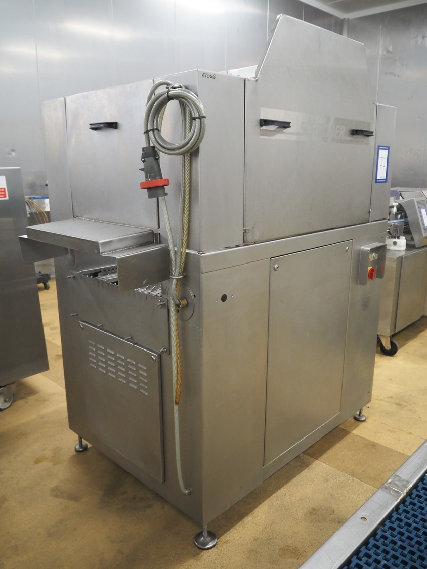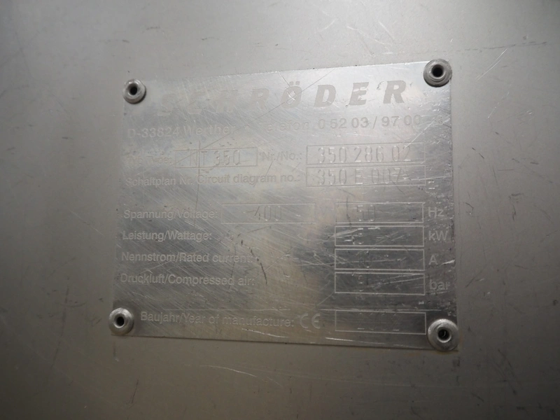 Schröder tenderizer, type: NT 350, number: 350 286 02, year of construction: 2002, 400 V, 50 Hz, 10 A, 5 kW, s/s walking beam, beam width: 640 mm, total dimensions: 1800 mm x 1350 mm x 2150 mm.