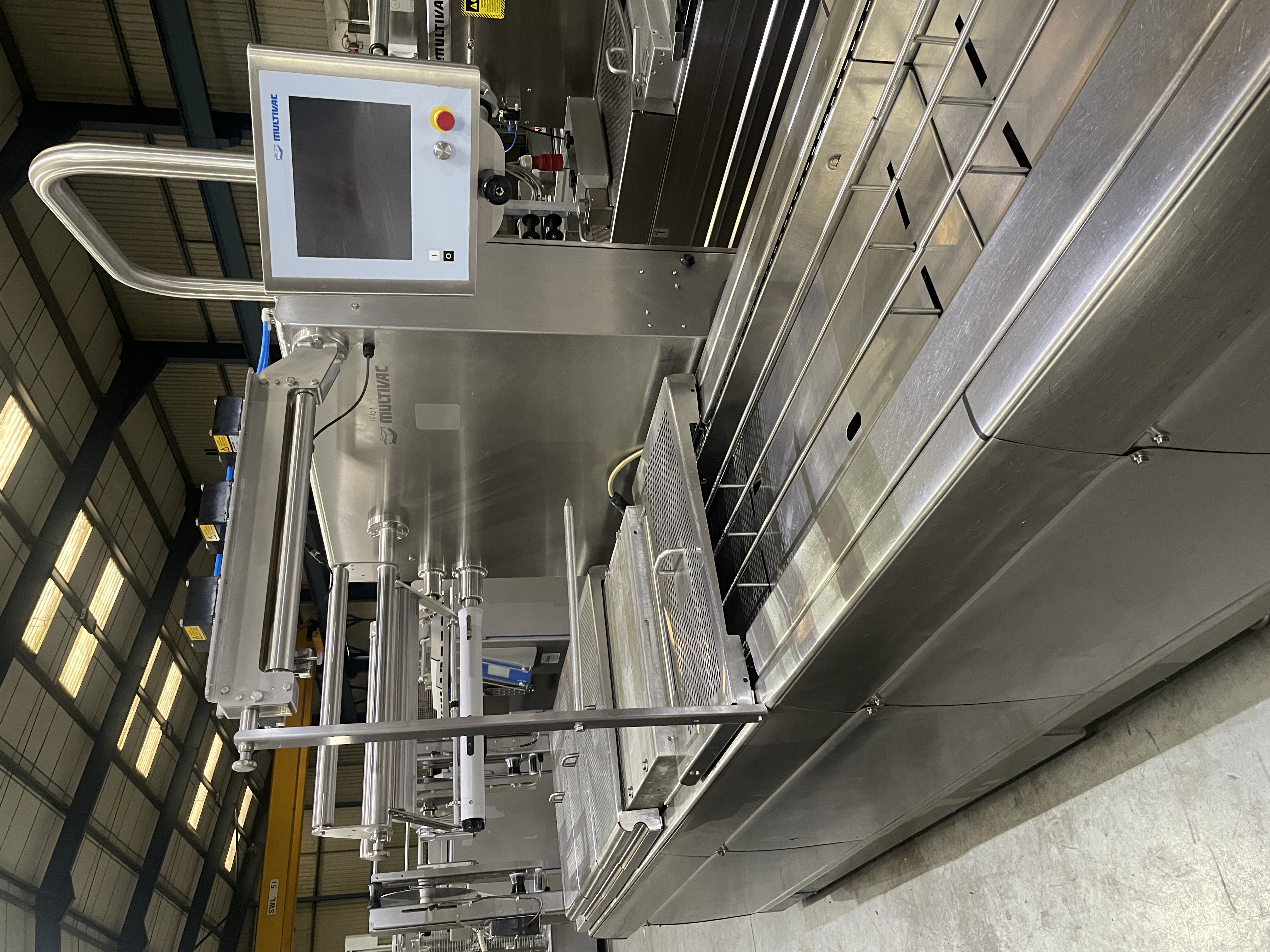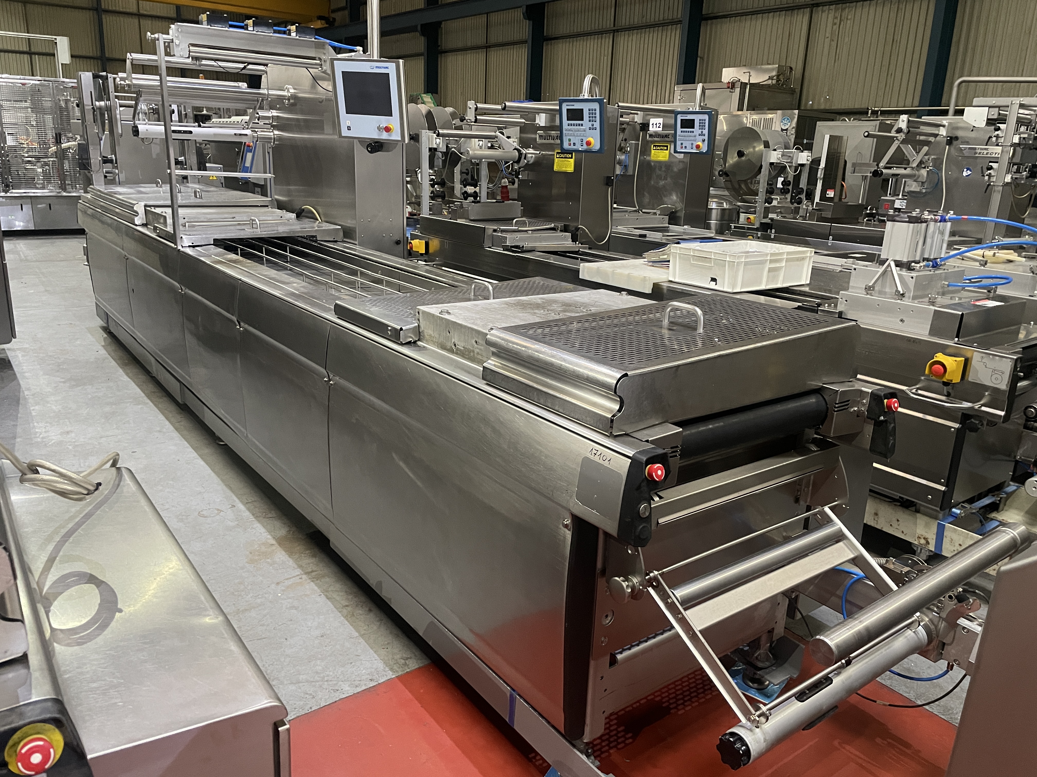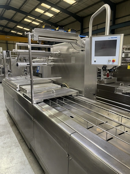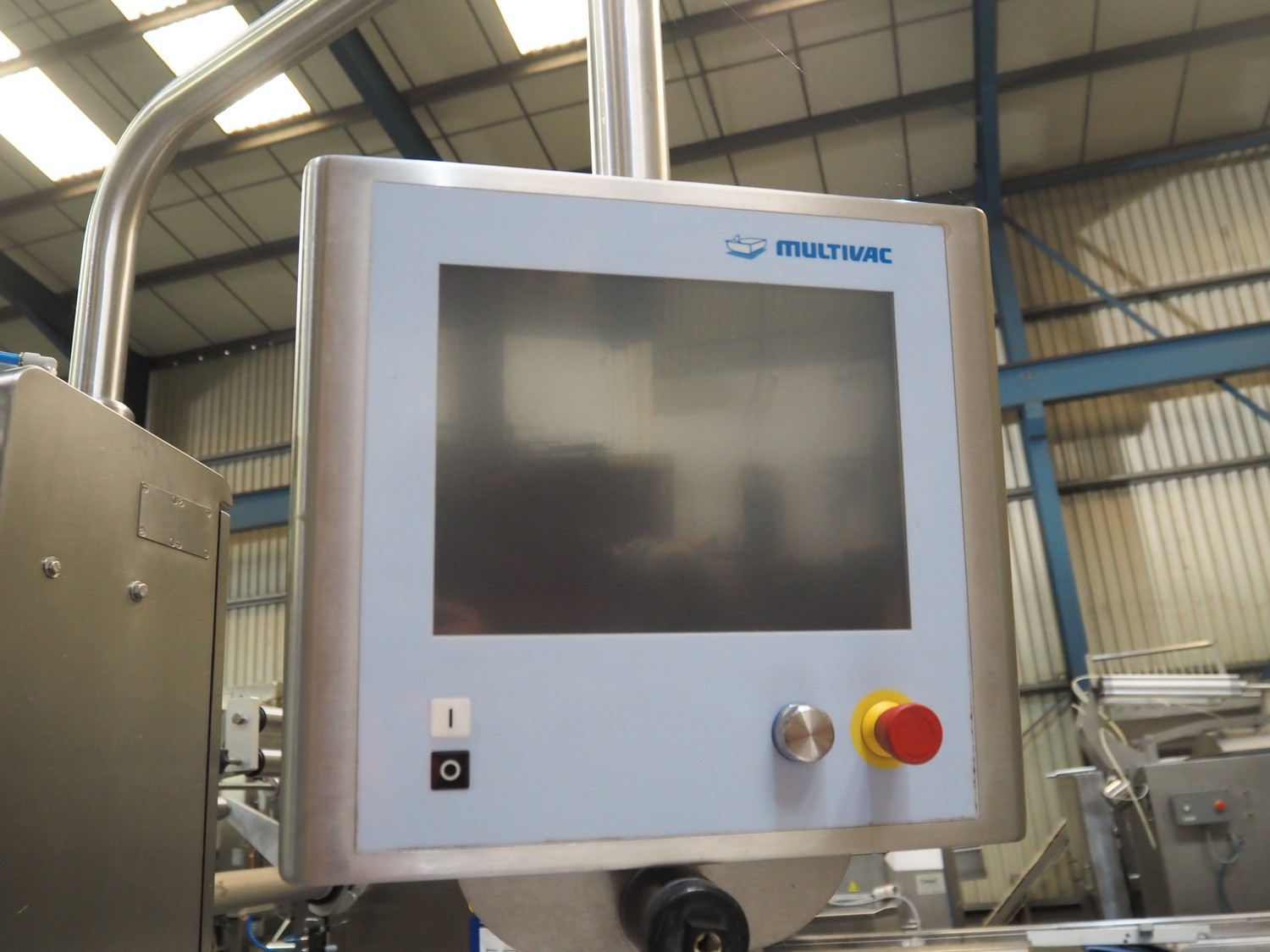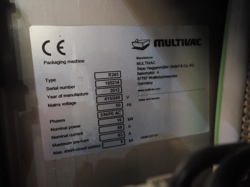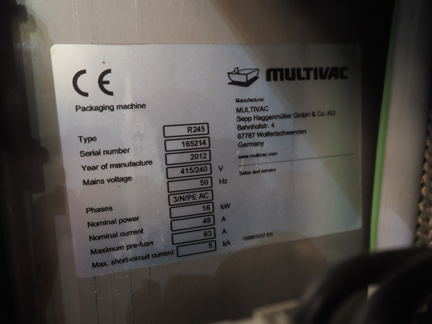 Multivac thermoformer, type: R245, serial number: 165214, year of construction: 2012, 415/240 V, 3 Ph, 50 Hz, 48/63 A, 16 kW, film width: 600 mm, dye: (8x) 210 mm x 115 mm, belt width: 530 mm, index: 510 mm, plastic mesh belt, belt width: 520 mm, total dimensions: 6950 mm x 1250 mm x 2260 mm.