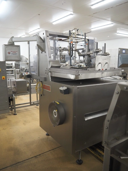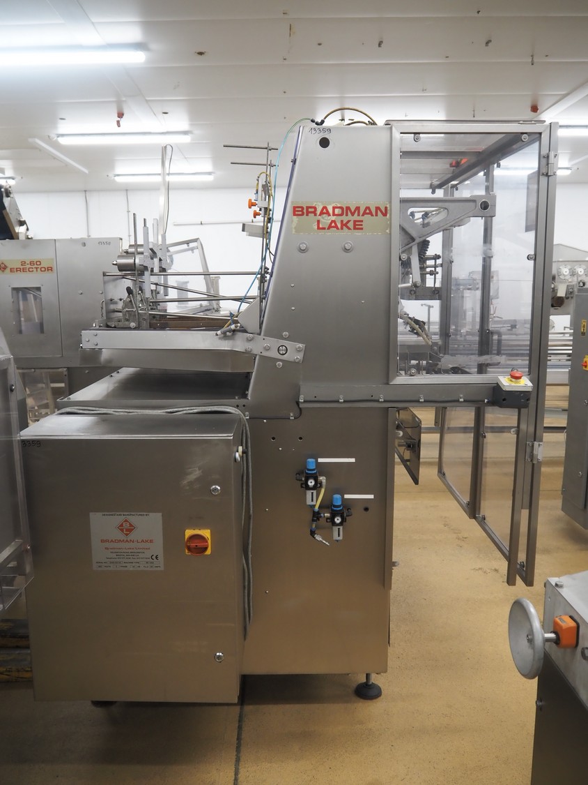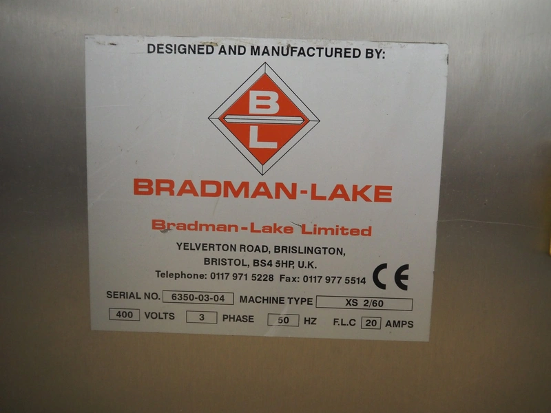 Bradman Lake tray erector, machine type: XS 2/60, serial number: 6350-03-04, 400 V, 3 Ph, 50 Hz, 20 A, total dimensions: 1600 mm x 1800 mm x 2040 mm.