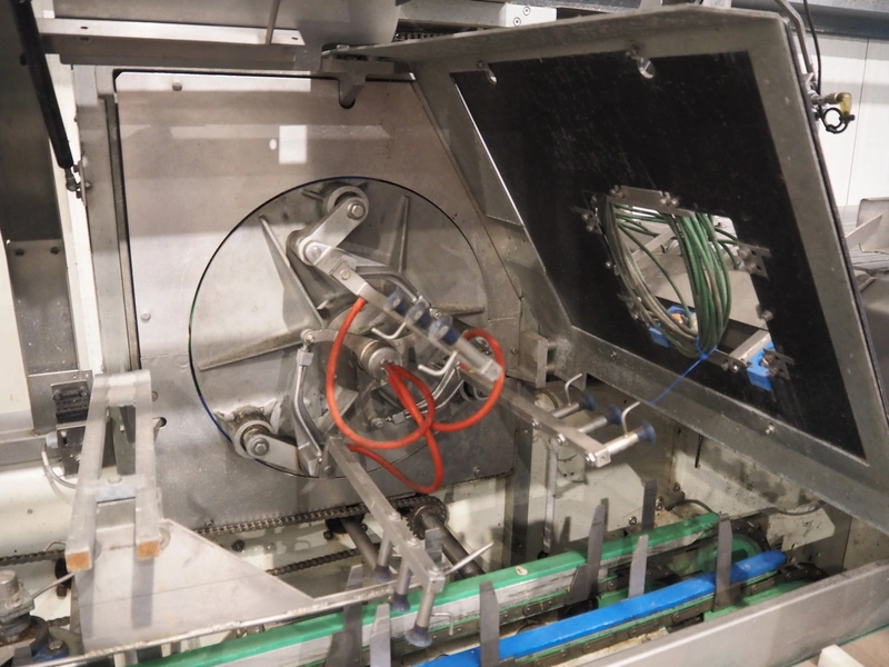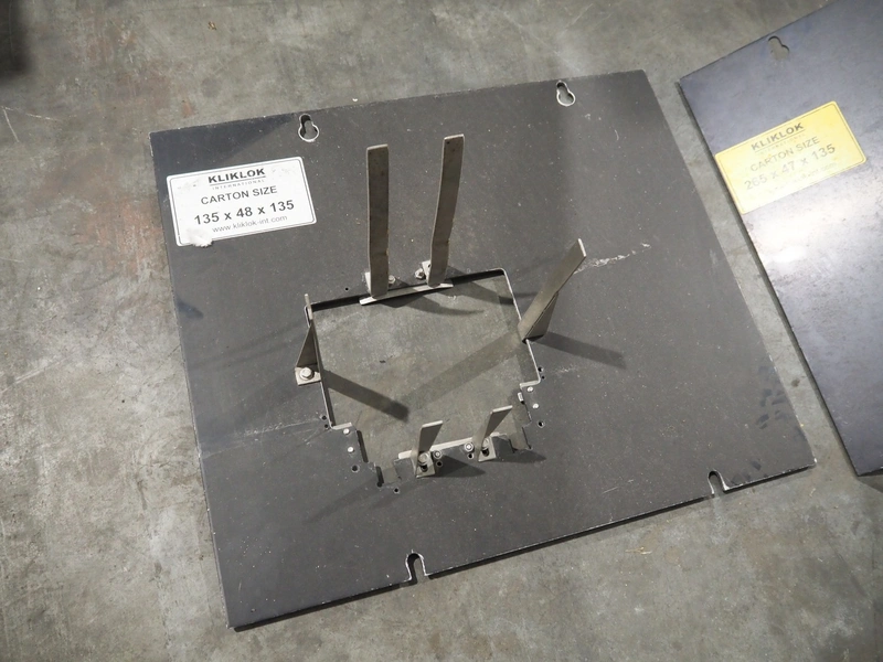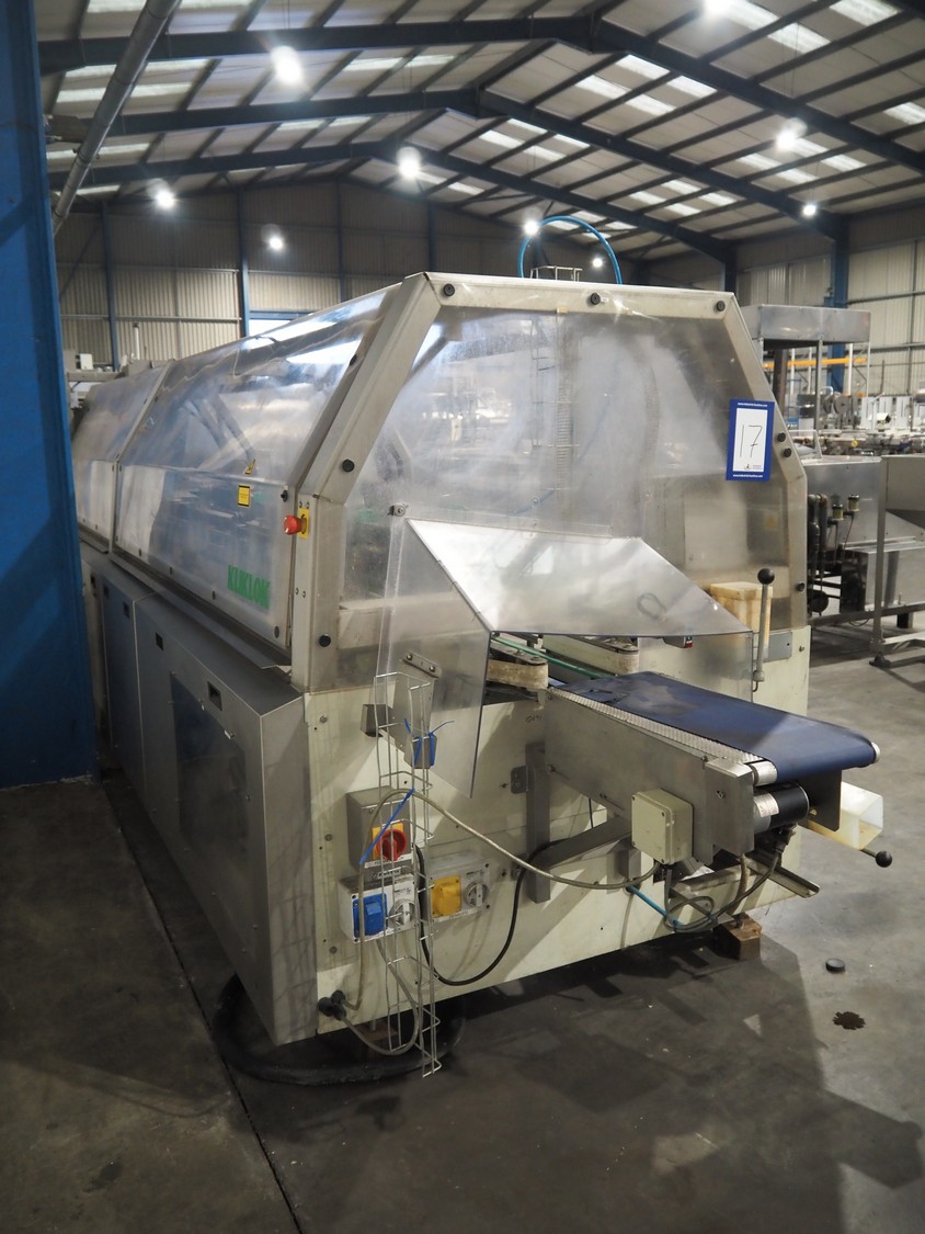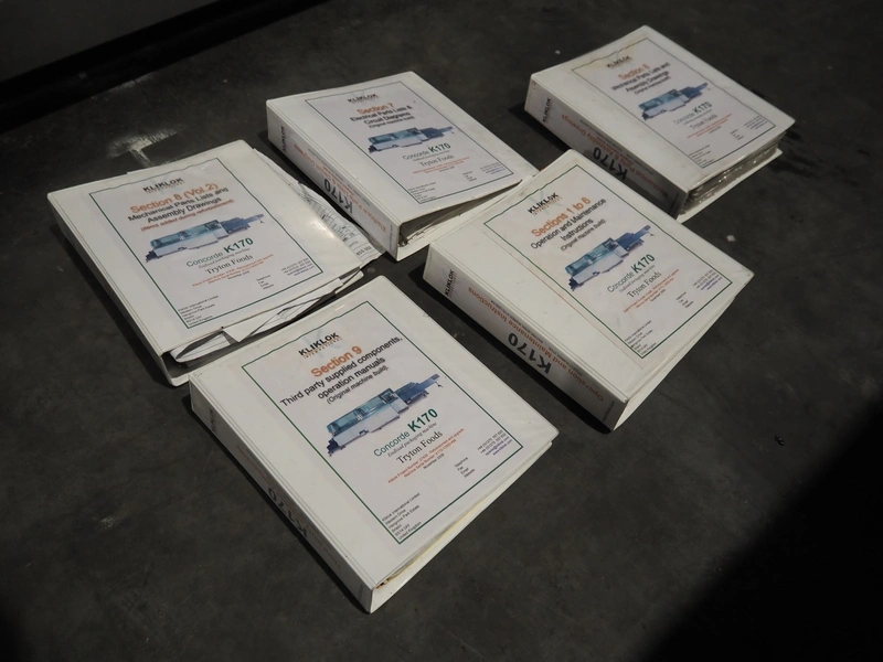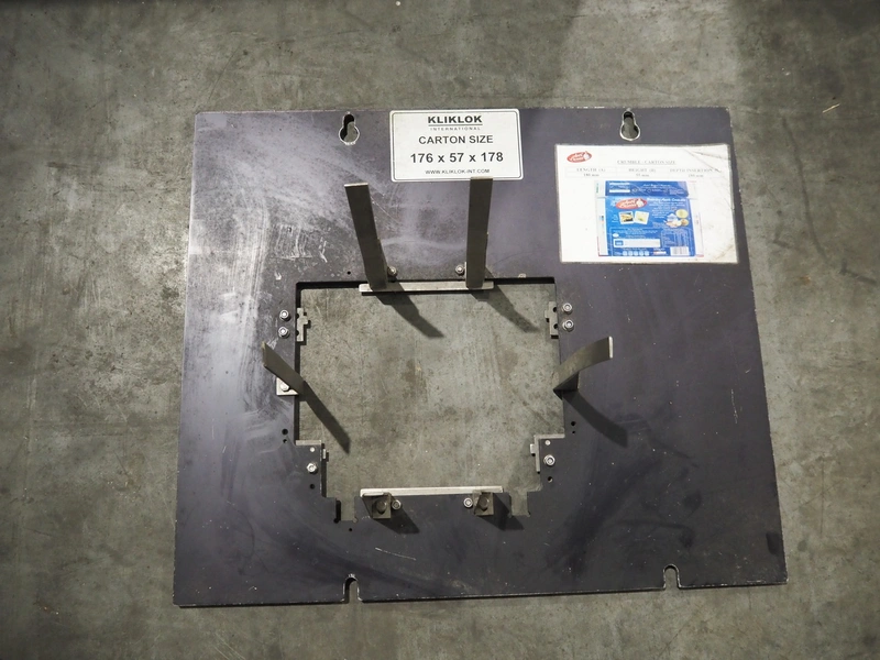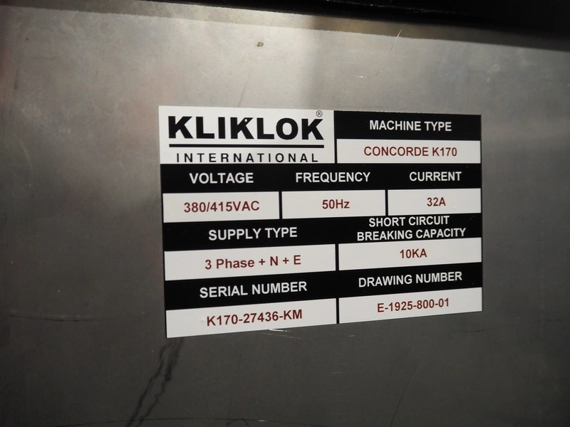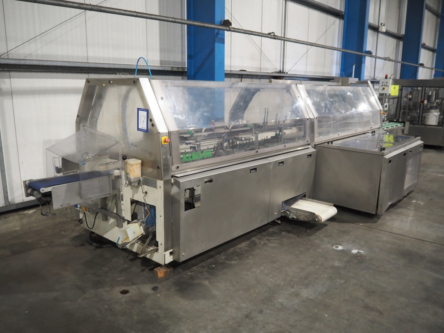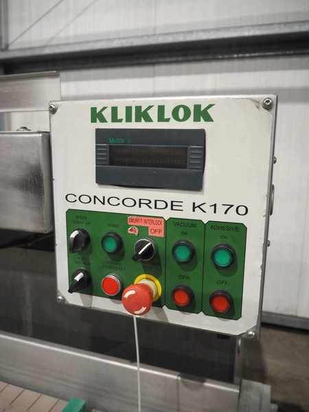 Kliklok cartoner, type: Concorde K170, serial number: K170-27436-KM, year of construction: 1997, 380/415 V, 3 Ph, 50 Hz, 32 A, 10 KA, maximum carton size: 184 mm x 45 mm x 184 mm, plastic belt, belt width: 350 mm, total dimensions: 9300 mm x 2620 mm x 2200 mm.