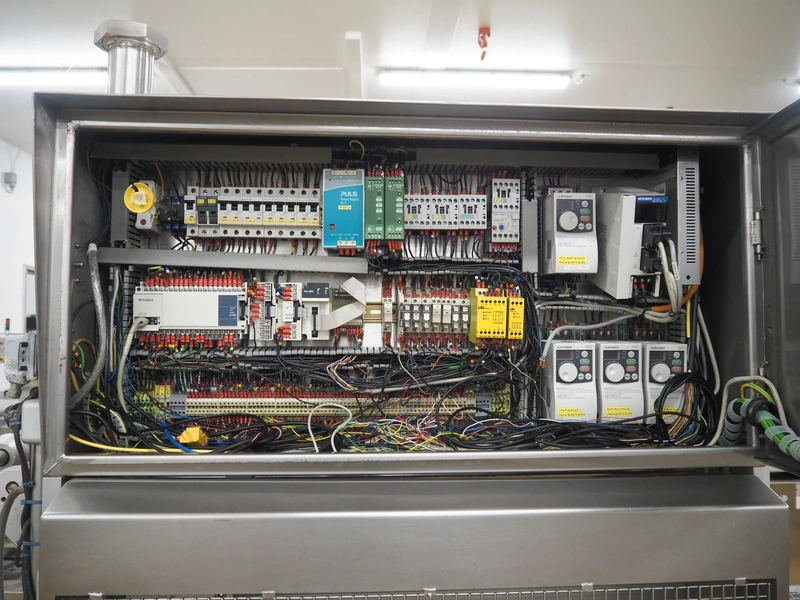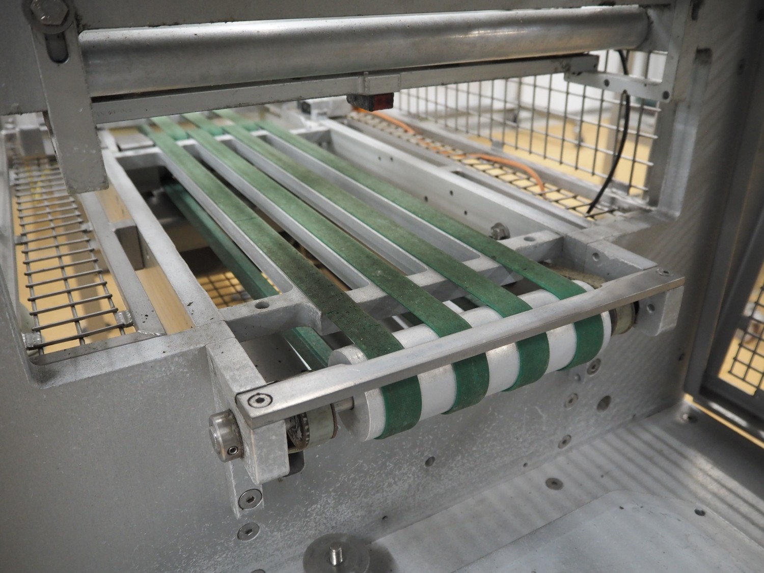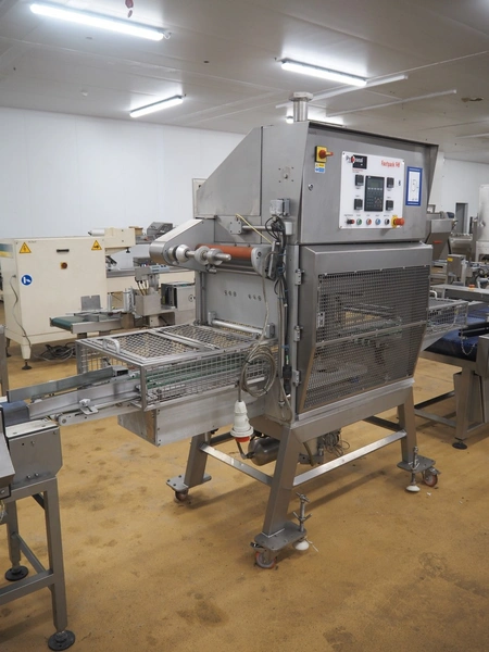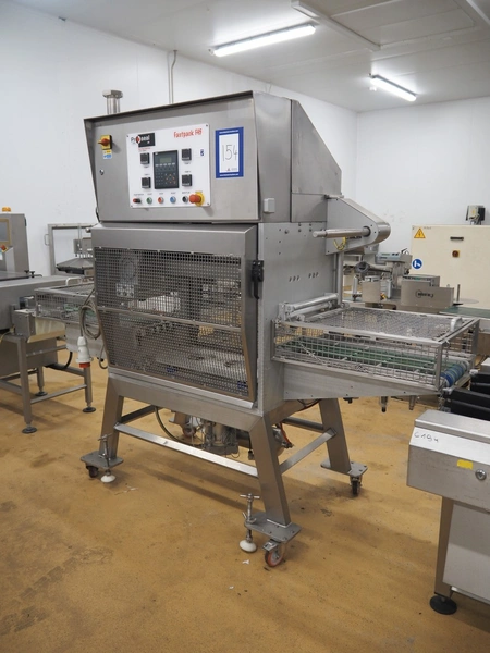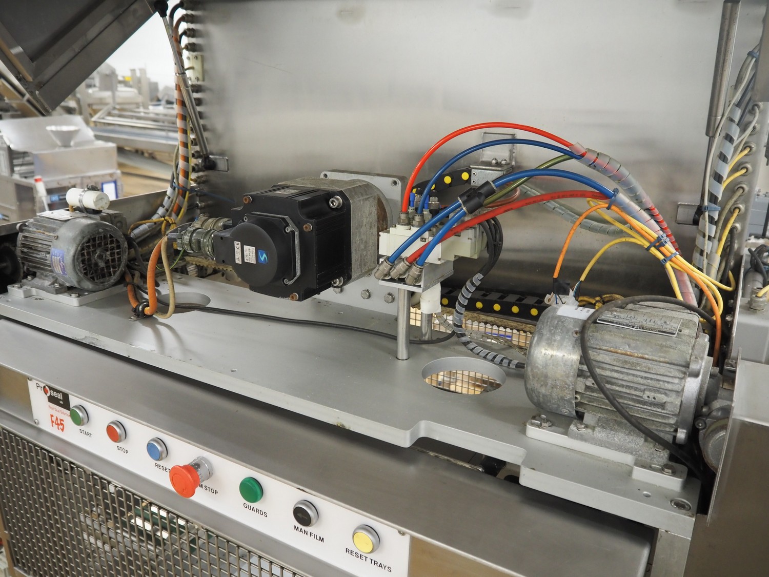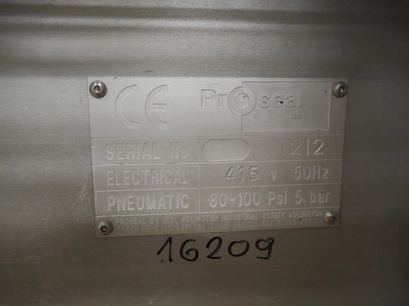 Proseal UK Ltd. mobile traysealer, type: Fastpack F45, serial number: 1212, 415 V, 50 Hz, plastic wire belt, belt width: 180 mm, total dimensions: 1850 mm x 900 mm x 2150 mm. Without dye.