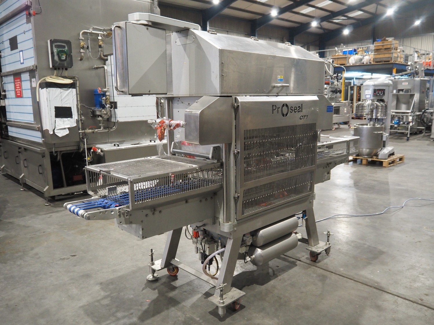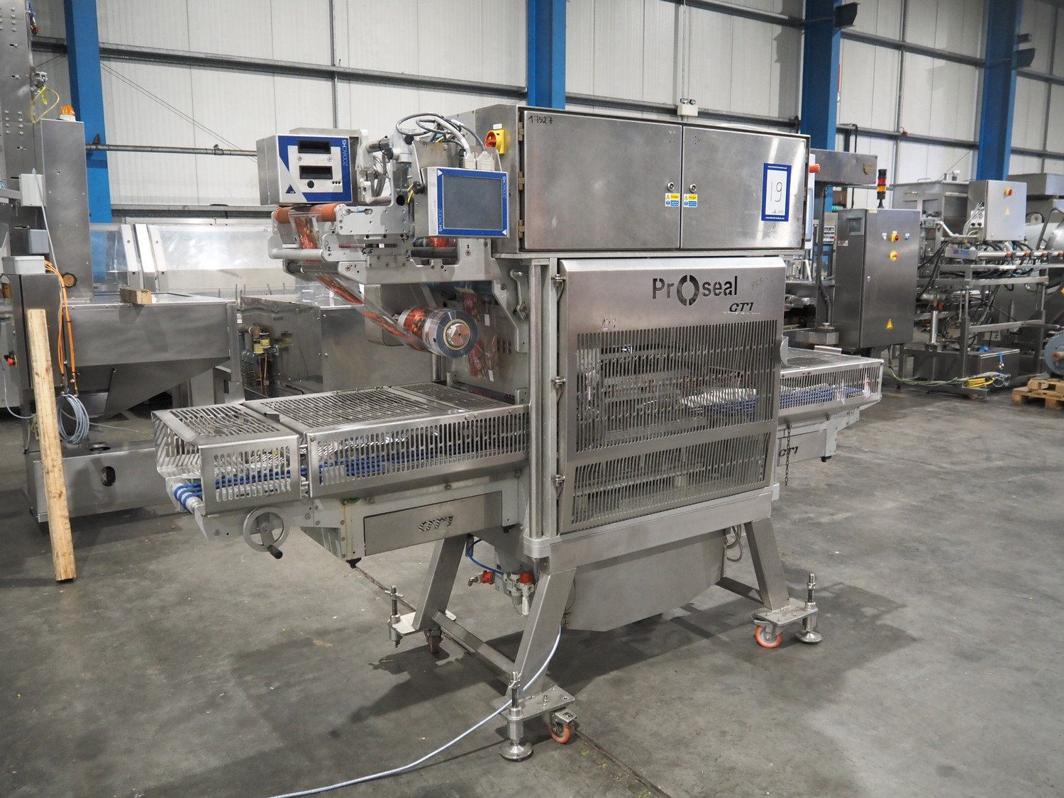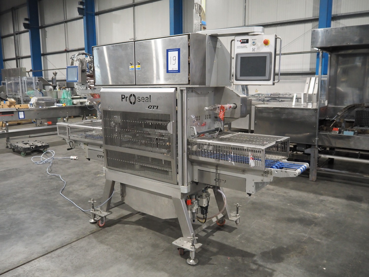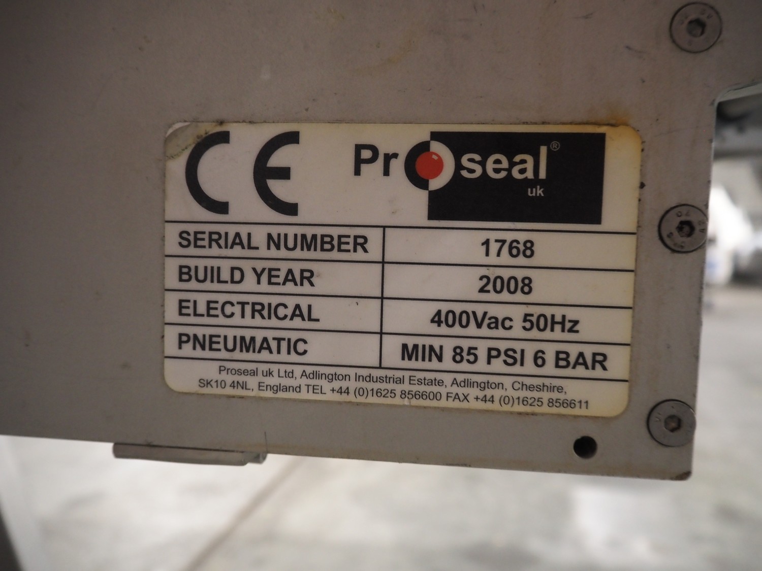 Proseal UK Ltd. mobile traysealer, model: GT1, serial number: 1768, year of construction: 2008, 400 V, 50 Hz, pneumatic minimum: 85 Psi, 6 bar, plastic wire belt, belt width: 130 mm, clearance: 545 mm x 170 mm, dye: (3x) 195 mm x 150 mm, film width: 255 mm, total dimensions: 3000 mm x 950 mm x 1950 mm.