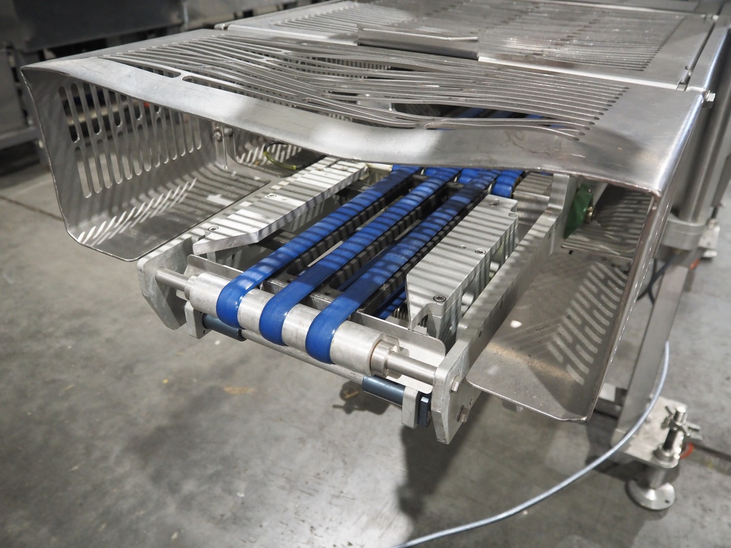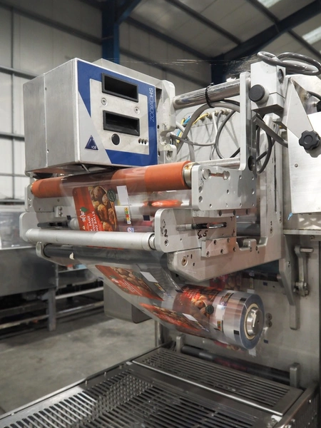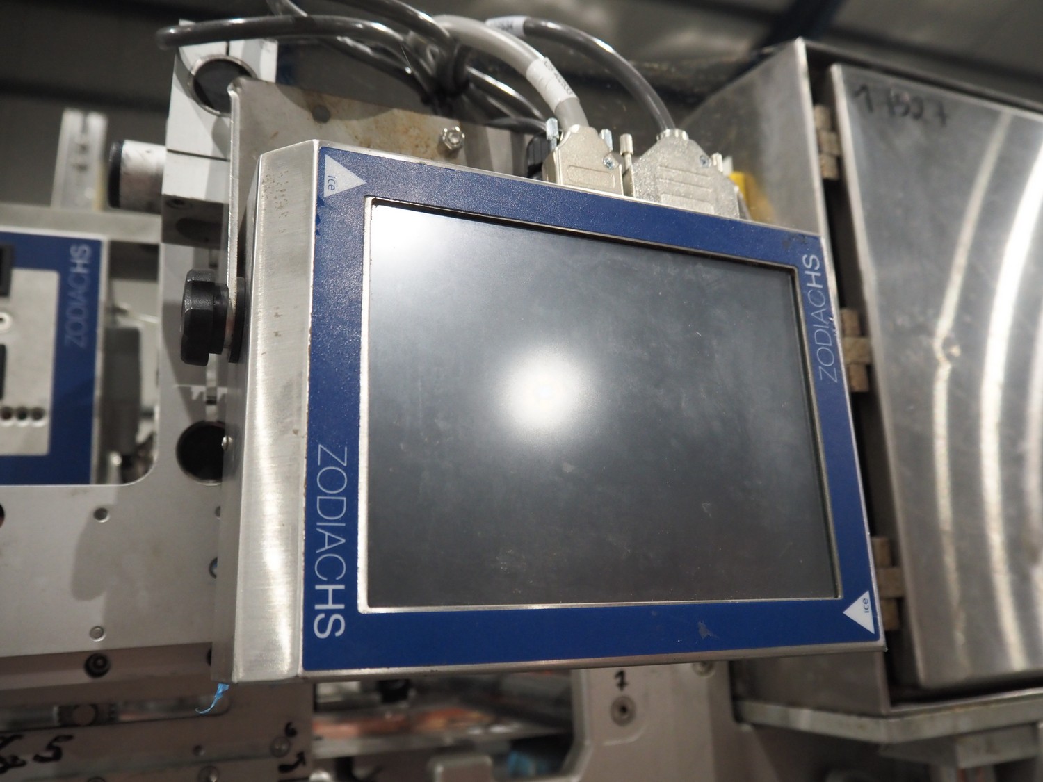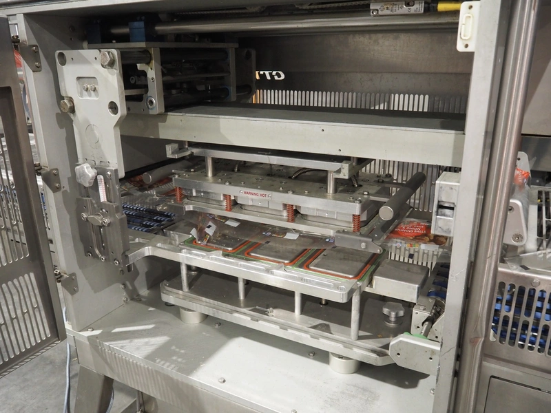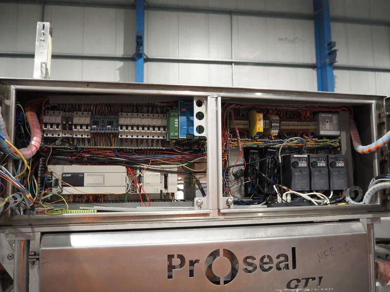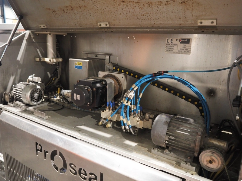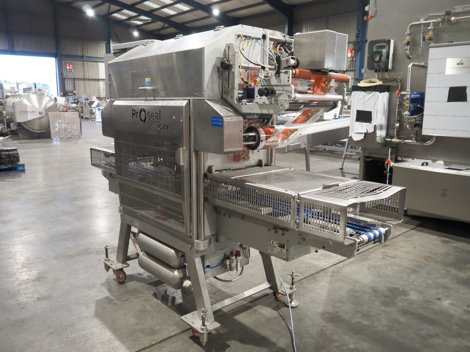Proseal UK Ltd. mobile traysealer, model: GT1, serial number: 1768, year of construction: 2008, 400 V, 50 Hz, pneumatic minimum: 85 Psi, 6 bar, plastic wire belt, belt width: 130 mm, clearance: 545 mm x 170 mm, dye: (3x) 195 mm x 150 mm, film width: 255 mm, total dimensions: 3000 mm x 950 mm x 1950 mm.
