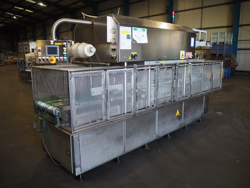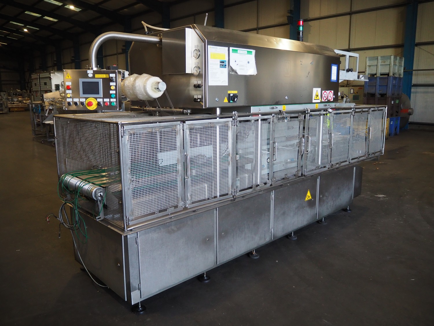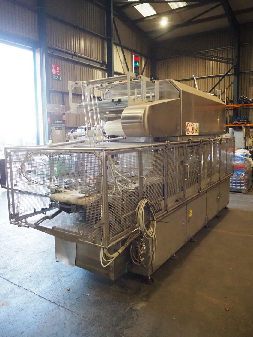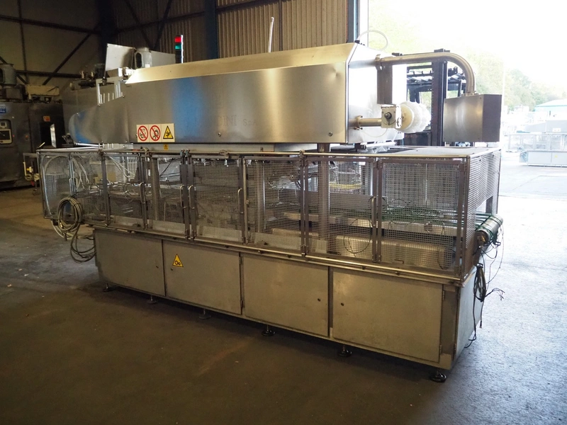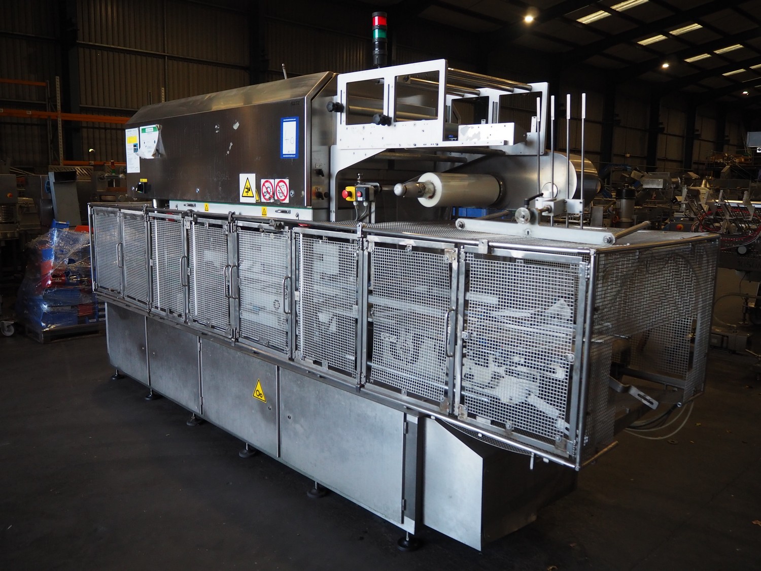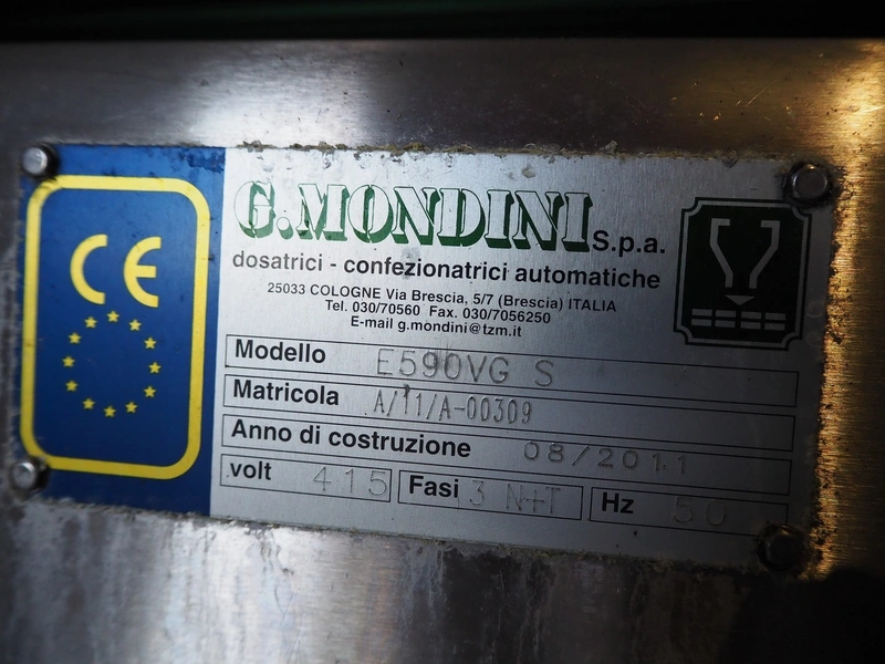 G. Mondini S.p.a. traysealer, model: E 590 VGS, serial number: A/11/A-00309, year of construction: 08/2011, 415 V, 3 Ph, 50 Hz, dyes: (8x) 220 mm x 125 mm, plastic belt, belt width: 480 mm, film width: 460 mm, clearance: 600 mm x 250 mm, total dimensions: 4200 mm x 1200 mm x 2540 mm.