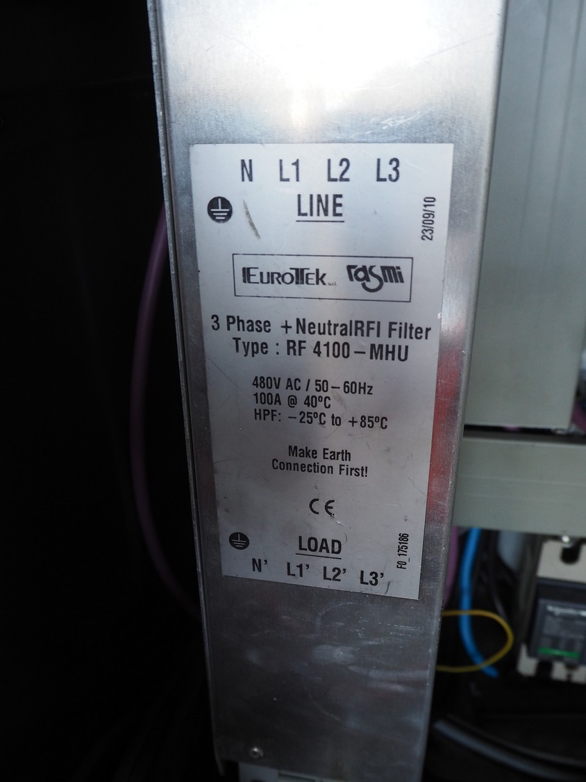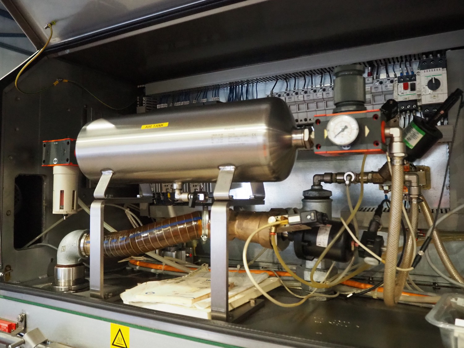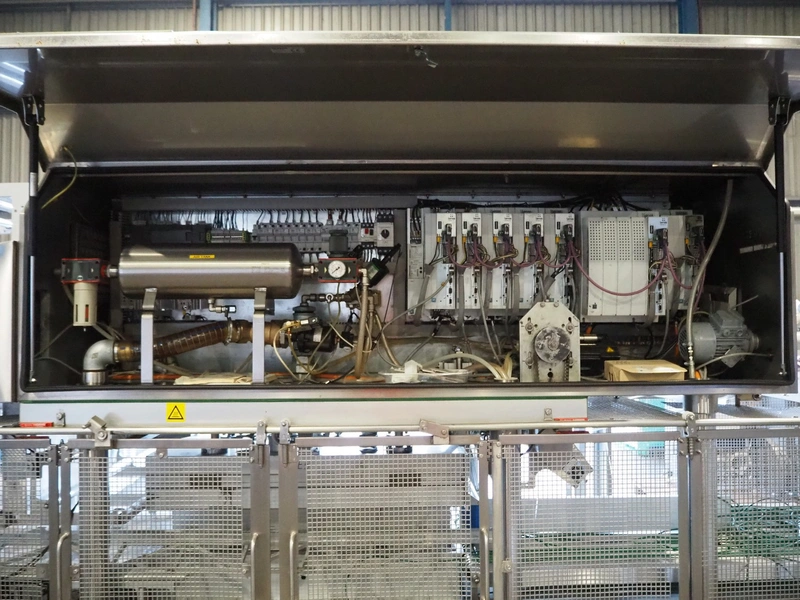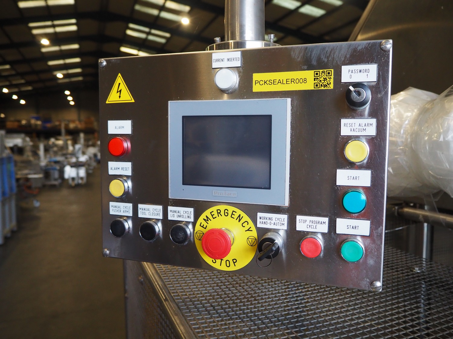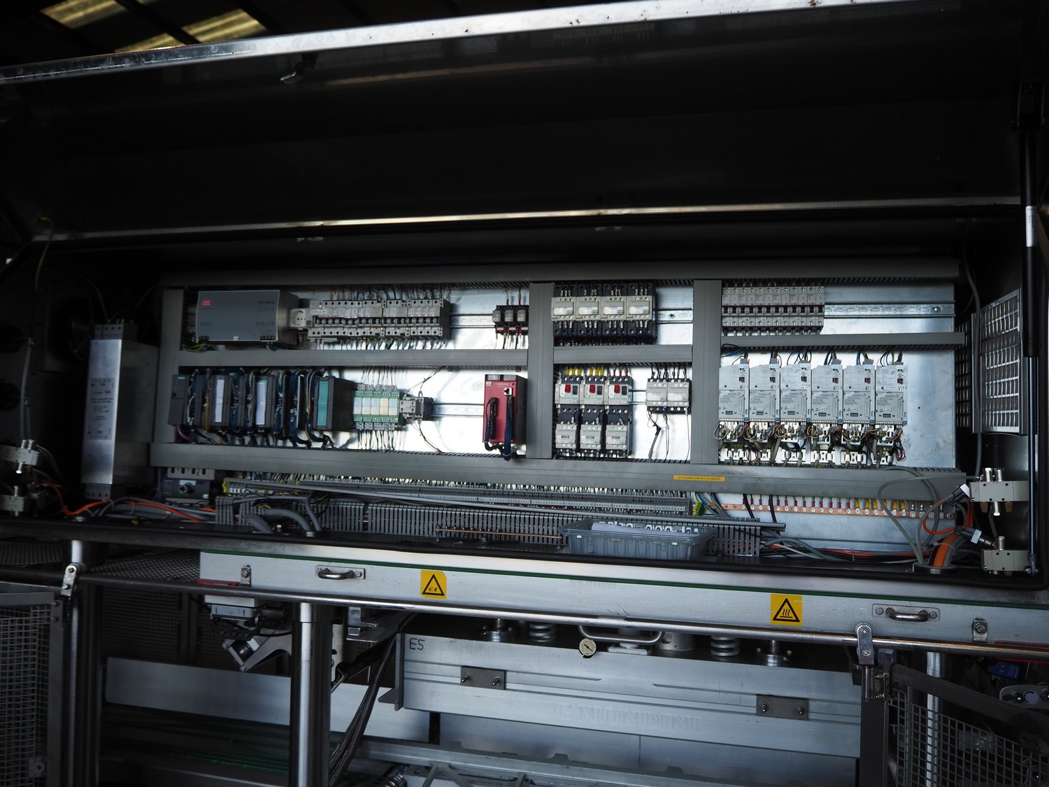G. Mondini S.p.a. traysealer, model: E 590 VGS, serial number: A/11/A-00309, year of construction: 08/2011, 415 V, 3 Ph, 50 Hz, dyes: (8x) 220 mm x 125 mm, plastic belt, belt width: 480 mm, film width: 460 mm, clearance: 600 mm x 250 mm, total dimensions: 4200 mm x 1200 mm x 2540 mm.