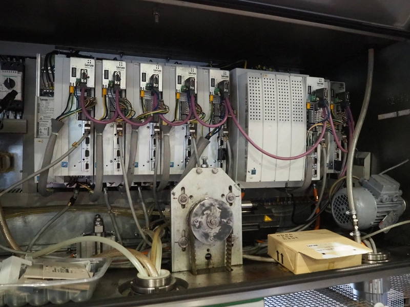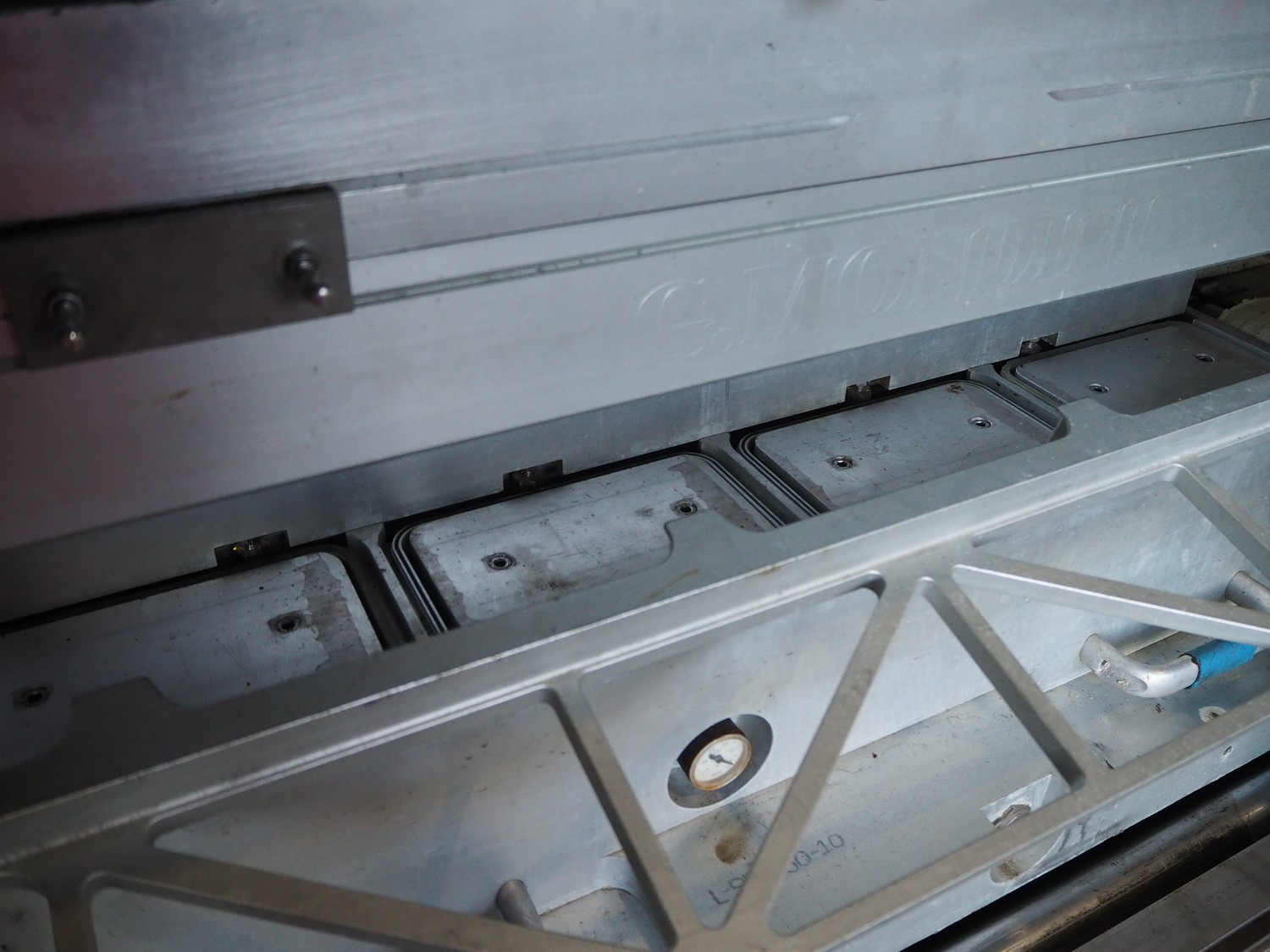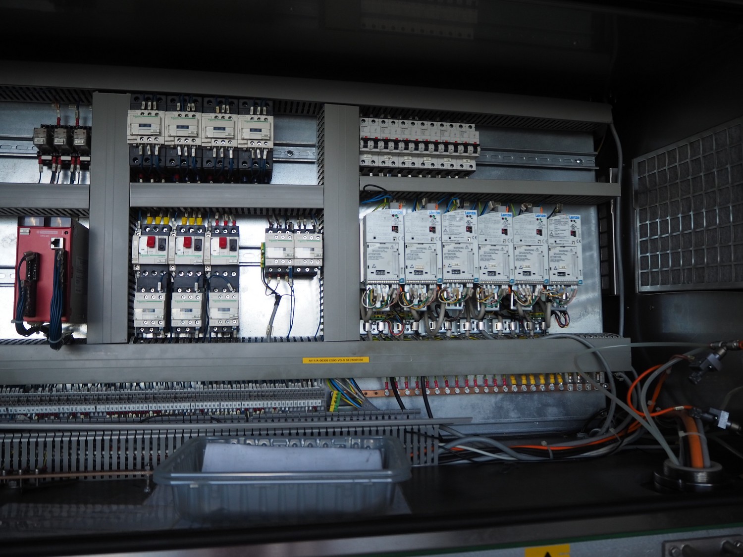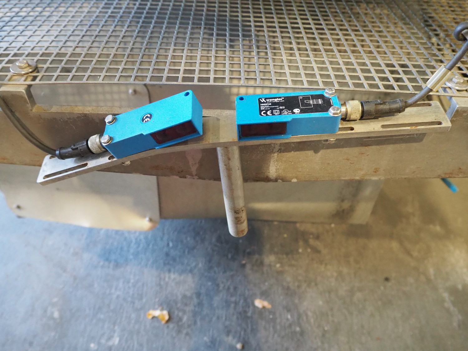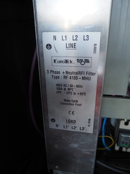 G. Mondini S.p.a. traysealer, model: E 590 VGS, serial number: A/11/A-00309, year of construction: 08/2011, 415 V, 3 Ph, 50 Hz, dyes: (8x) 220 mm x 125 mm, plastic belt, belt width: 480 mm, film width: 460 mm, clearance: 600 mm x 250 mm, total dimensions: 4200 mm x 1200 mm x 2540 mm.