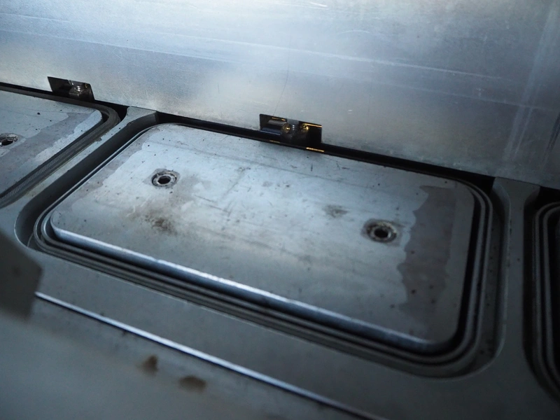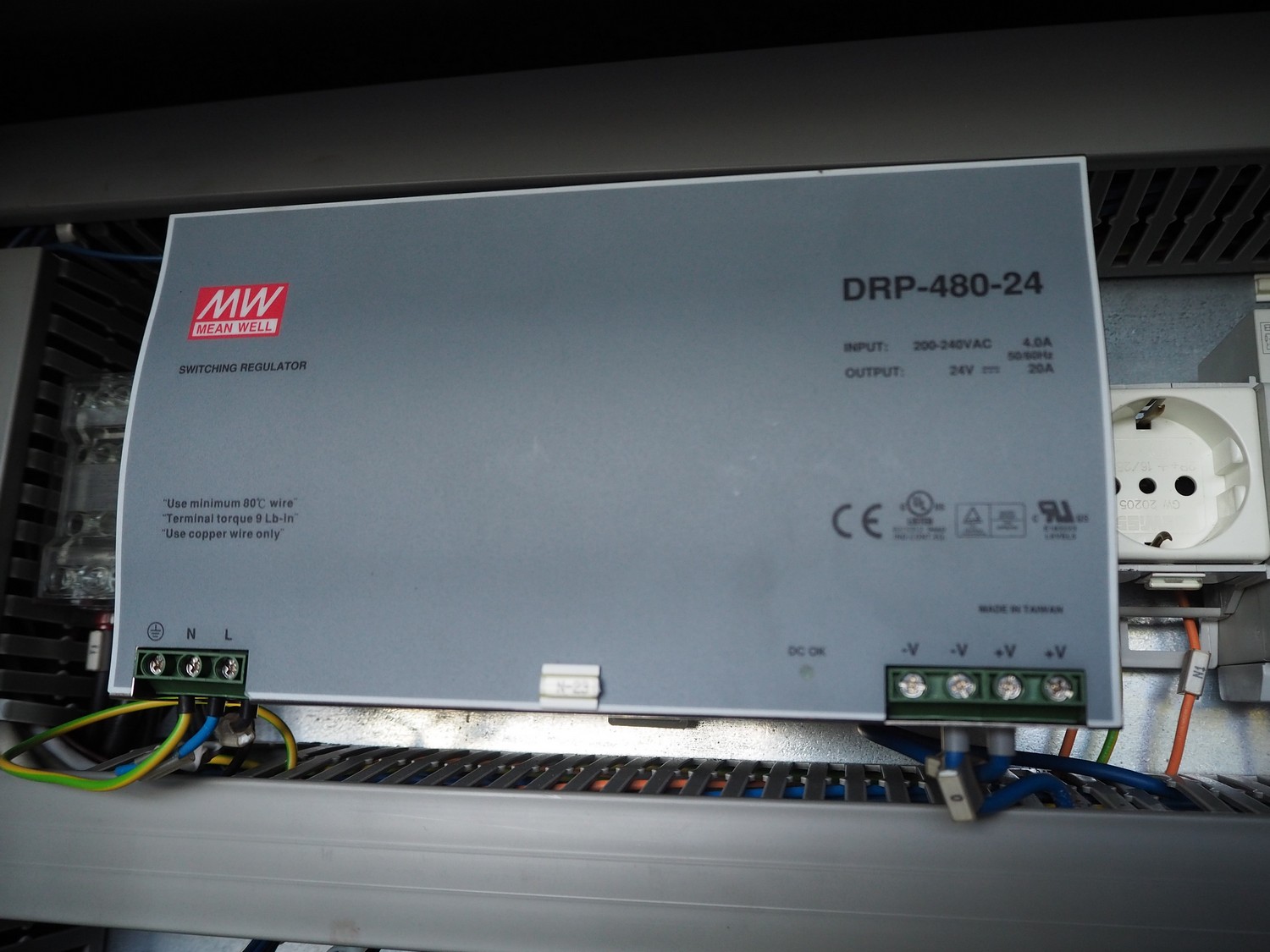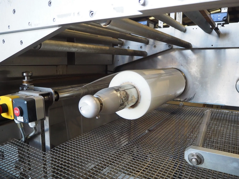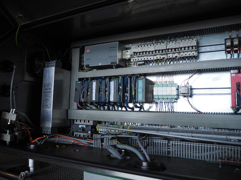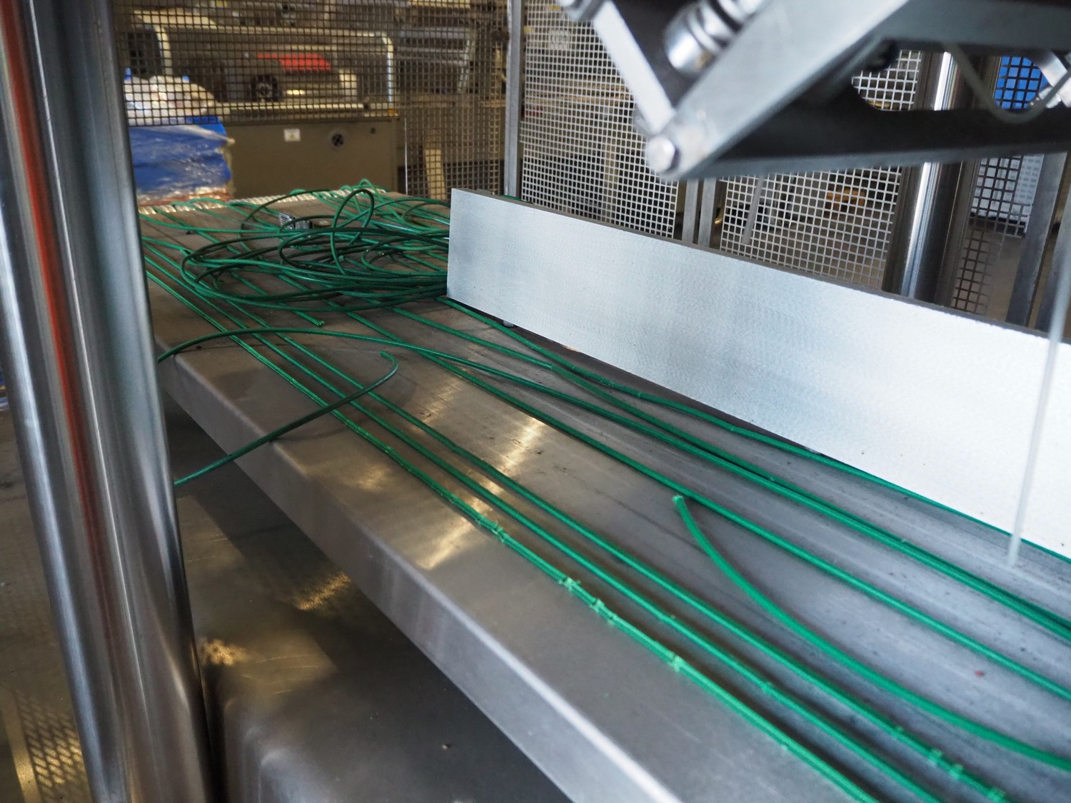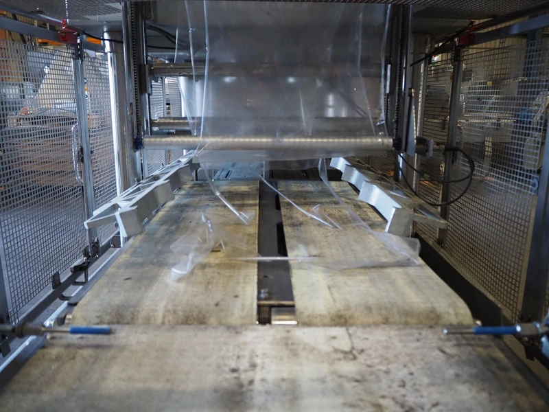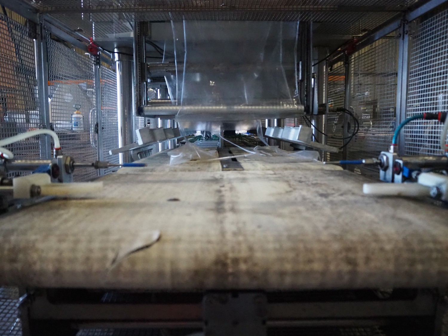 G. Mondini S.p.a. traysealer, model: E 590 VGS, serial number: A/11/A-00309, year of construction: 08/2011, 415 V, 3 Ph, 50 Hz, dyes: (8x) 220 mm x 125 mm, plastic belt, belt width: 480 mm, film width: 460 mm, clearance: 600 mm x 250 mm, total dimensions: 4200 mm x 1200 mm x 2540 mm.