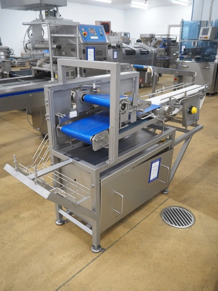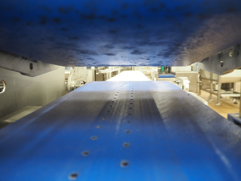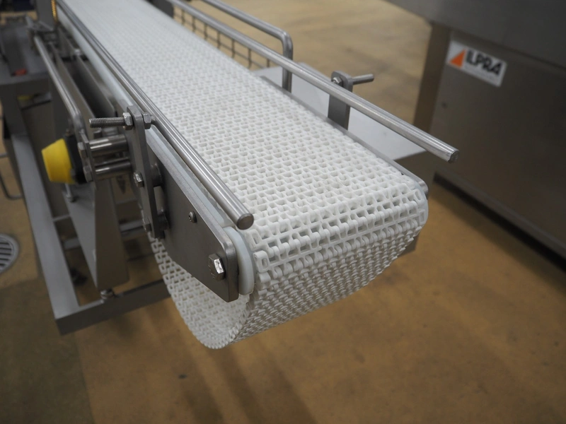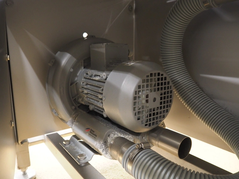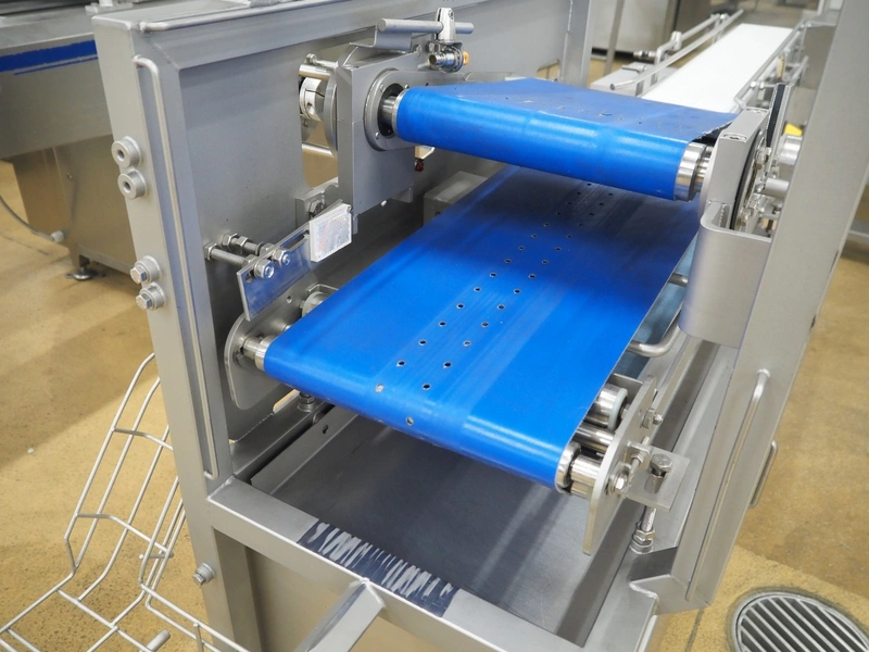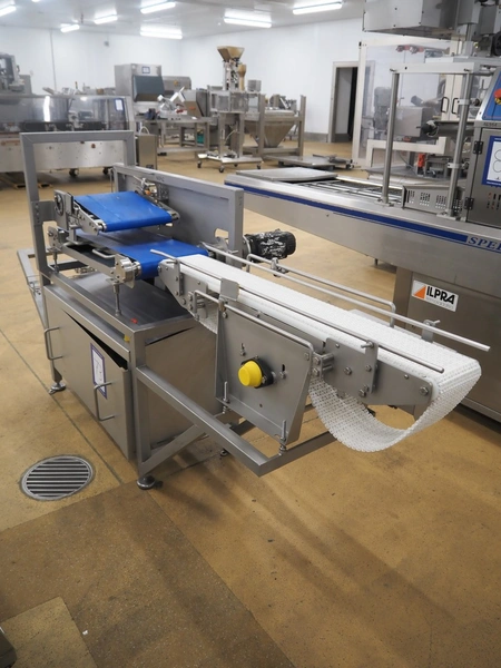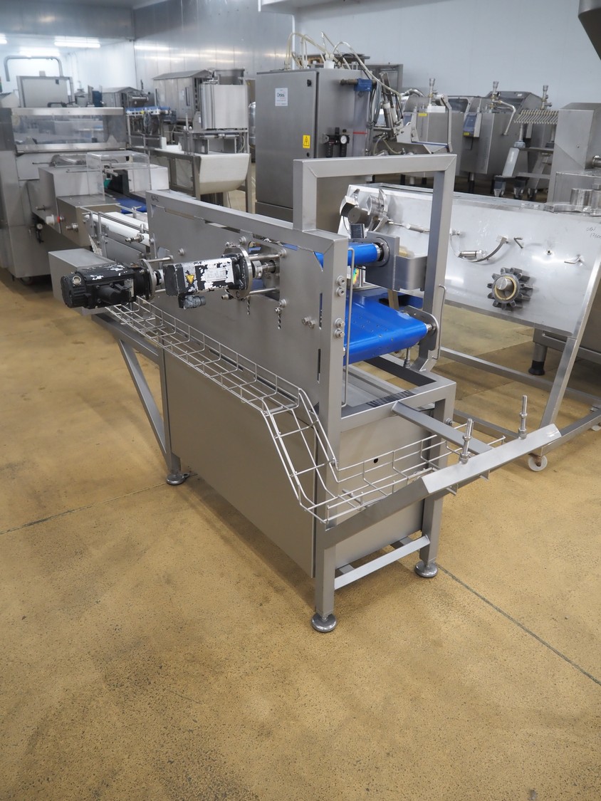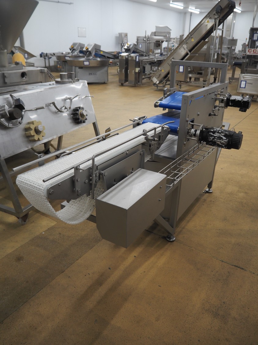 Infeed belt for traysealer with s/s frame and plastic belt with and without perforations, belt width: (2x) 280 mm, plastic mesh belt, belt width: 150 mm, with Rietschle side channel vacuum pump, total dimensions: 2400 mm x 900 mm x 1250 mm.