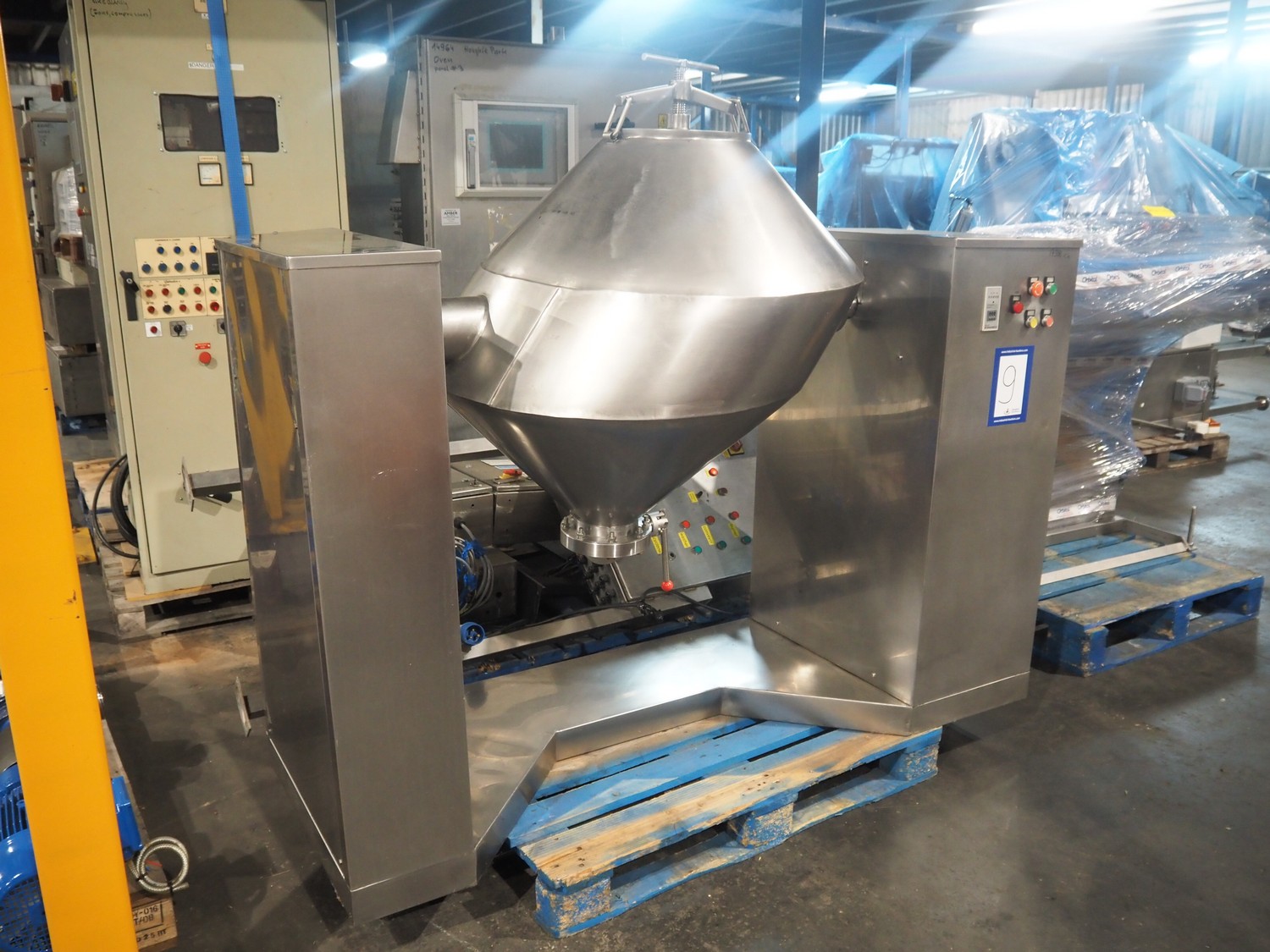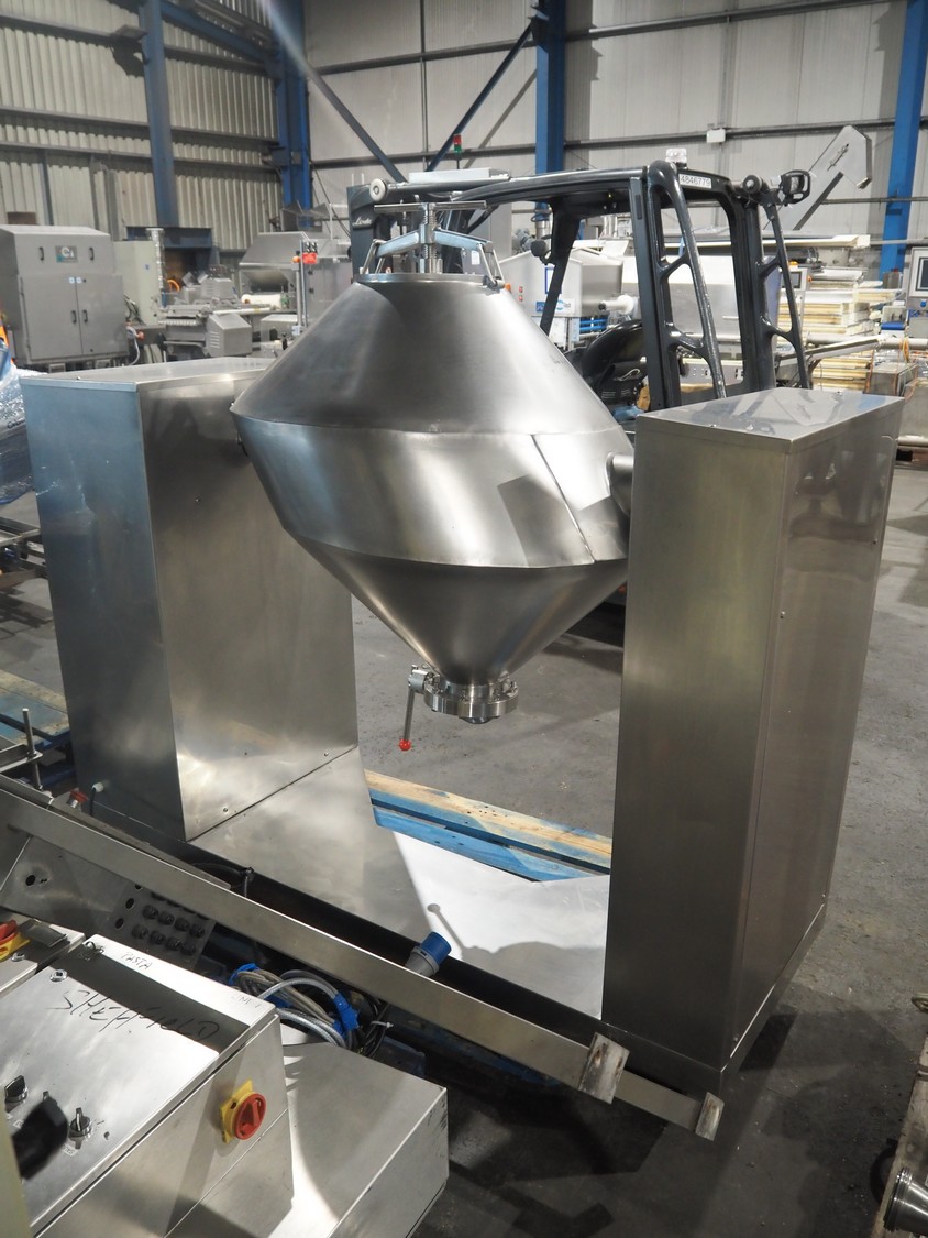 S/s tumbler, dimensions drum: Ø 800 mm x 1000 mm, total dimensions: 2000 mm x 700 mm x 1800 mm.