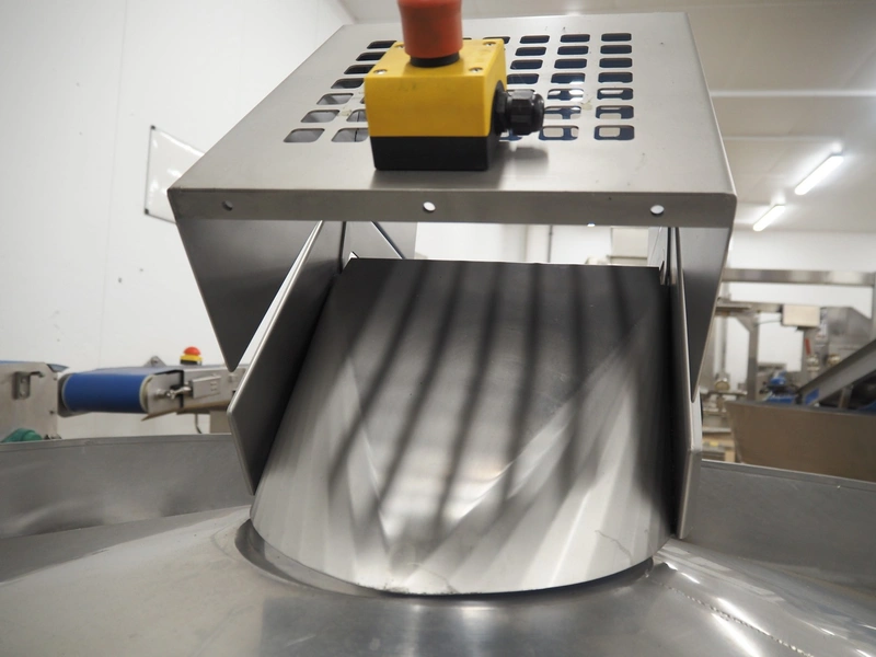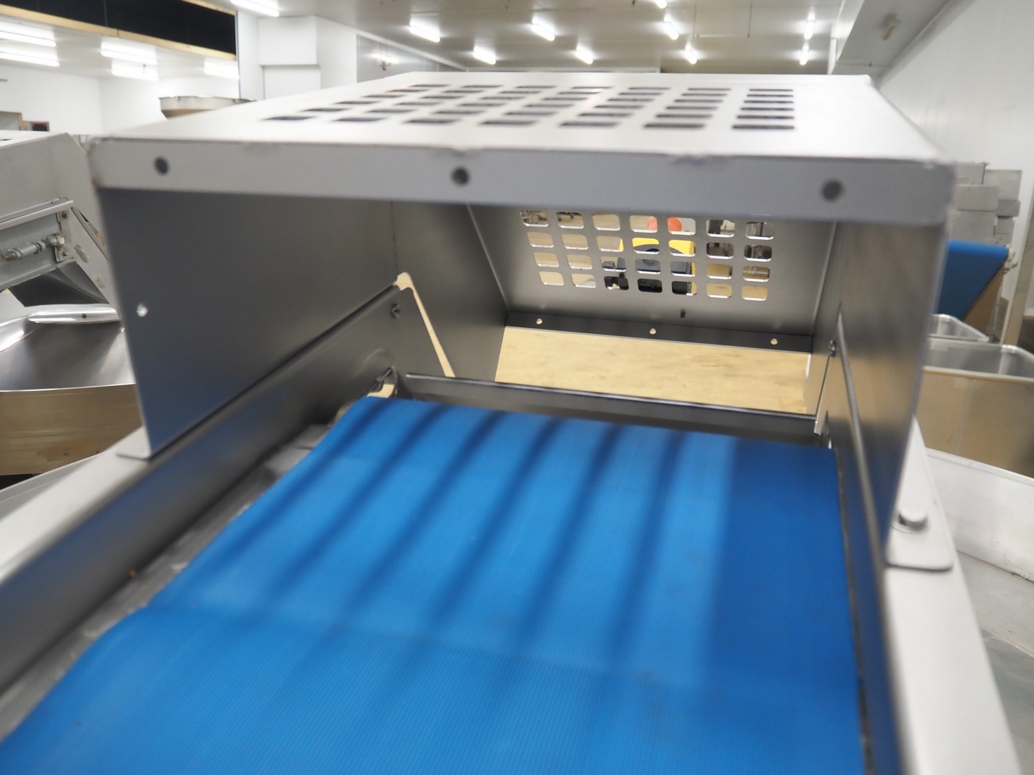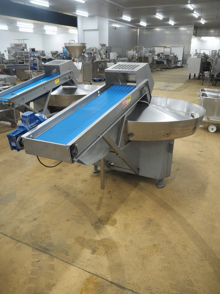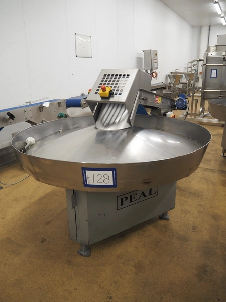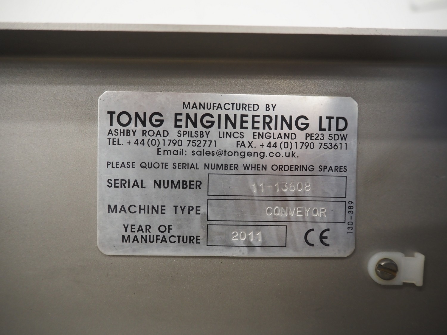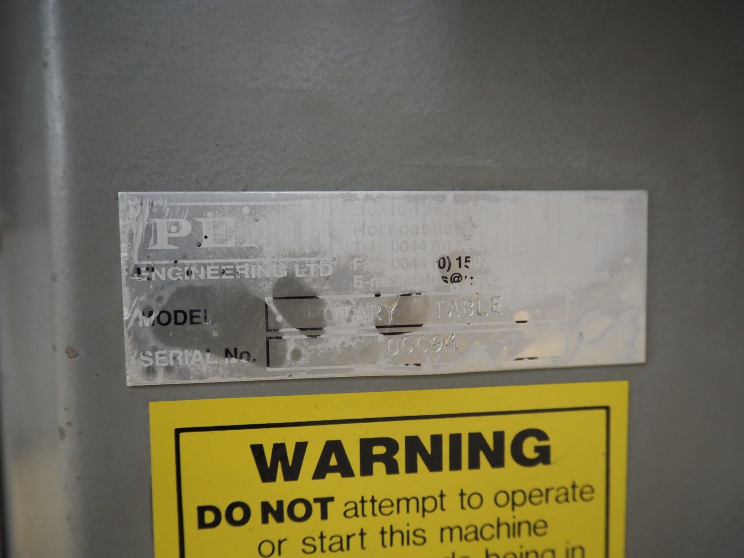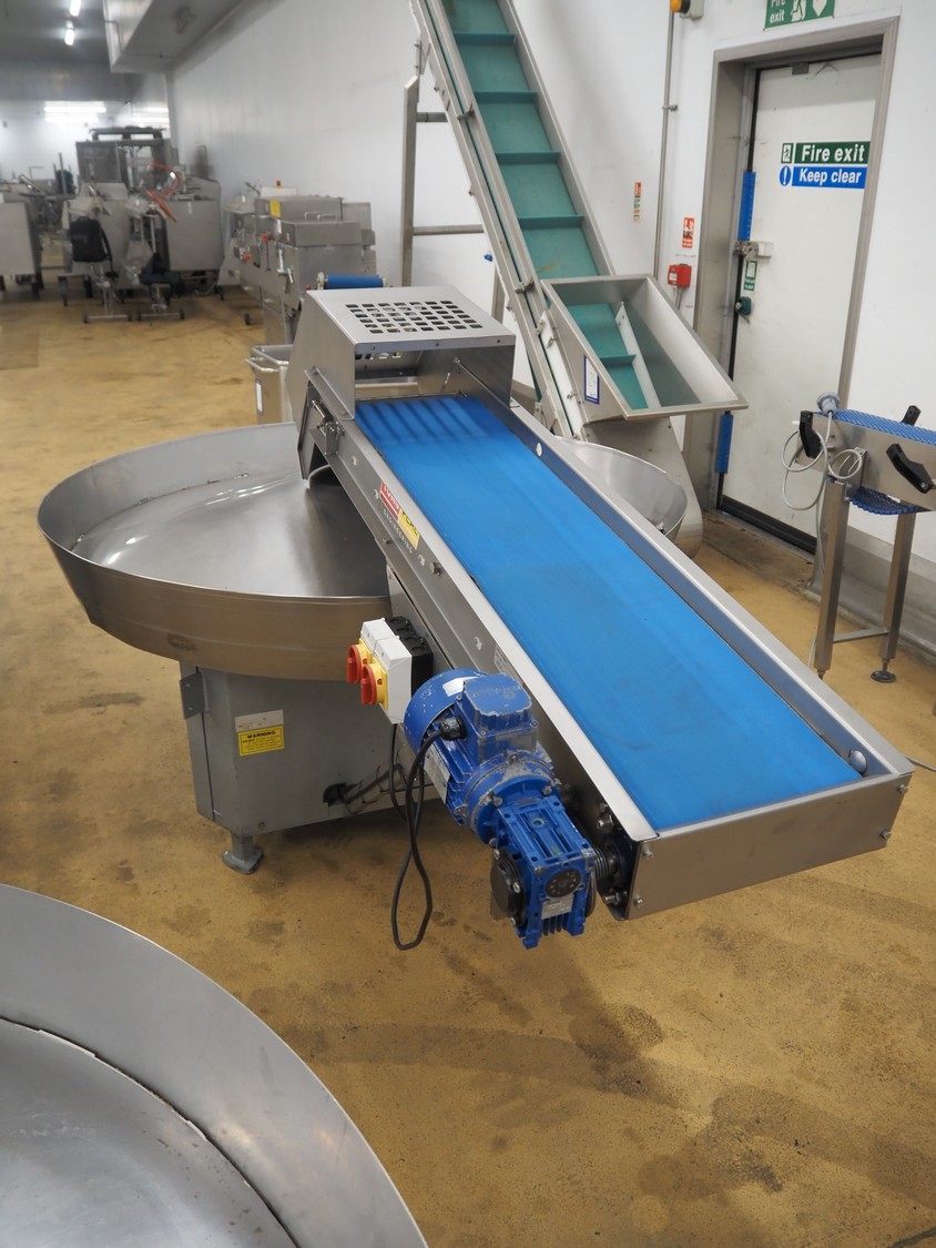 Peal Engineering LTD turning table with Tong Engineering LTD infeed belt, turning table model: Rotary Table, serial number: 00094, infeed belt type: Conveyor, serial number: 11-13608, year of construction: 2011, plastic belt, belt width: 300 mm, clearance: 330 mm x 190 mm, diameter table: 1550 mm, total dimensions: 2500 mm x 1600 mm x 1360 mm.