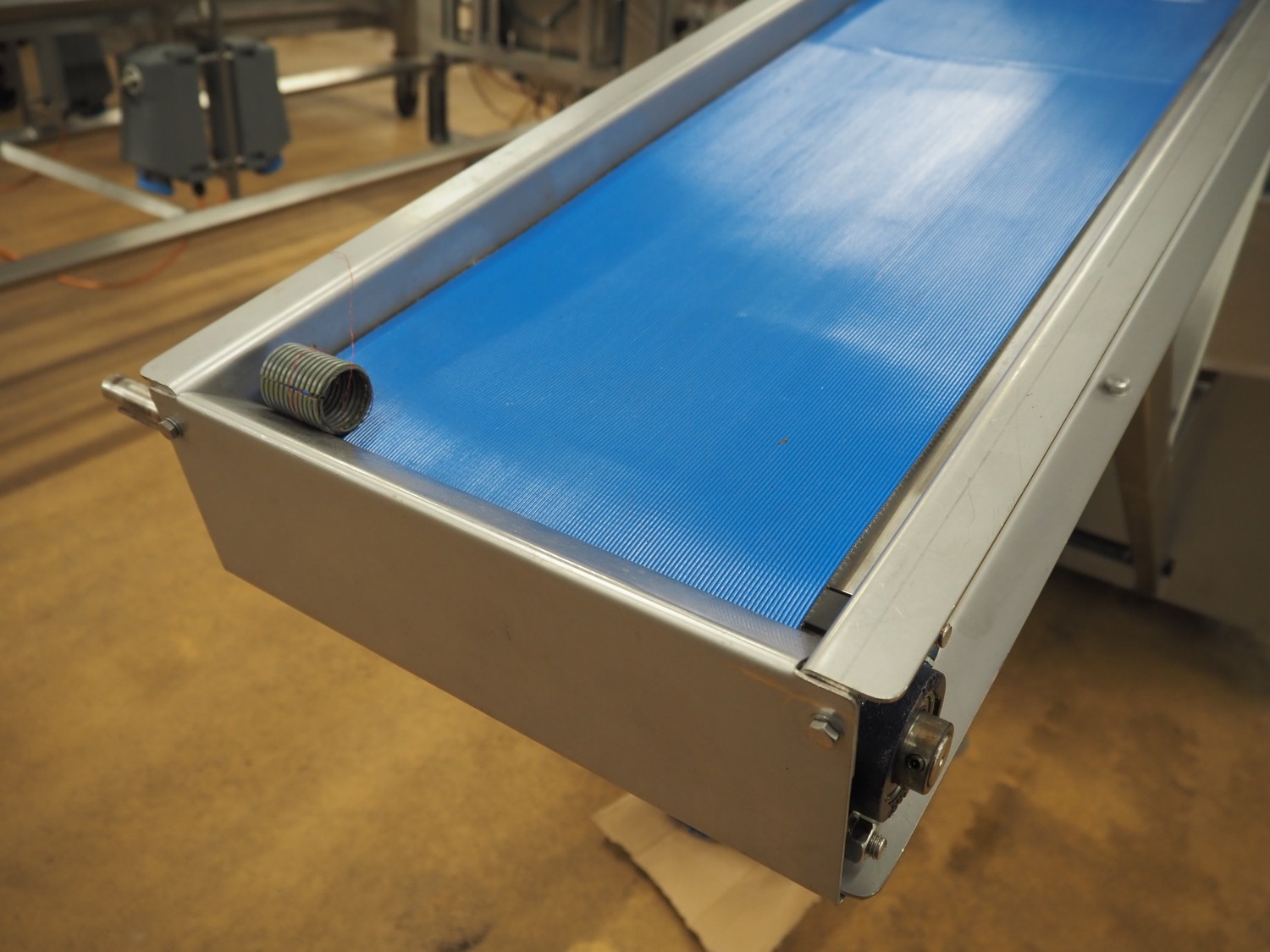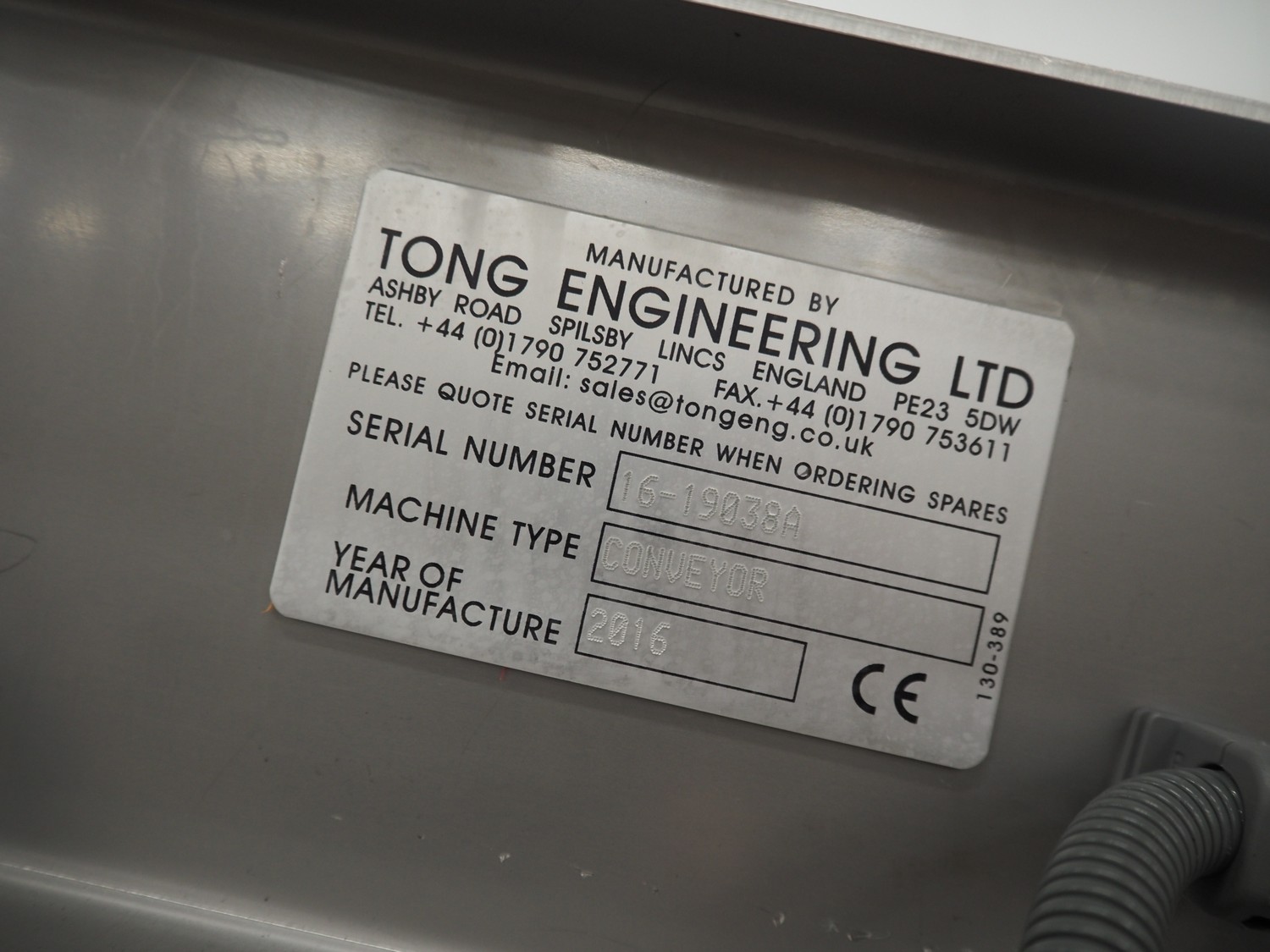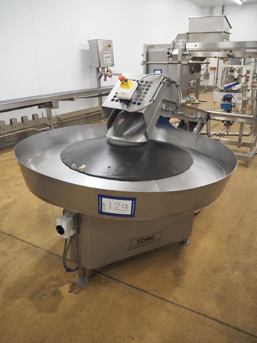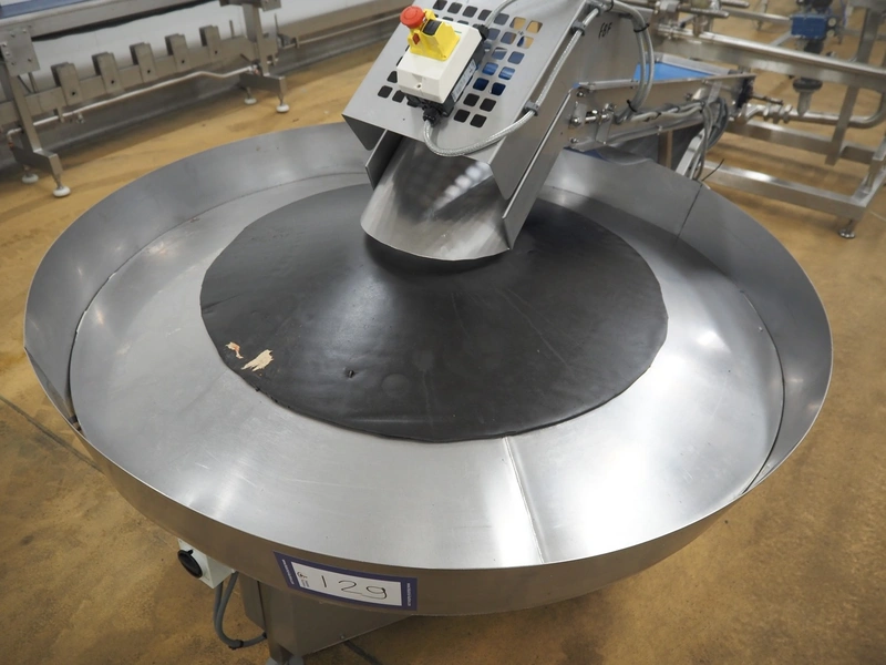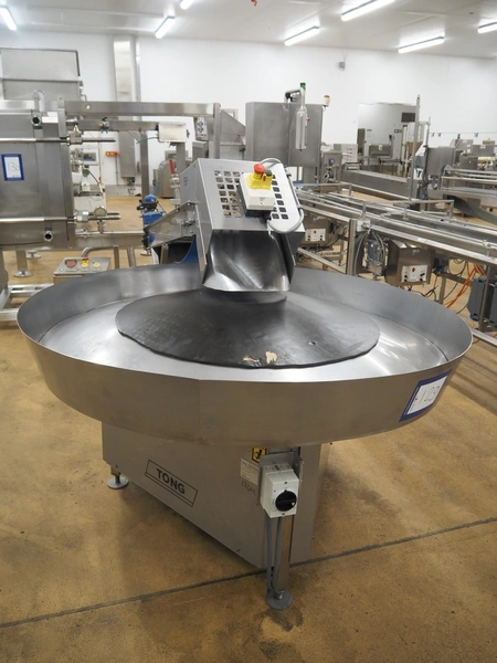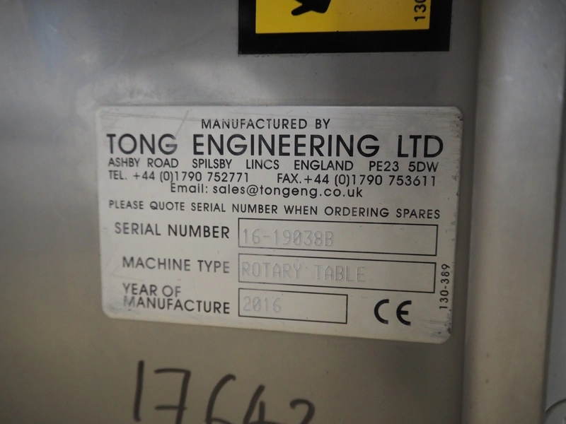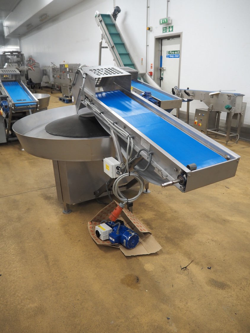 Peal Engineering LTD turning table with Tong Engineering LTD infeed belt, turning table model: Rotary Table, serial number: 16-19038B, year of construction: 2016, infeed belt type: Conveyor, serial number: 16-19038A, year of construction: 2016, plastic belt, belt width: 300 mm, clearance: 330 mm x 190 mm, diameter table: 1550 mm, total dimensions: 2500 mm x 1600 mm x 1360 mm.