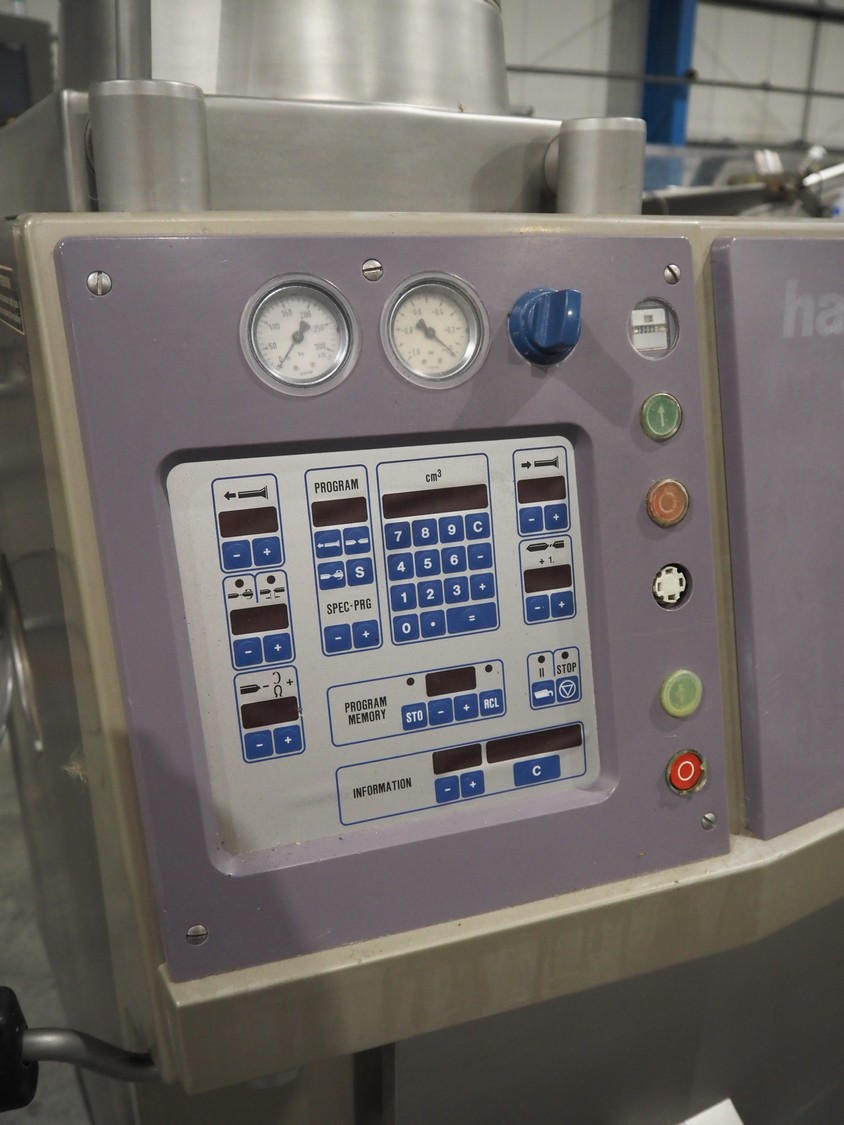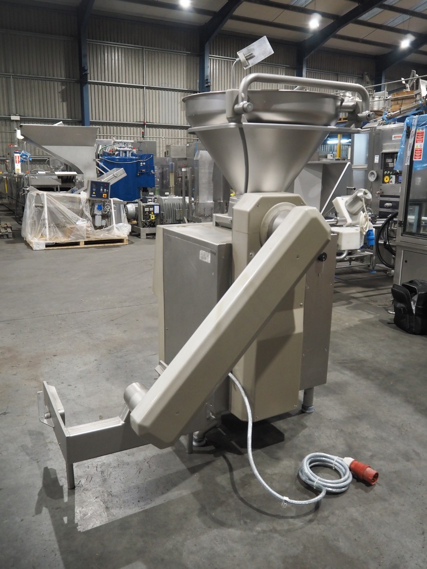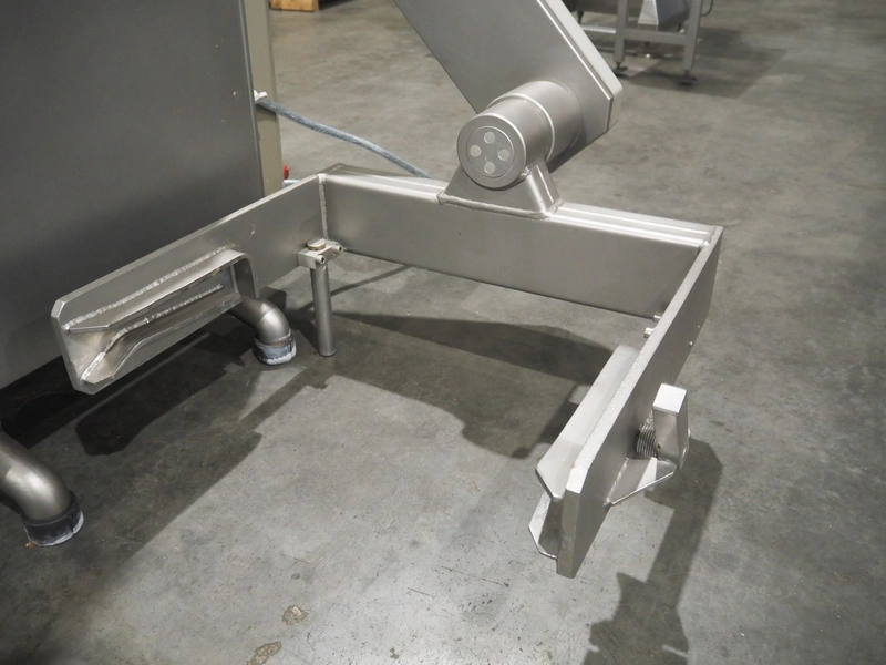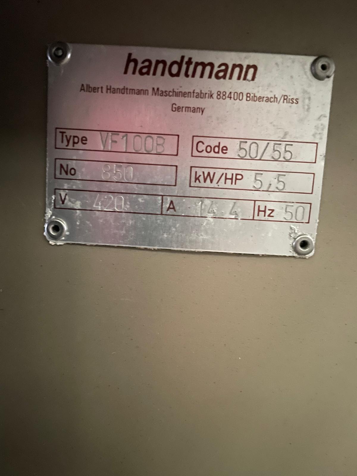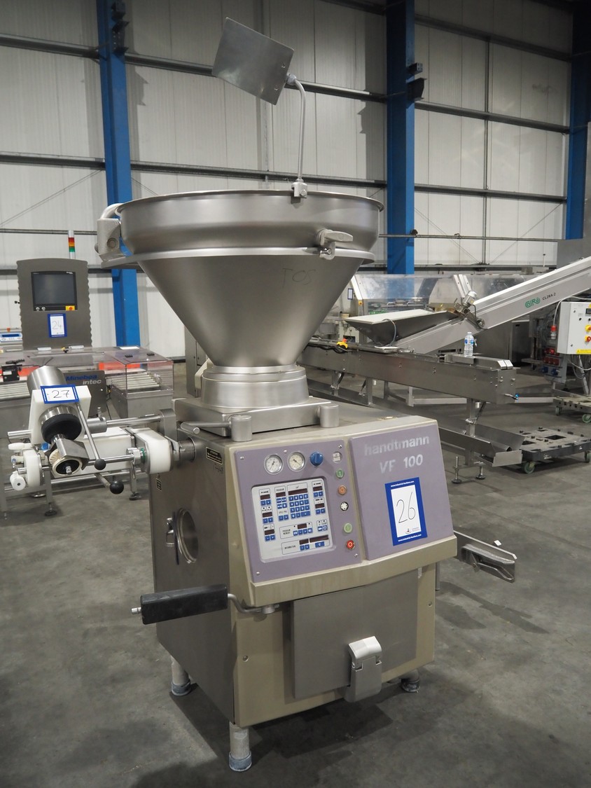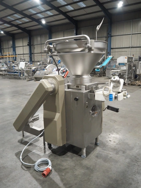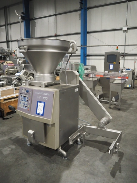 Handtmann vacuum filling machine with lifter for 200 liter meat bins, type: VF100, number: 850, 420 V, 50 Hz, 14.4 A, 5.5 kW, dimensions: 1880 mm x 1200 mm x 2280 mm.