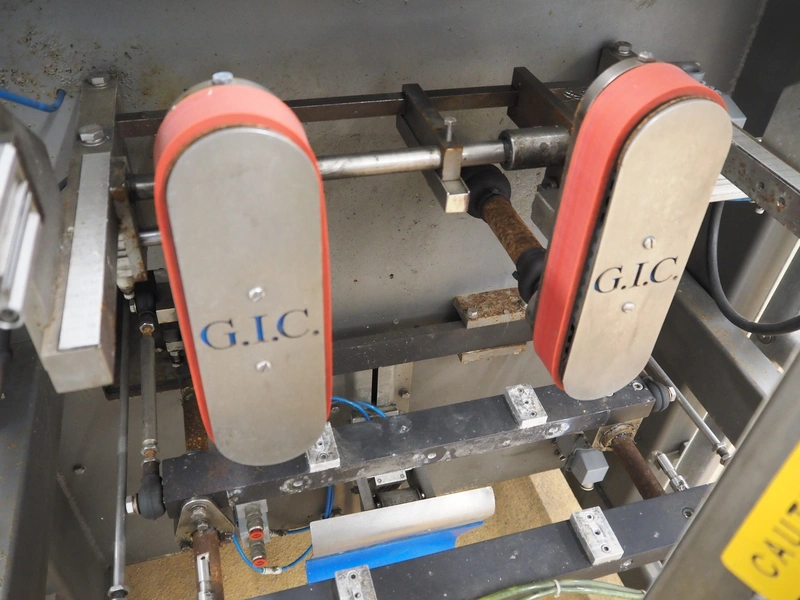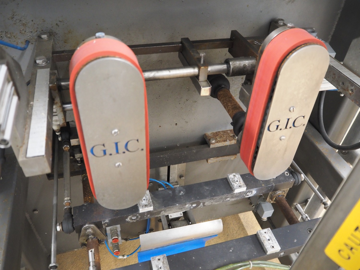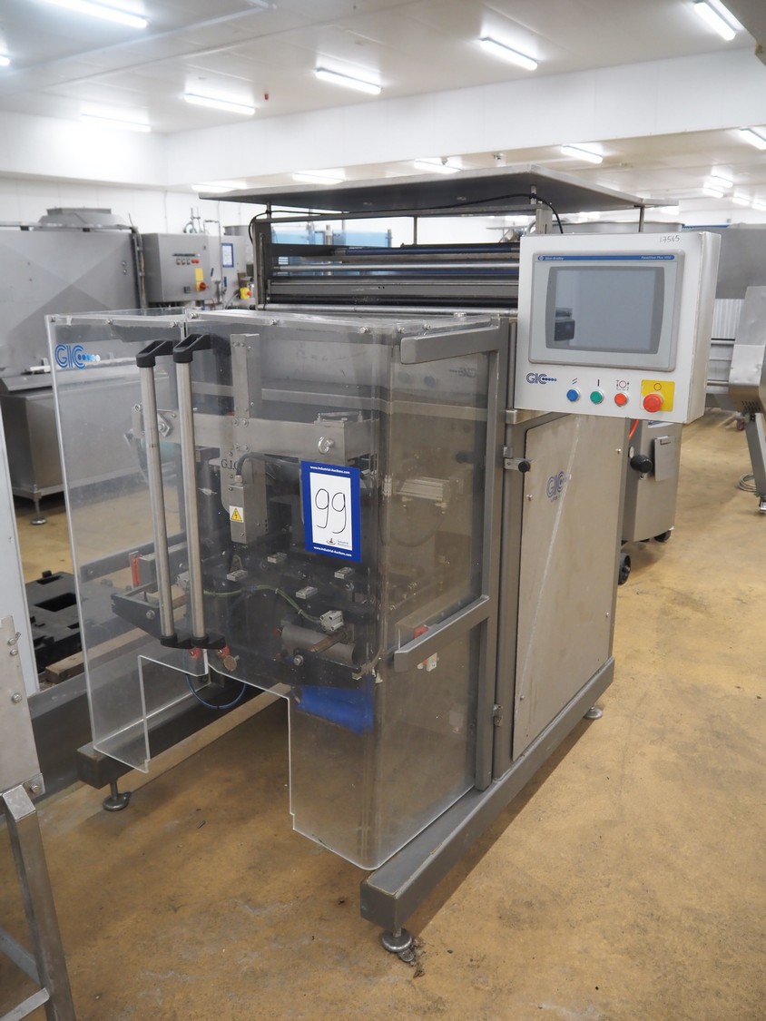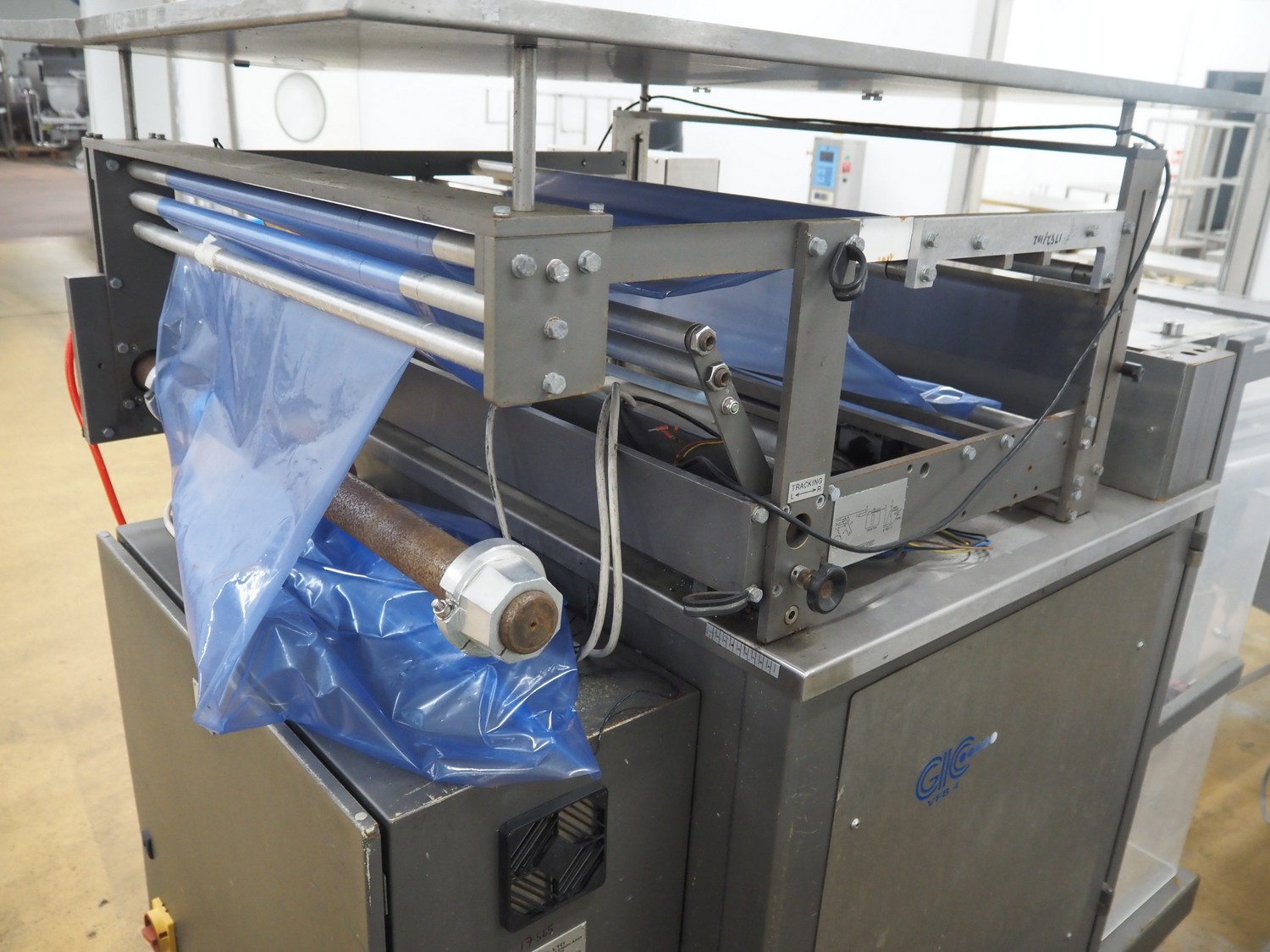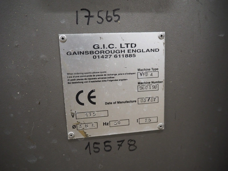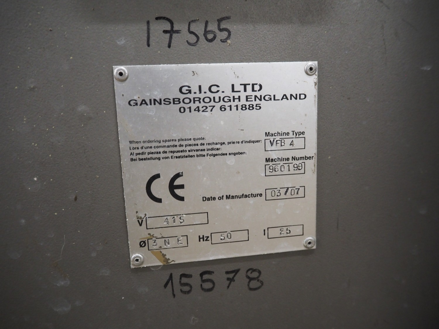 G.I.C. LTD vertical bag form-, and seal machine, type: VFB 4, machine number: 960199, year of construction: 03/07, 415 V, 3 Ph, 50 Hz, vertical seal length: 460 mm, film width: 625 mm, total dimensions: 1900 mm x 1500 mm x 1750 mm. Incomplete.
