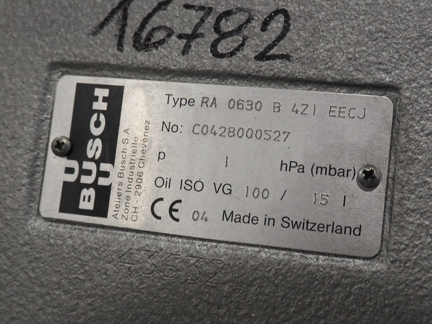 Busch vacuum pump, type: RA 0630 B 4ZI EECJ, serial number: C0428000527, year of construction: 2004, capacity: 630 m³/h, dimensions: 1770 mm x 1050 mm x 1650 mm.