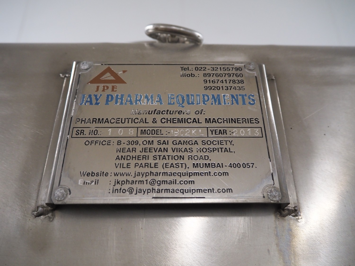 Jay Pharma Equipments mobile s/s tank, model: IBC2KL, serial number: 108, year of construction: 2013, dimensions: 1520 mm x 1380 mm x 2100 mm.