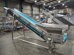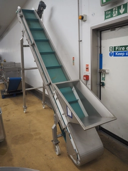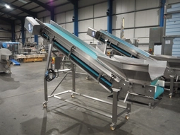 Mobile elevating belt with infeed bunker, s/s frame, infeed clearance: 750 mm x 450 mm, plastic belt with dividers, belt width: 360…0 bidsLot is closed -