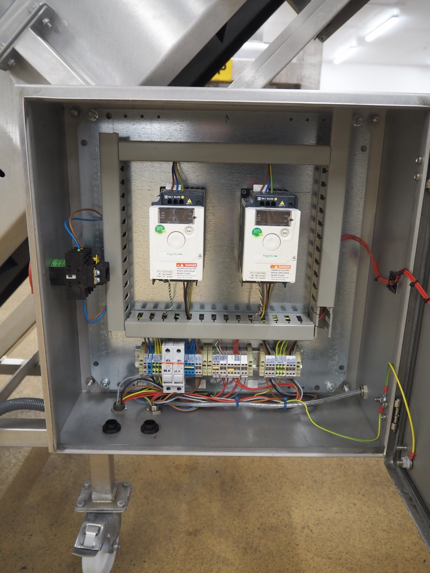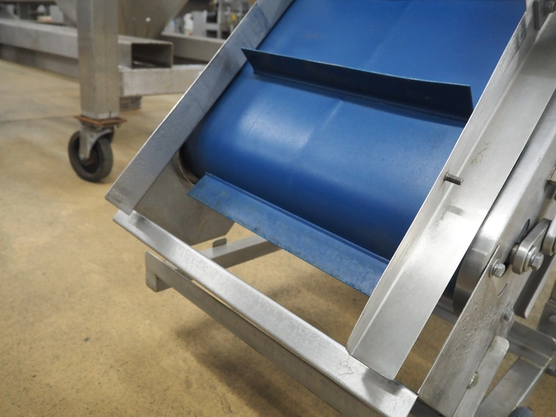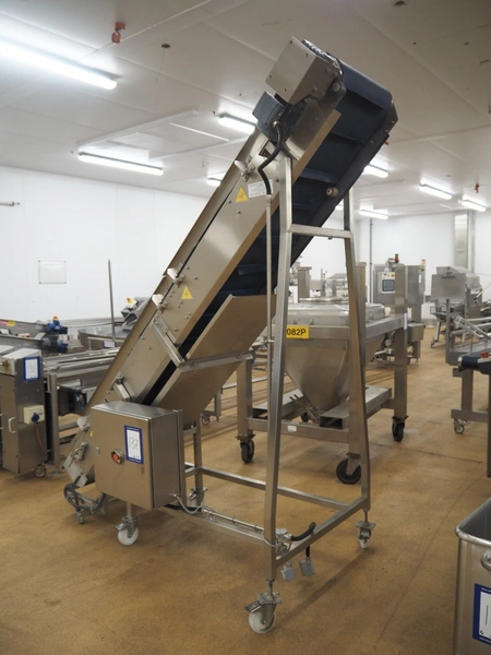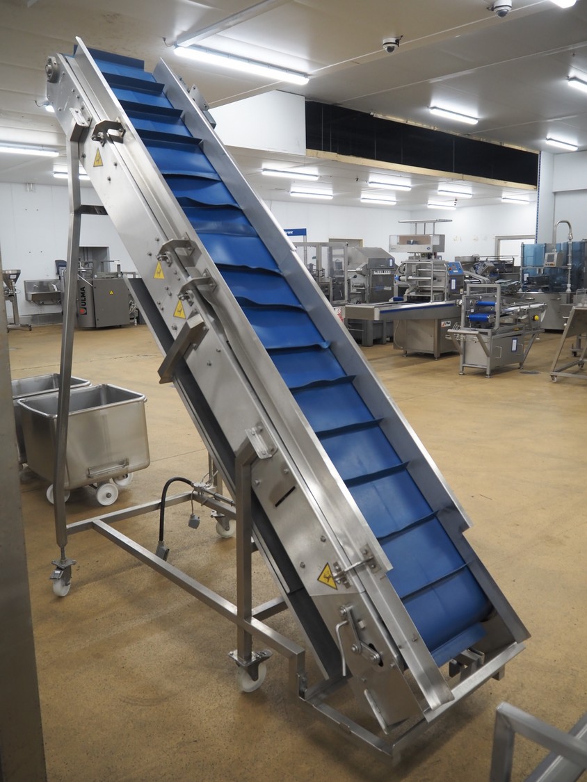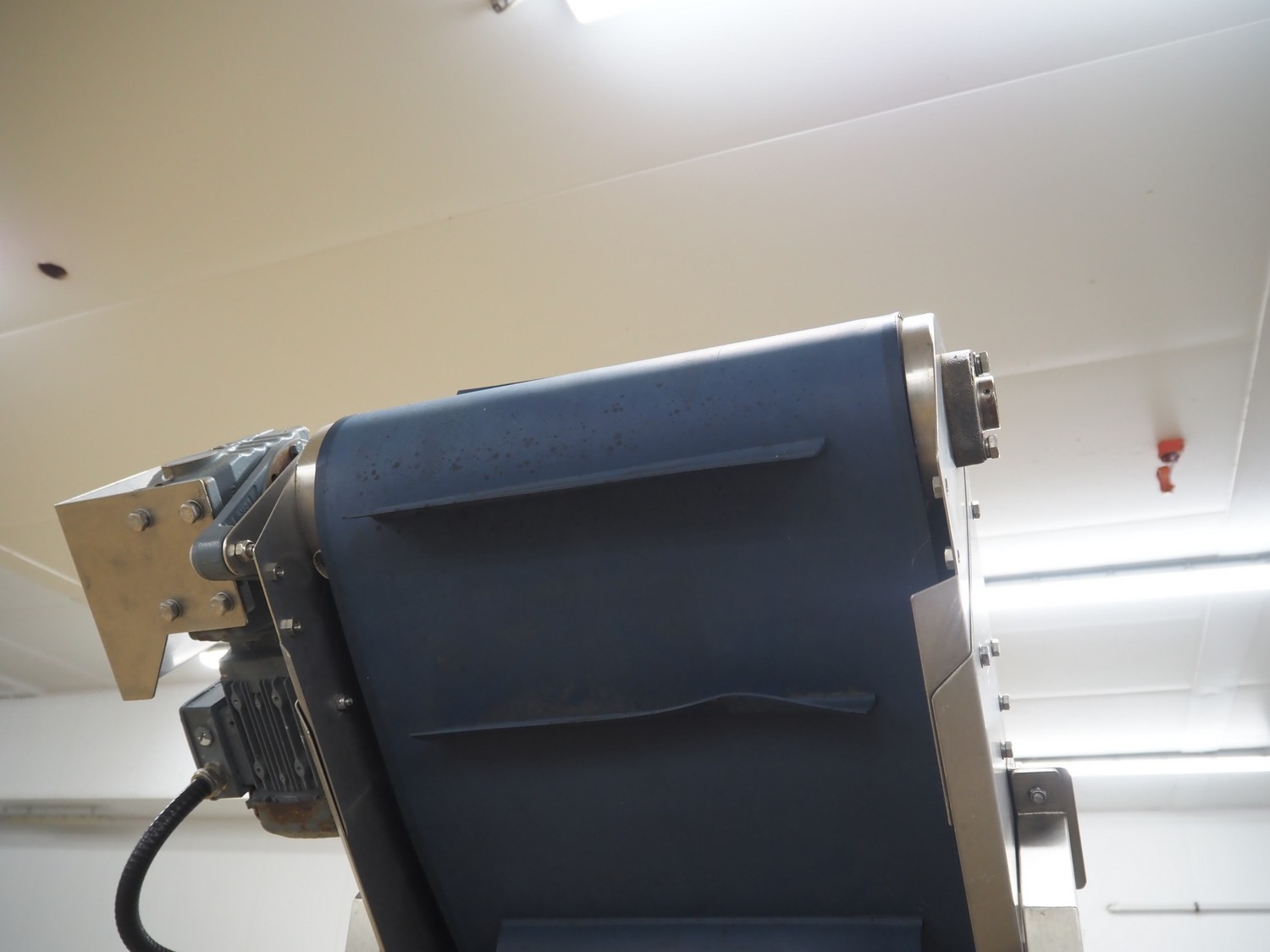 Cotsworld Mechanical Limited mobile elevating belt, serial number: 2282, plastic belt with dividers, belt width: 420 mm, dividers height: 50 mm, distance between dividers: 190 mm, elevating height: 2550 mm, total dimensions: 2400 mm x 1100 mm x 2630 mm.